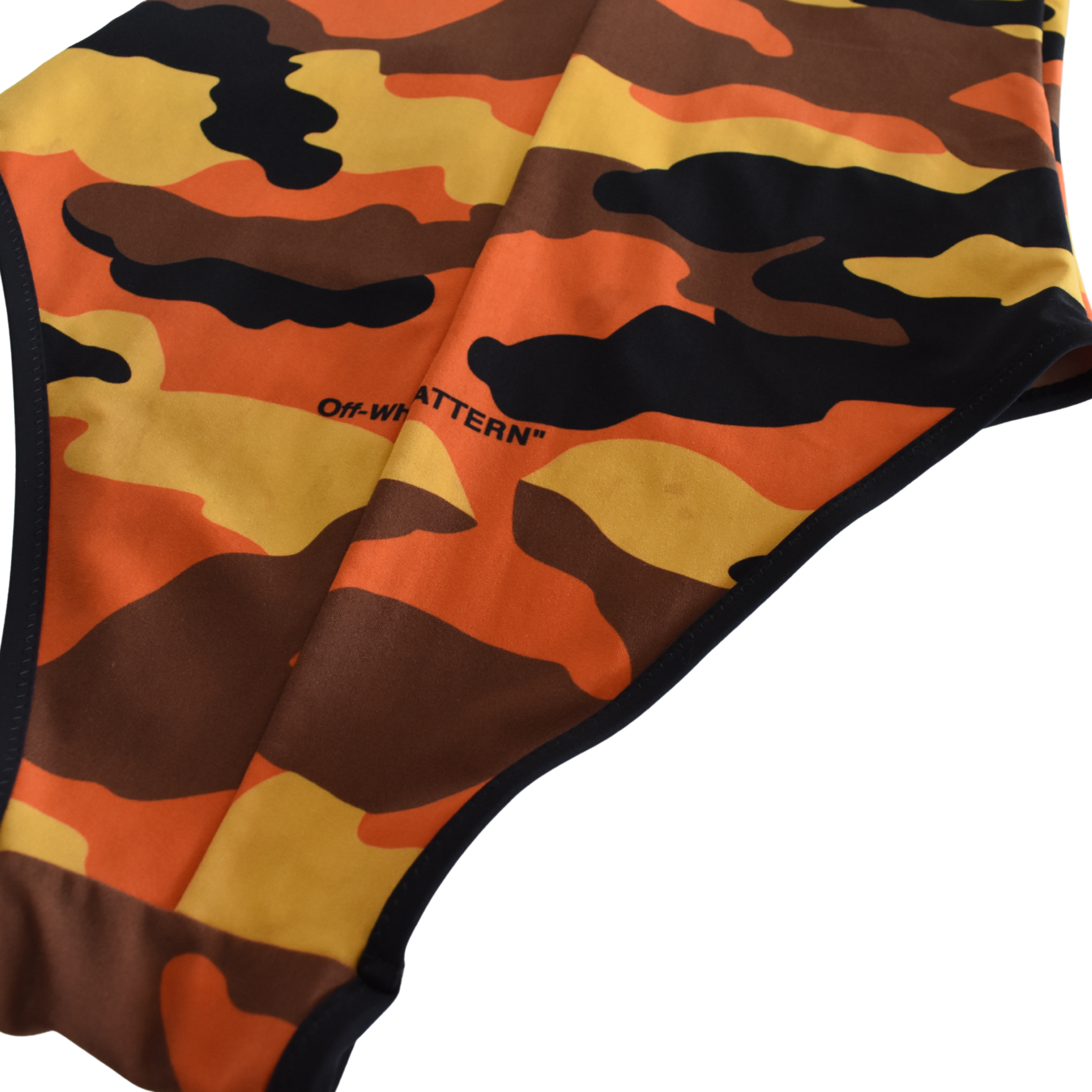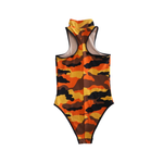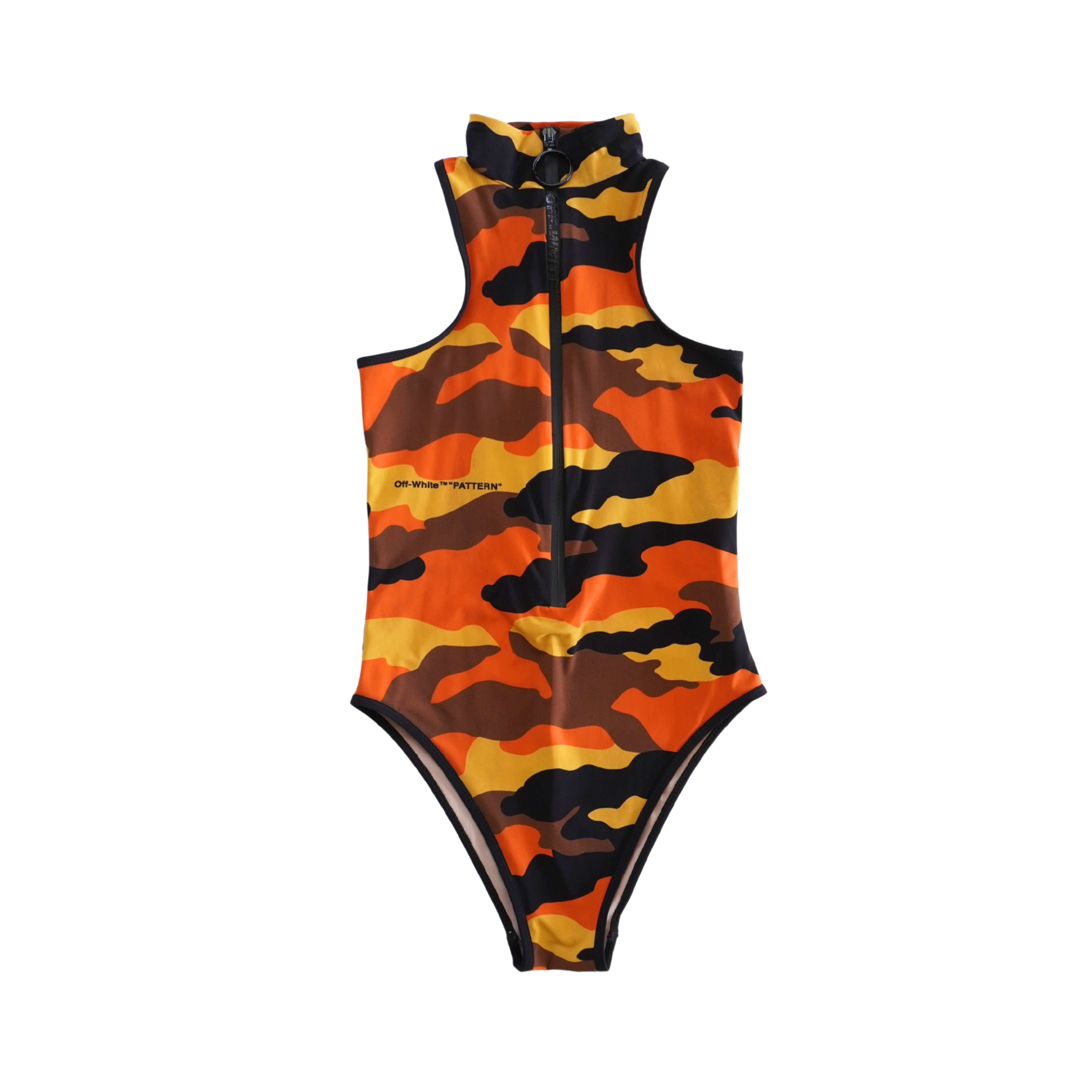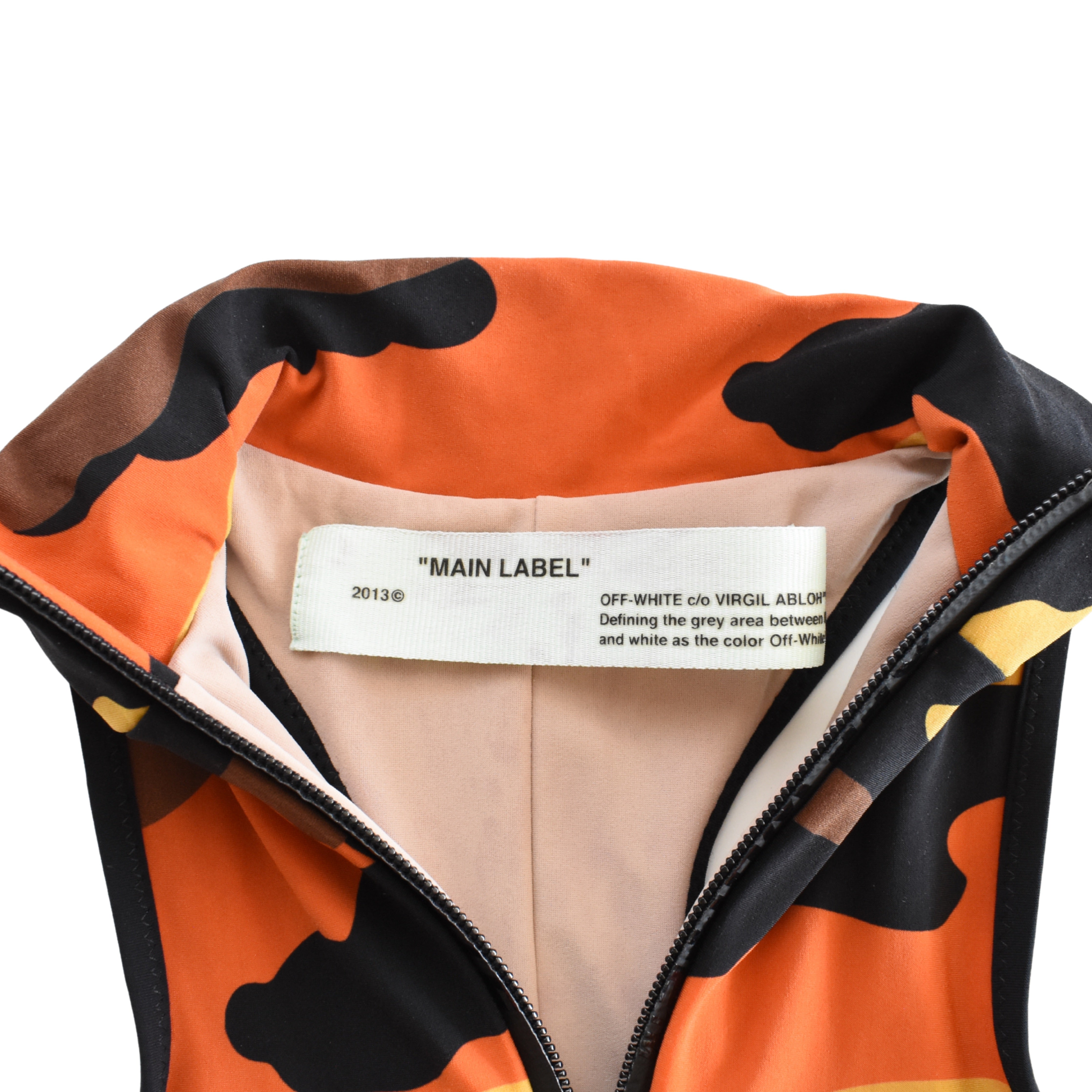 OFF-WHITE bodysuit in orange, black and yellow camo with black trim, a front zip opening in black hardware, and a mock neckline.