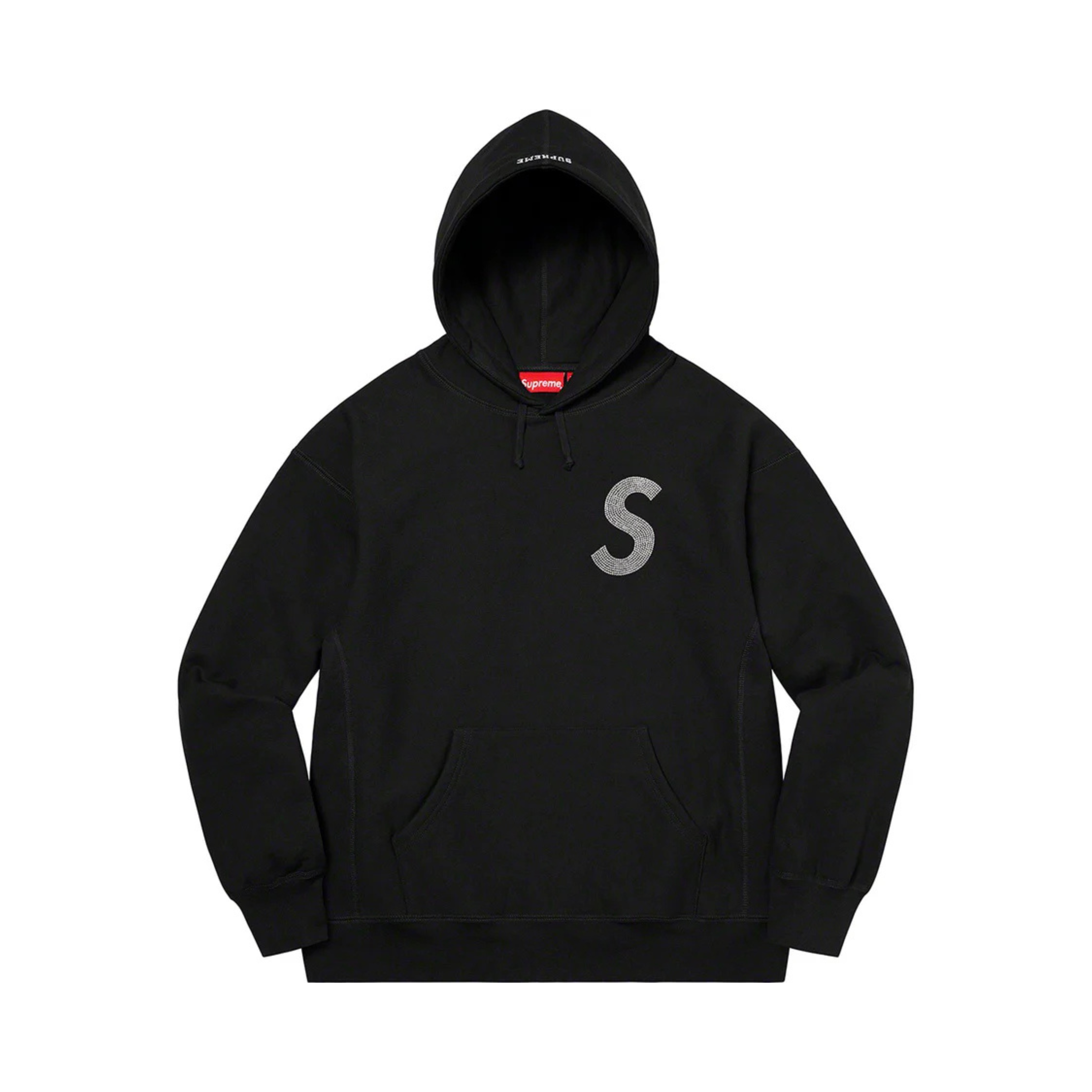 Supreme x Swarovski 'Logo Hooded Sweatshirt' in black cotton with a large crystallized 'S' logo on the chest and a small white embroidered logo on the hood.