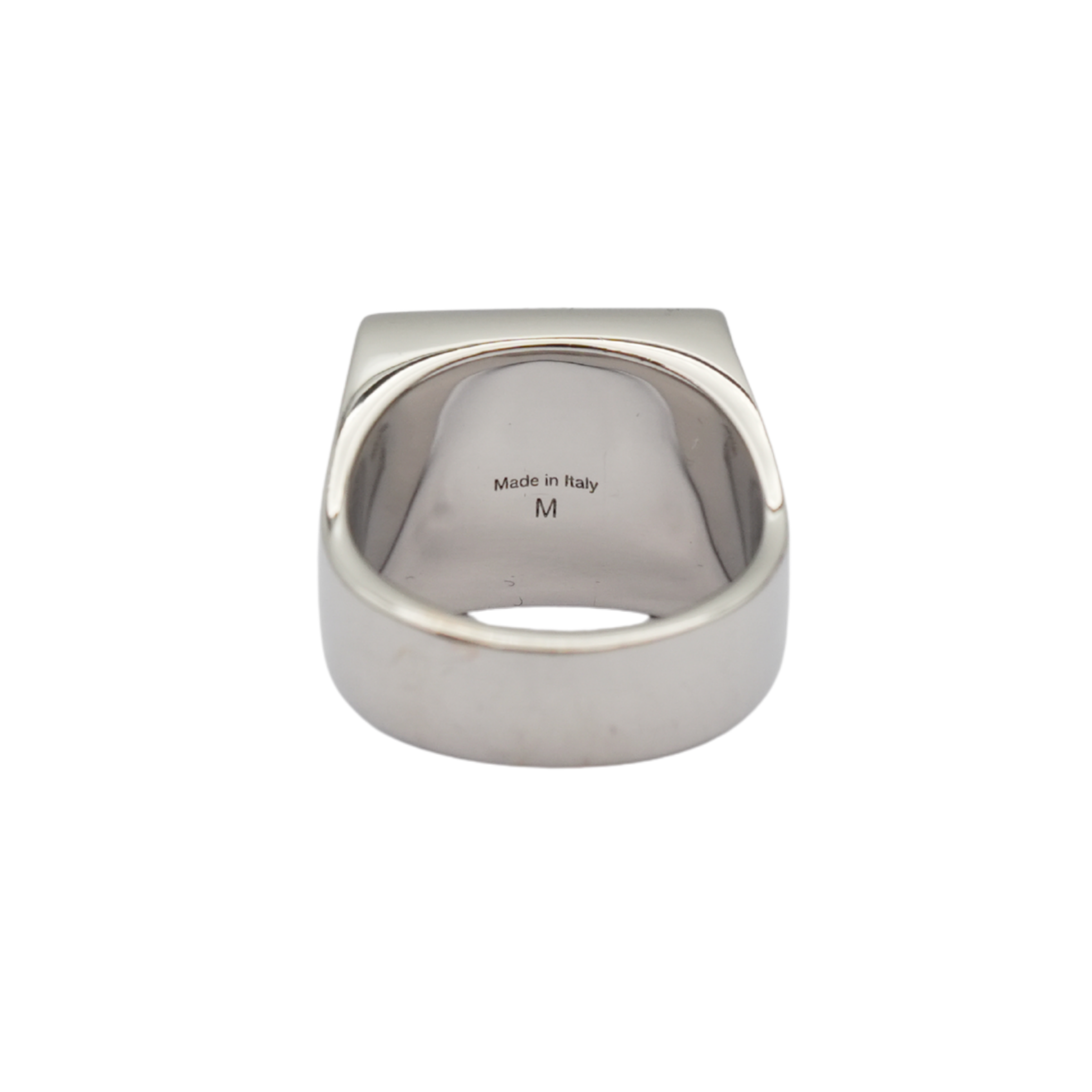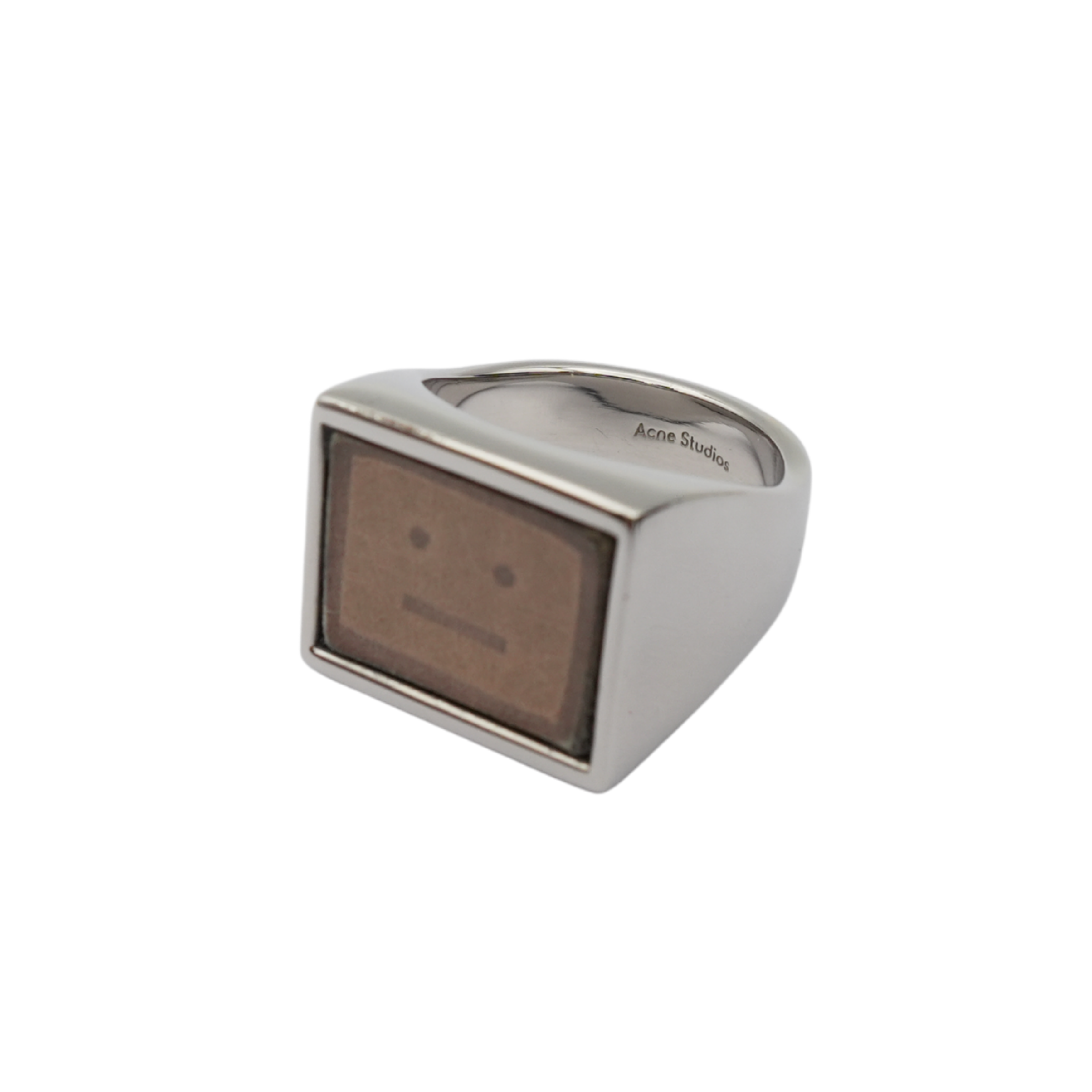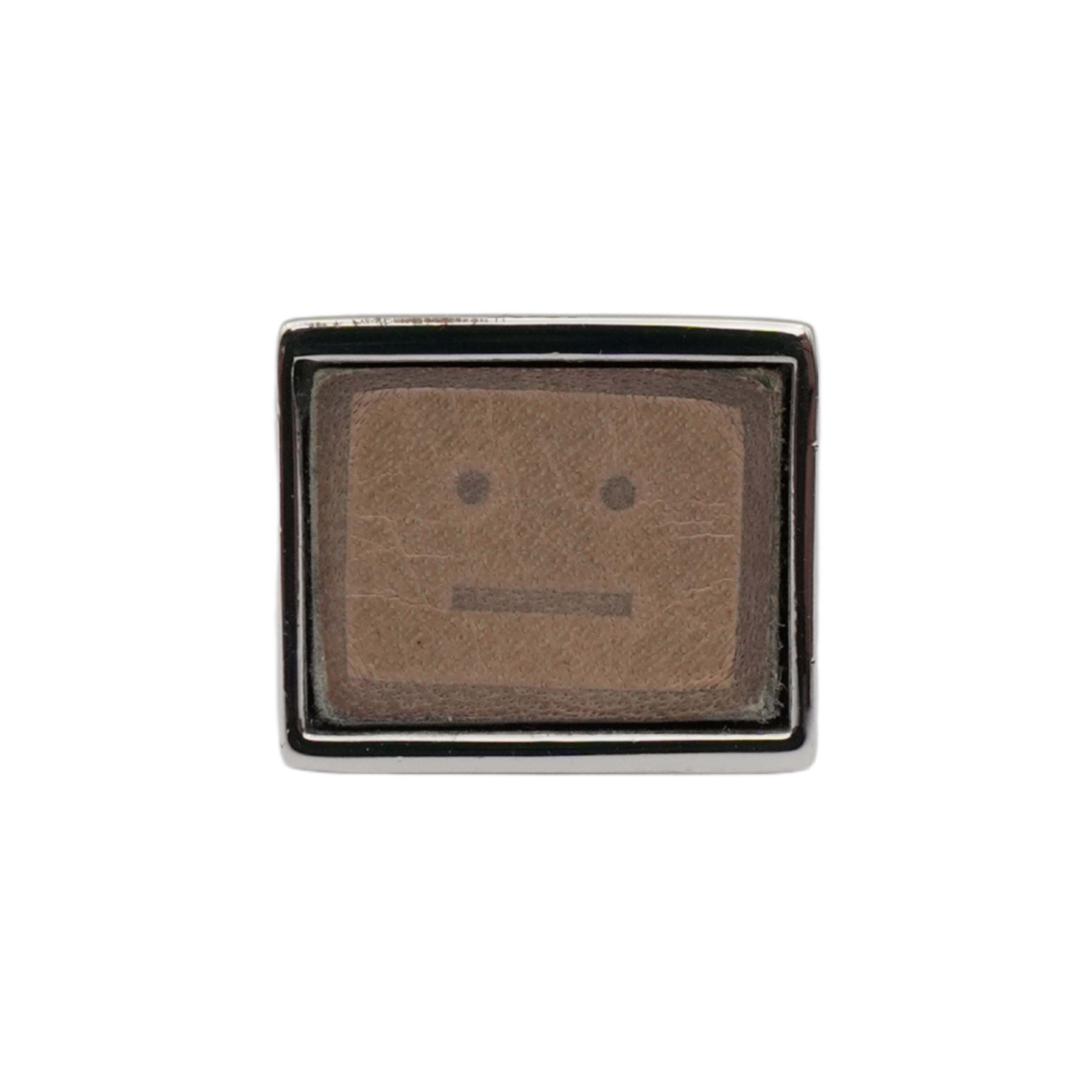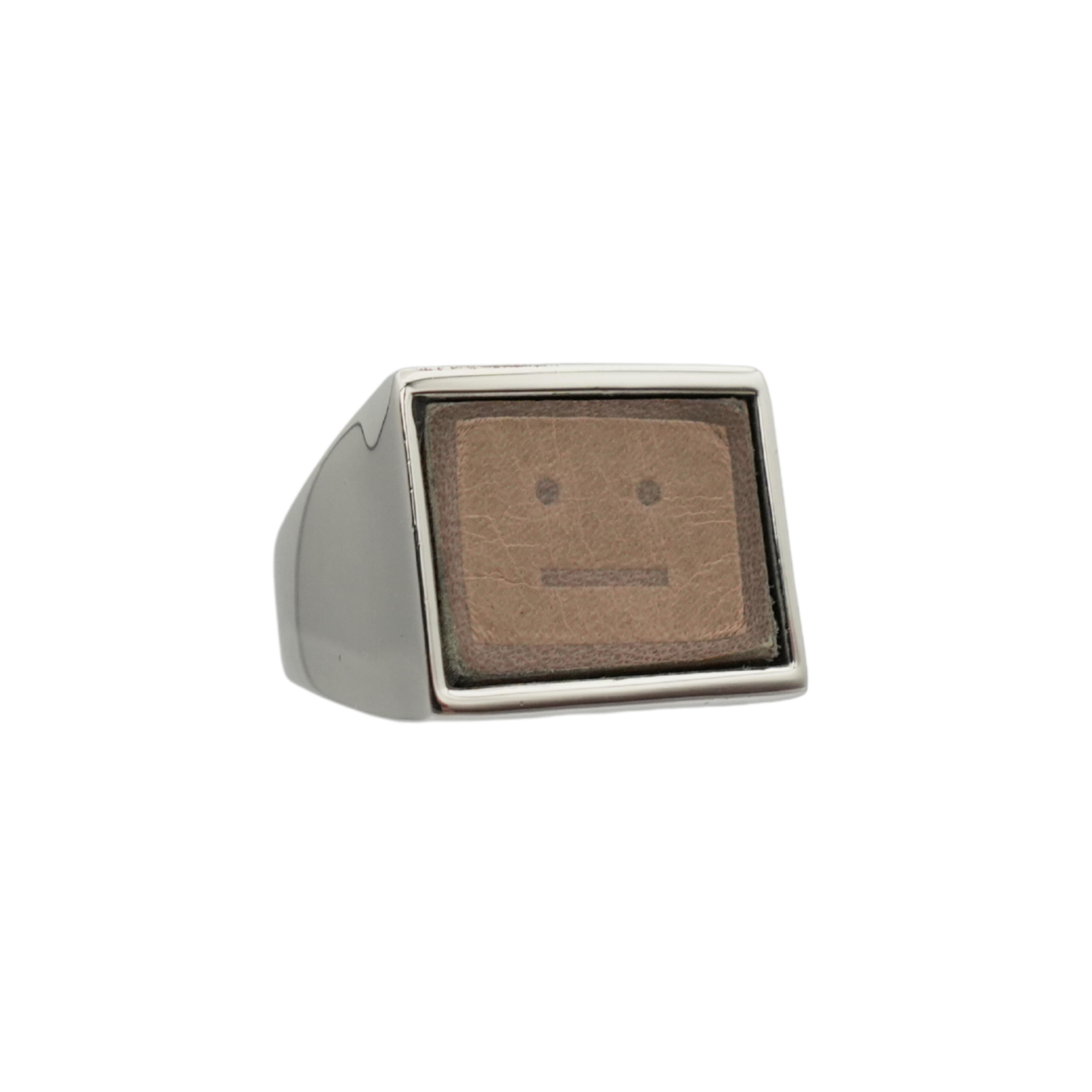 Acne Studios 'Face Logo' ring in silver-toned metal with a beige leather panel in the centre and a signature face graphic.