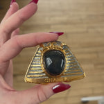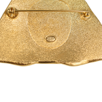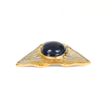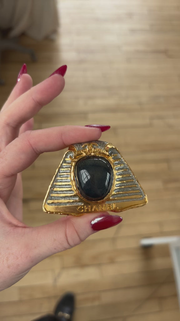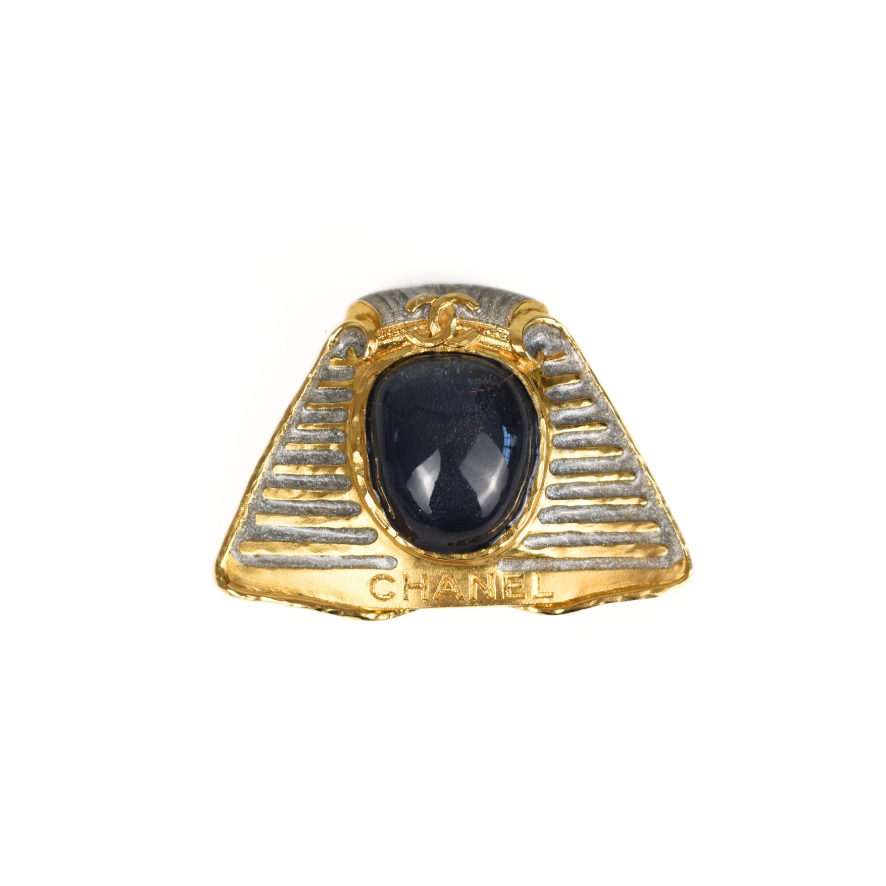 Chanel pharaoh face brooch in gold-tone metal with a large blue stone in the centre. Features engraved logo on the front, silver sparkle enamel filled detailing on the front, and pin clasp on the back. From the 2019 Egypt collection.