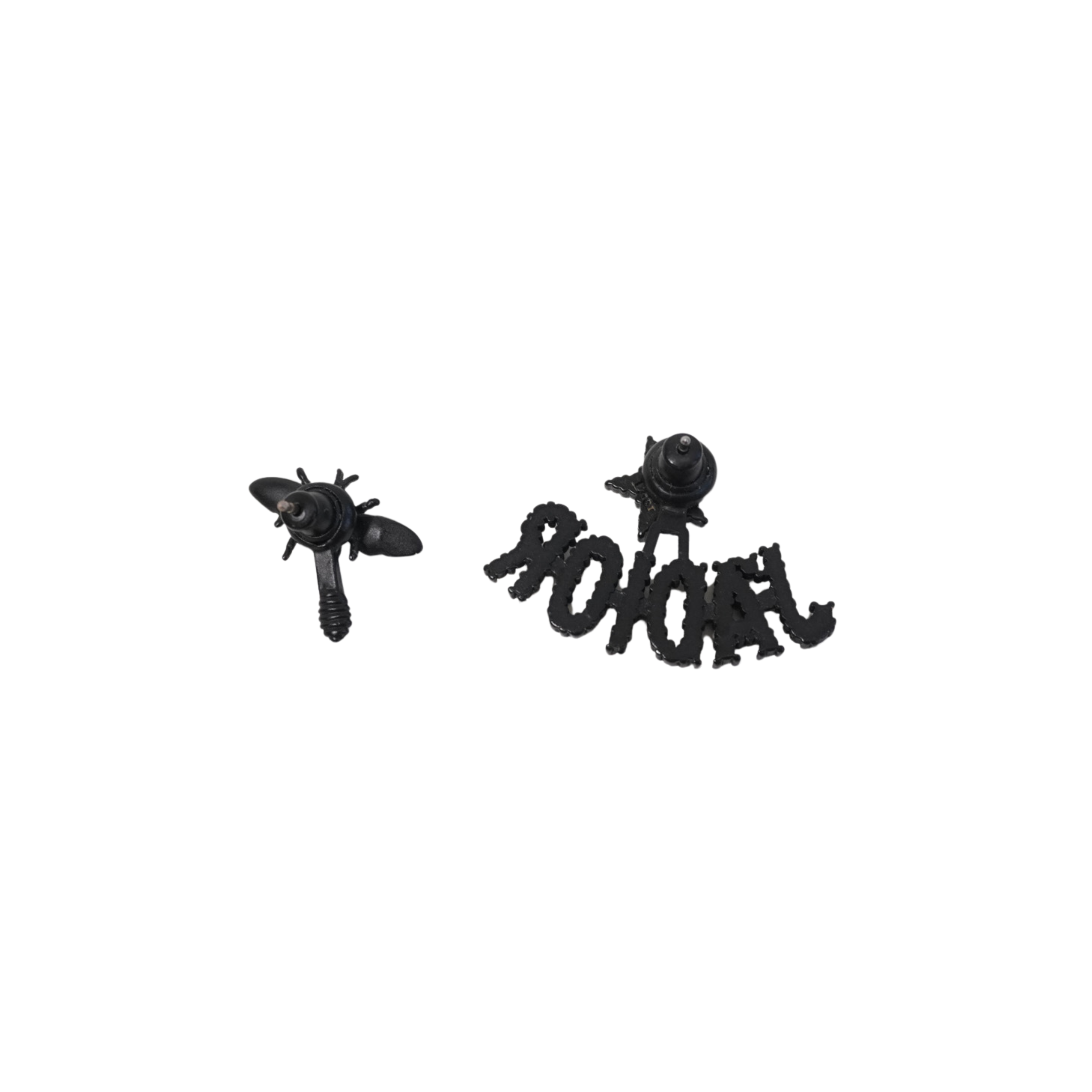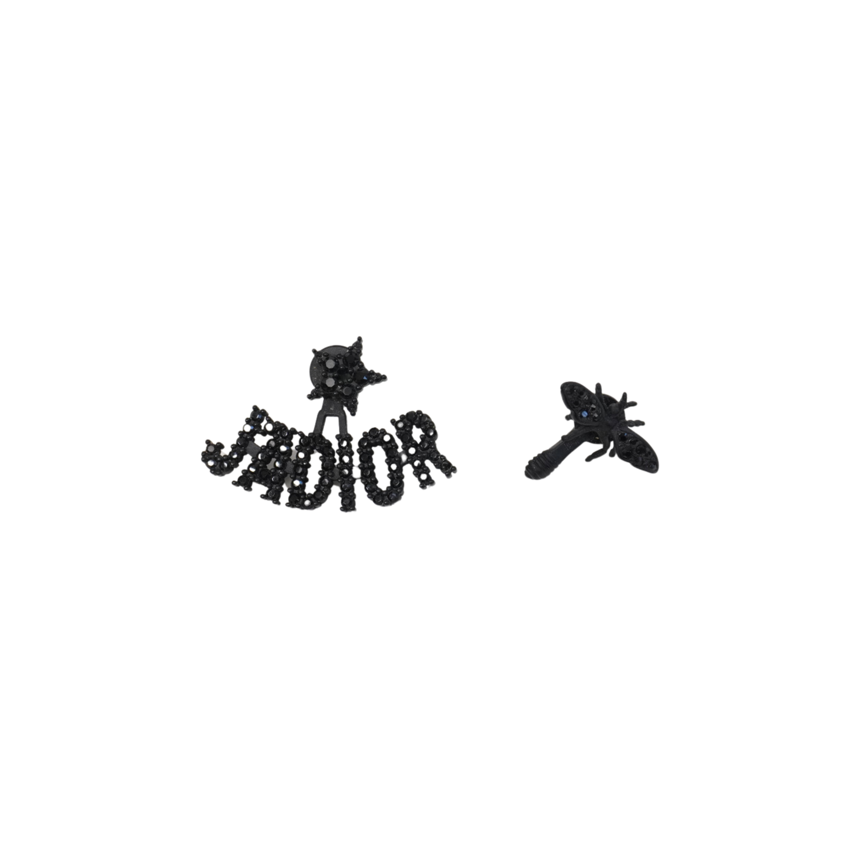 Christian Dior 'J'Adior & Bee' asymmetrical earrings in black metal with black in set crystals featuring a drop logo earring with star stud and bumble bee stud.