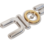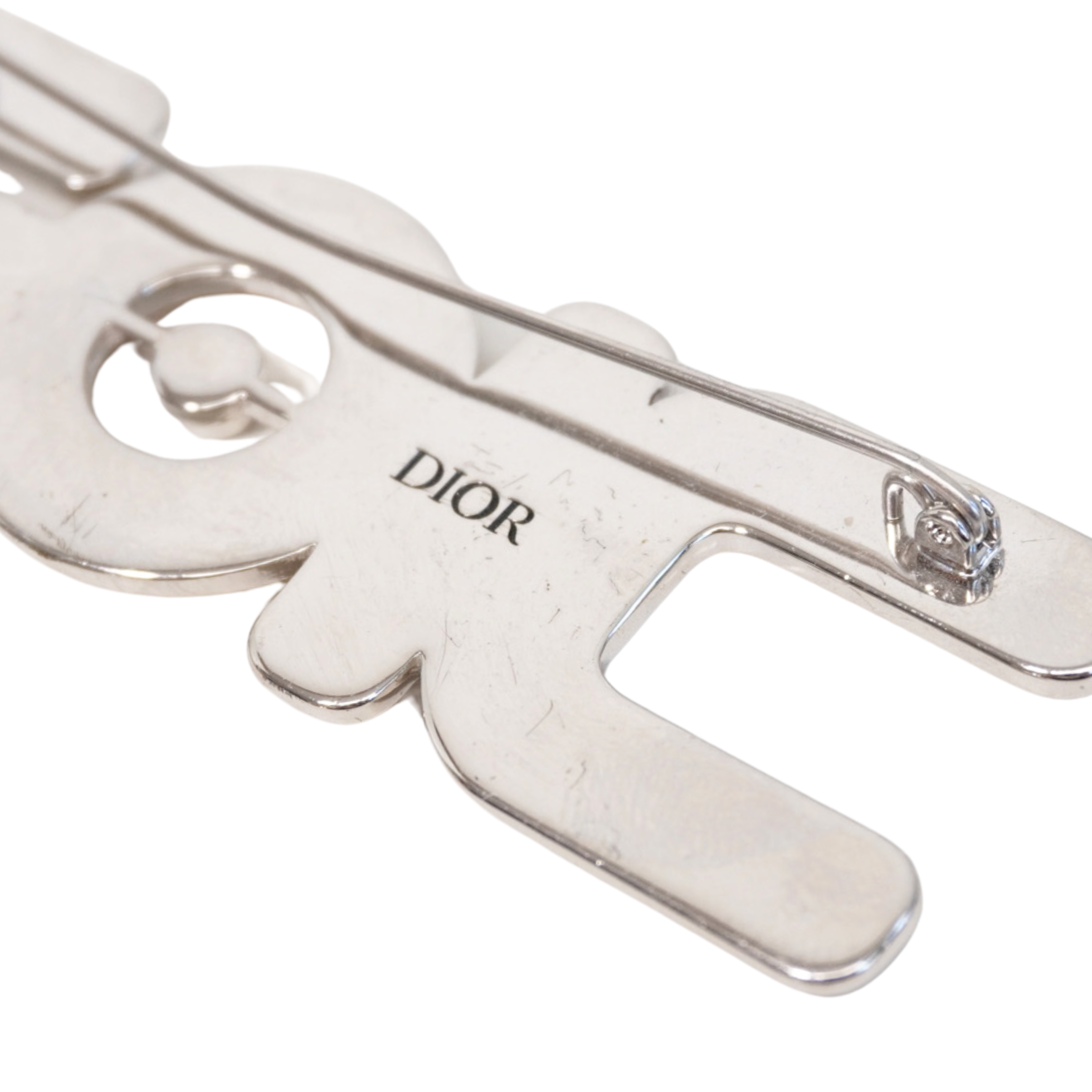 Dior Homme in collaboration with Hajime Sorayama, silver and gold metal logo brooch. Features futuristic logo in silver tone brass with 'O' in gold tone brass.