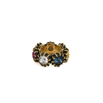 Gucci cocktail ring in aged gold-tone metal with multicolour crystals around the band and tiger head stud.