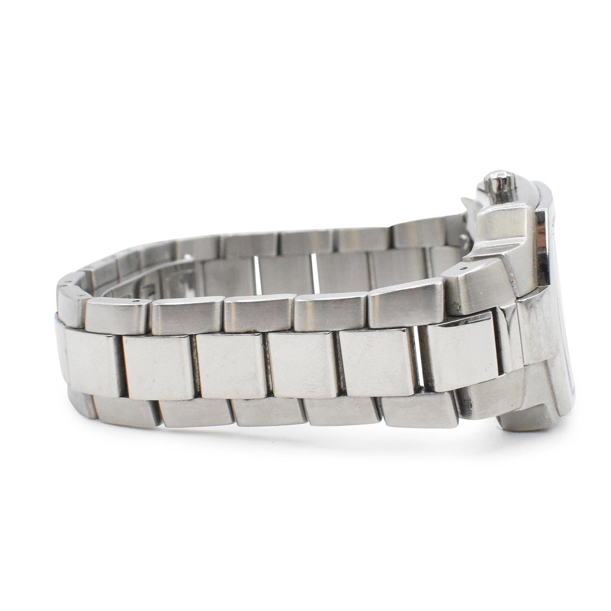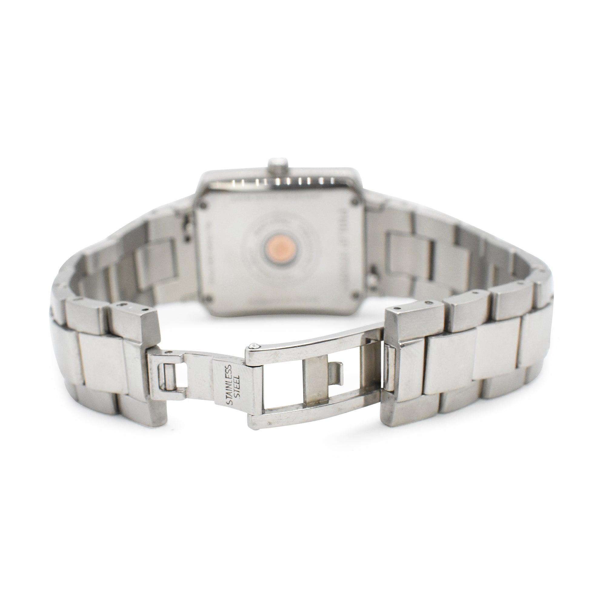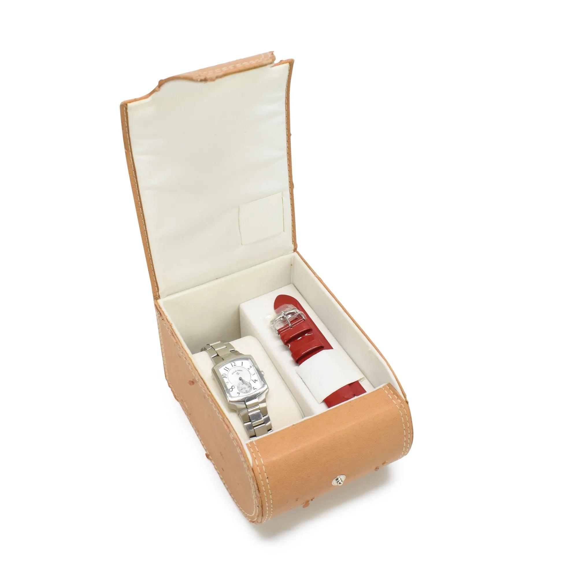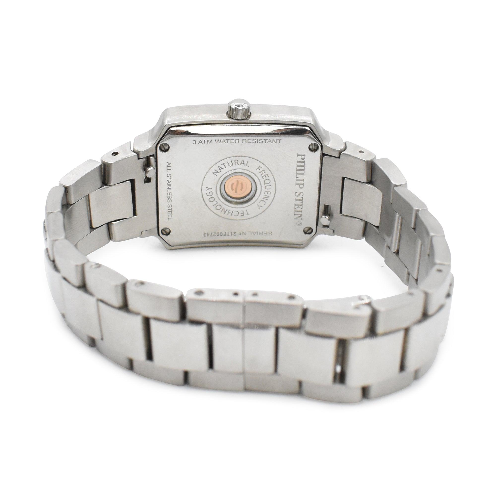 Phillip Stein Watch with a square metal and white pearl face. Features two dials and an exchangeable extra red leather band strap. Includes box.