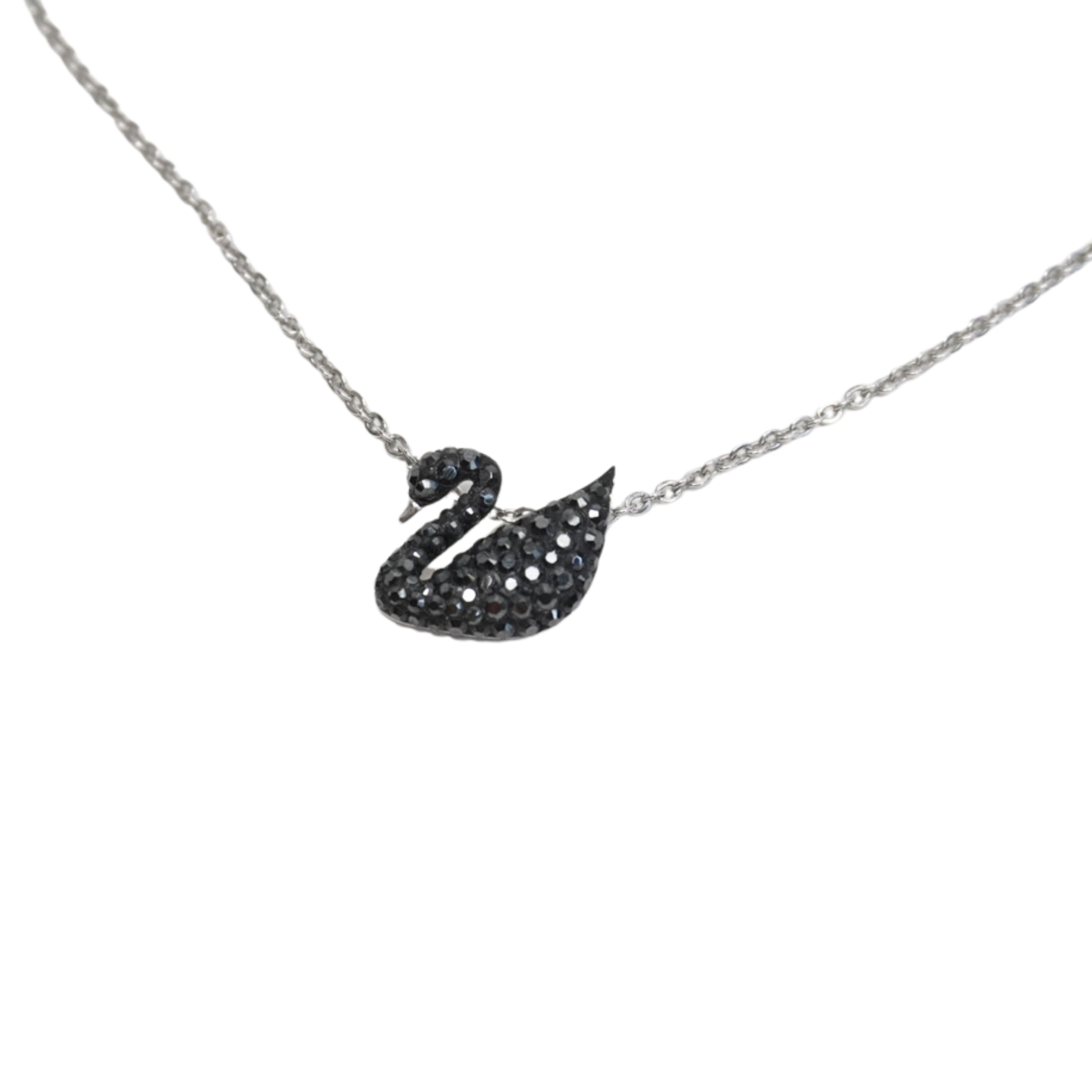 Swarovski 'Swan Pendant' with rhodium plated small link chain with a swan pendant inset with black crystals.