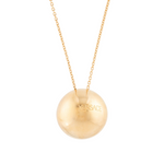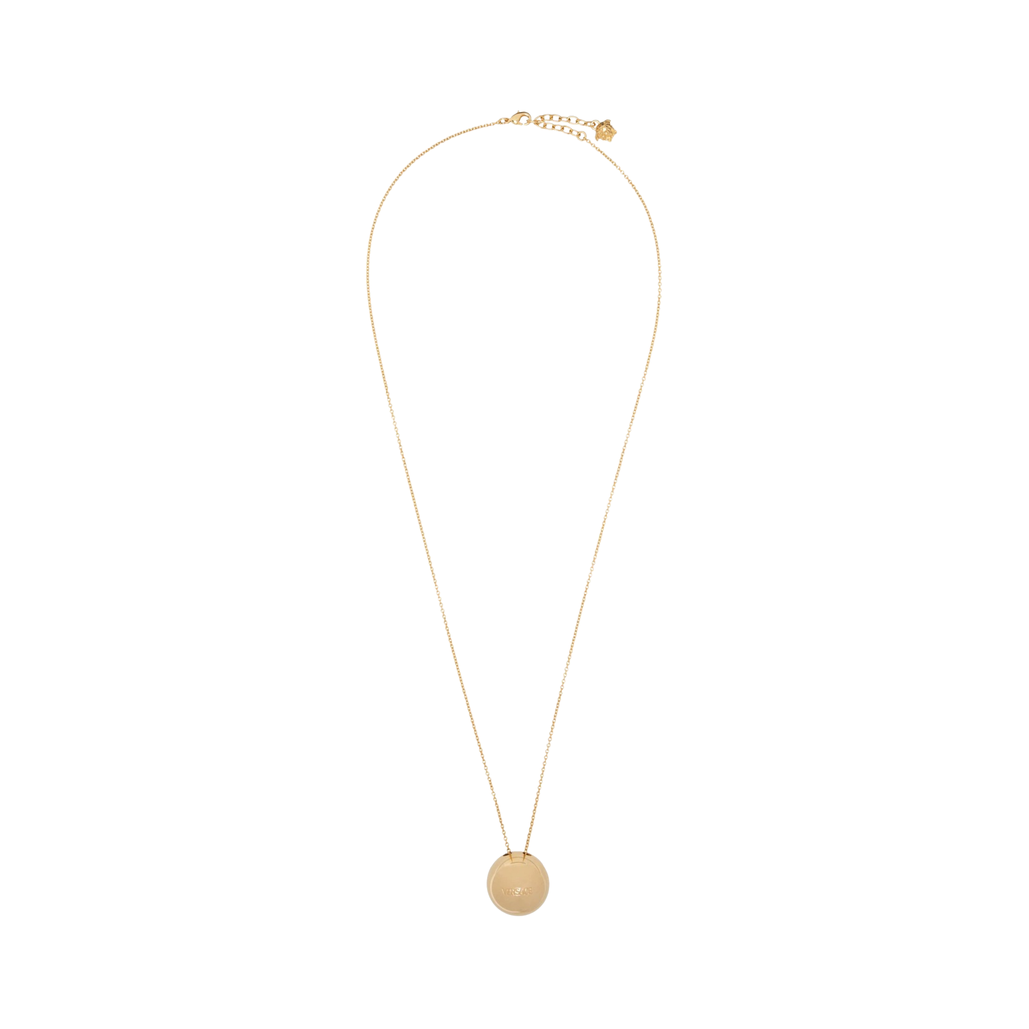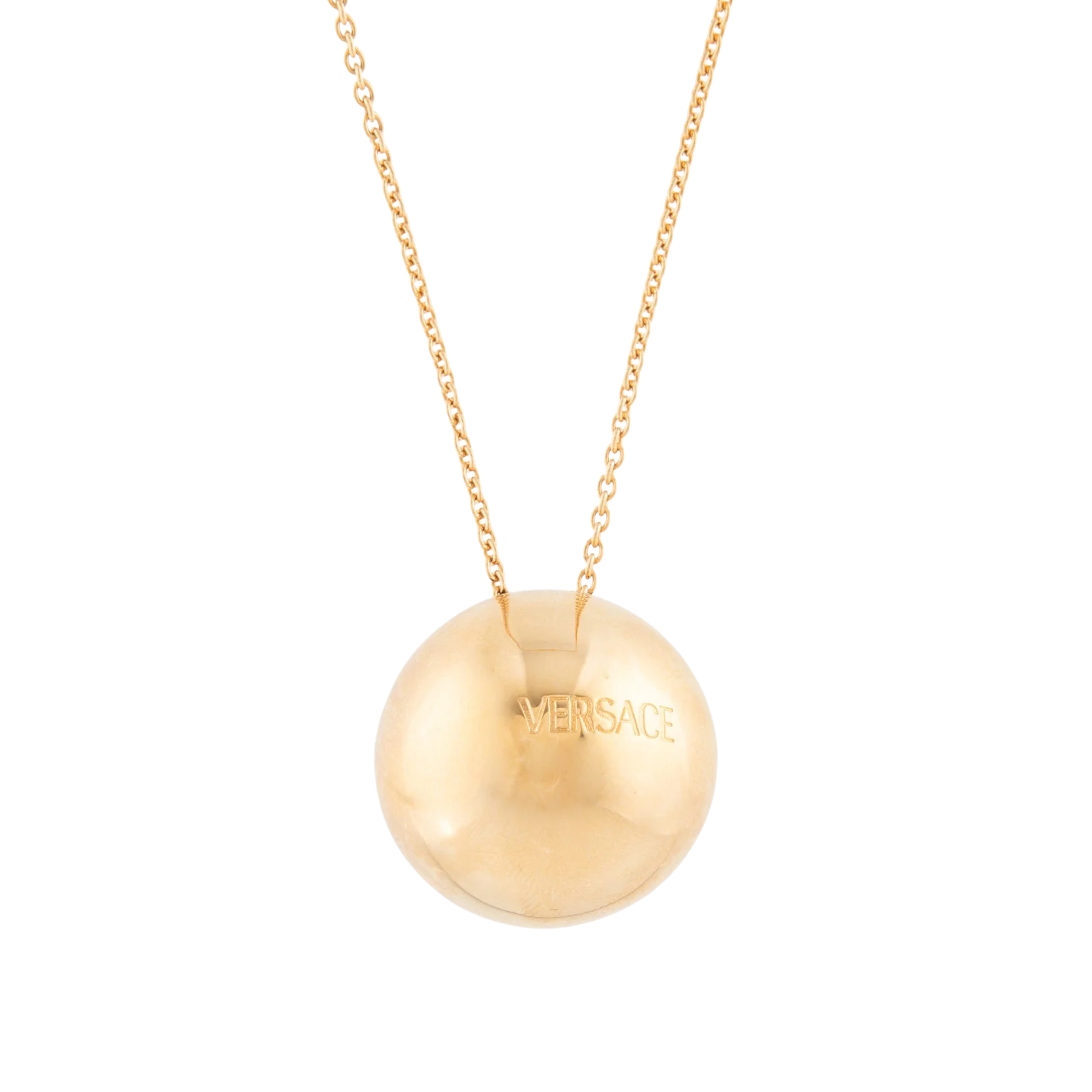 Versace 'Sphere Pendant' necklace in gold coated metal with a ball pendant engraved with 'Versace' logo and small medusa head at the clasp extension.