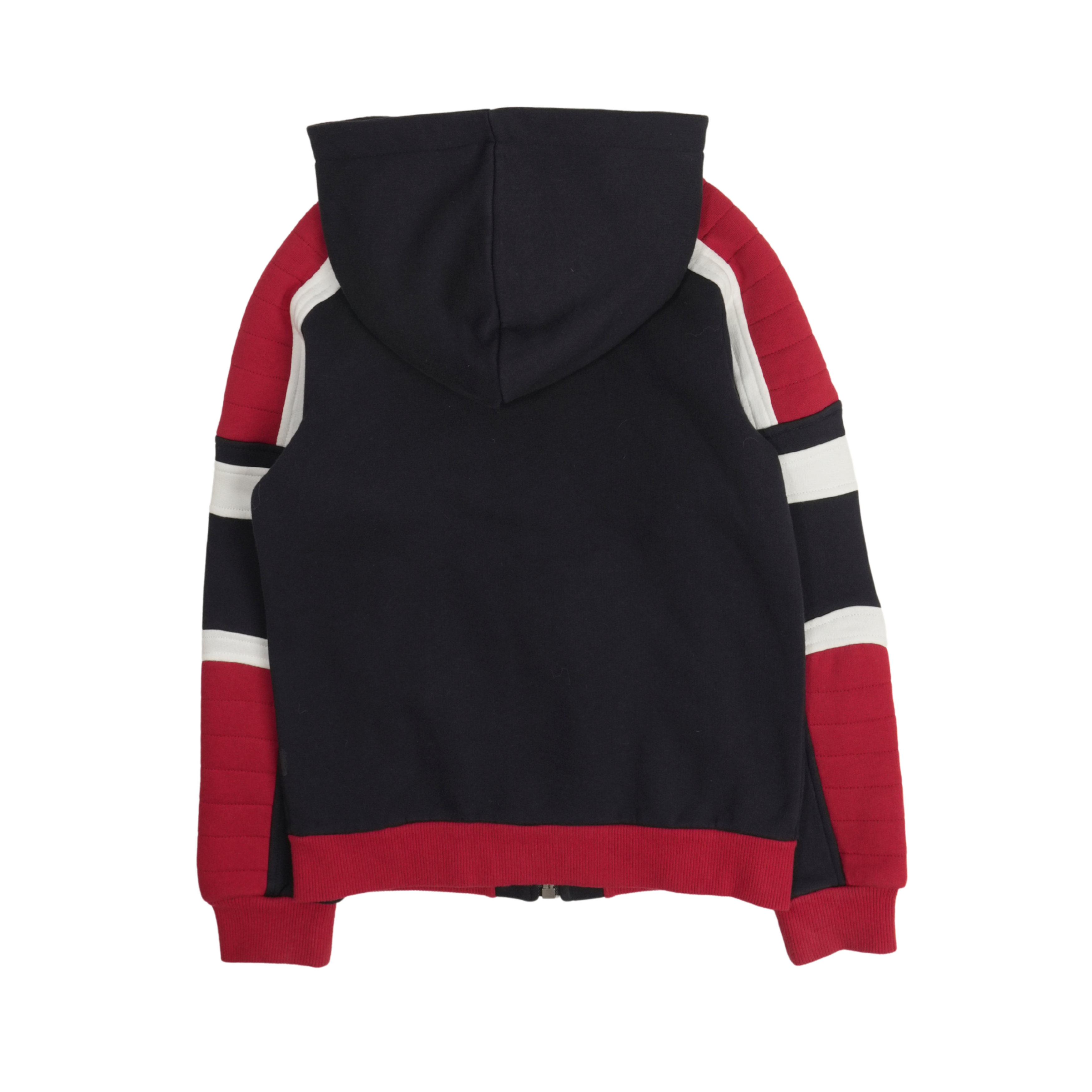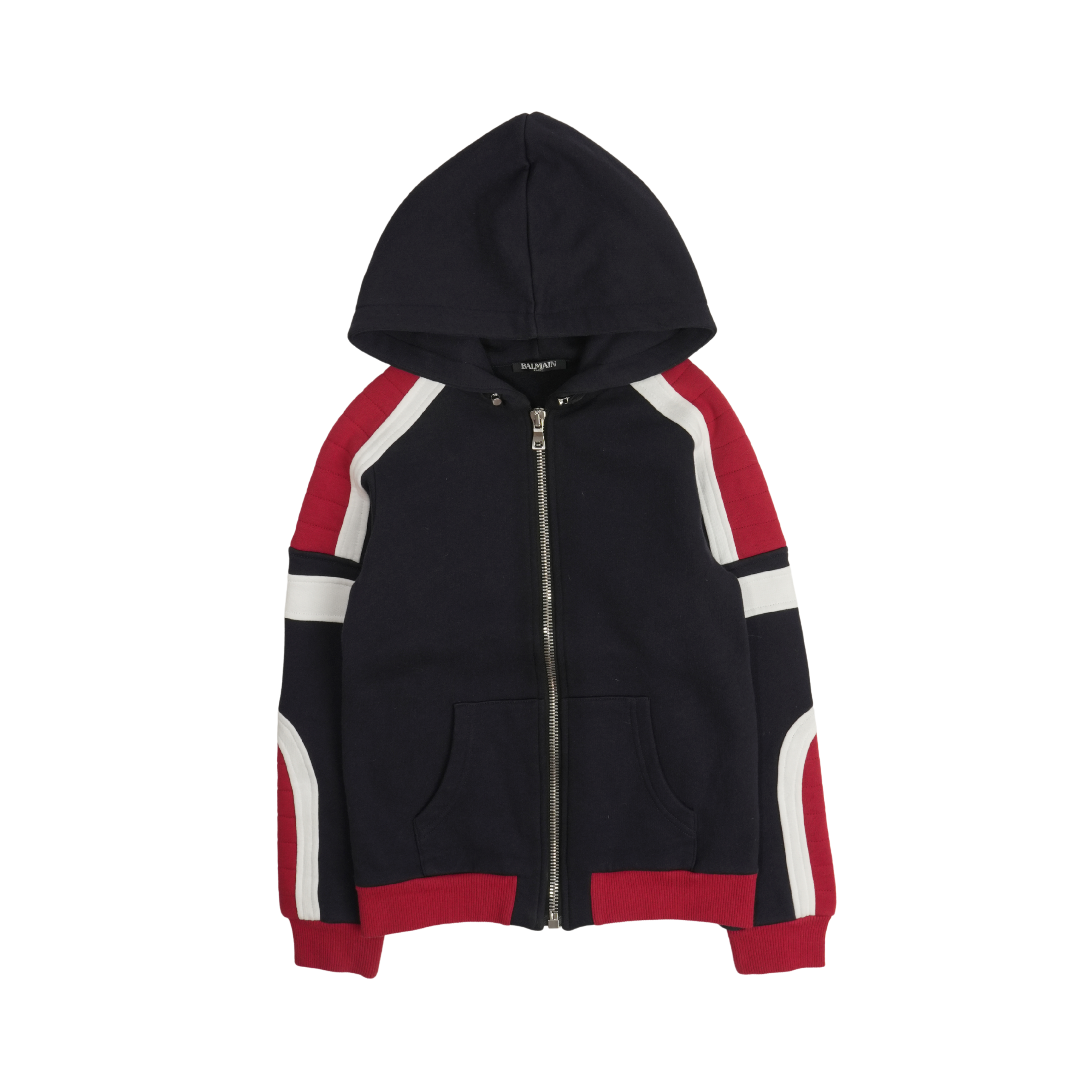 Balmain kid's zip up hoodie in navy blue with red ribbed trim and quilted 'biker' pannels on shouders and forearms. Features silver toggle drawstrings, a silver zipper and white details.