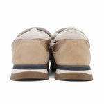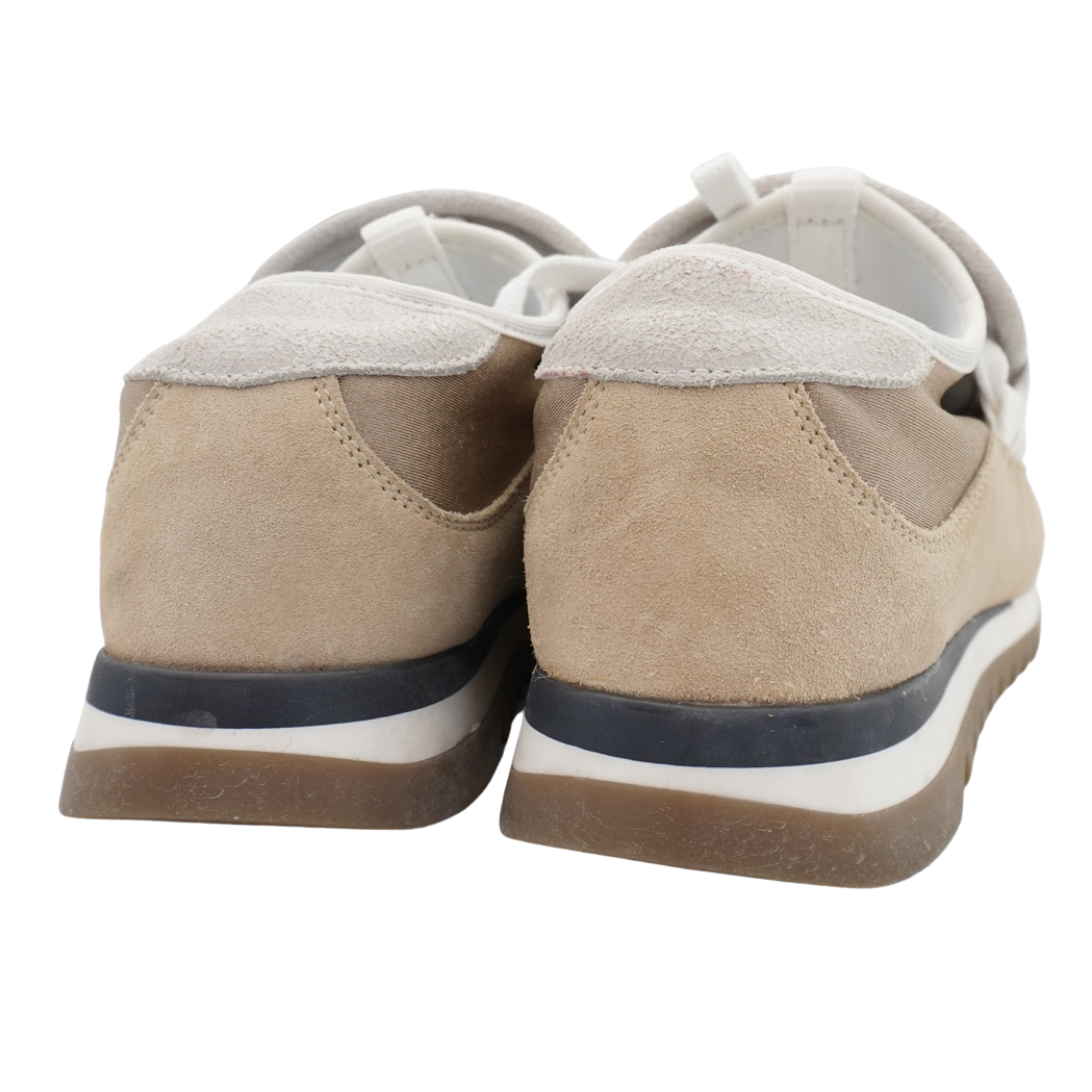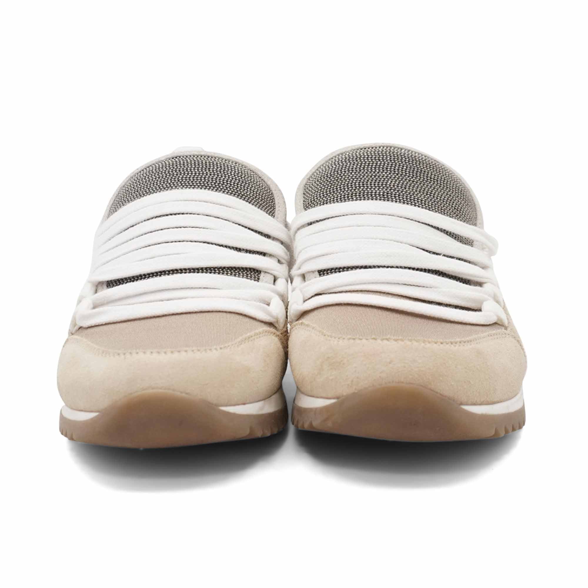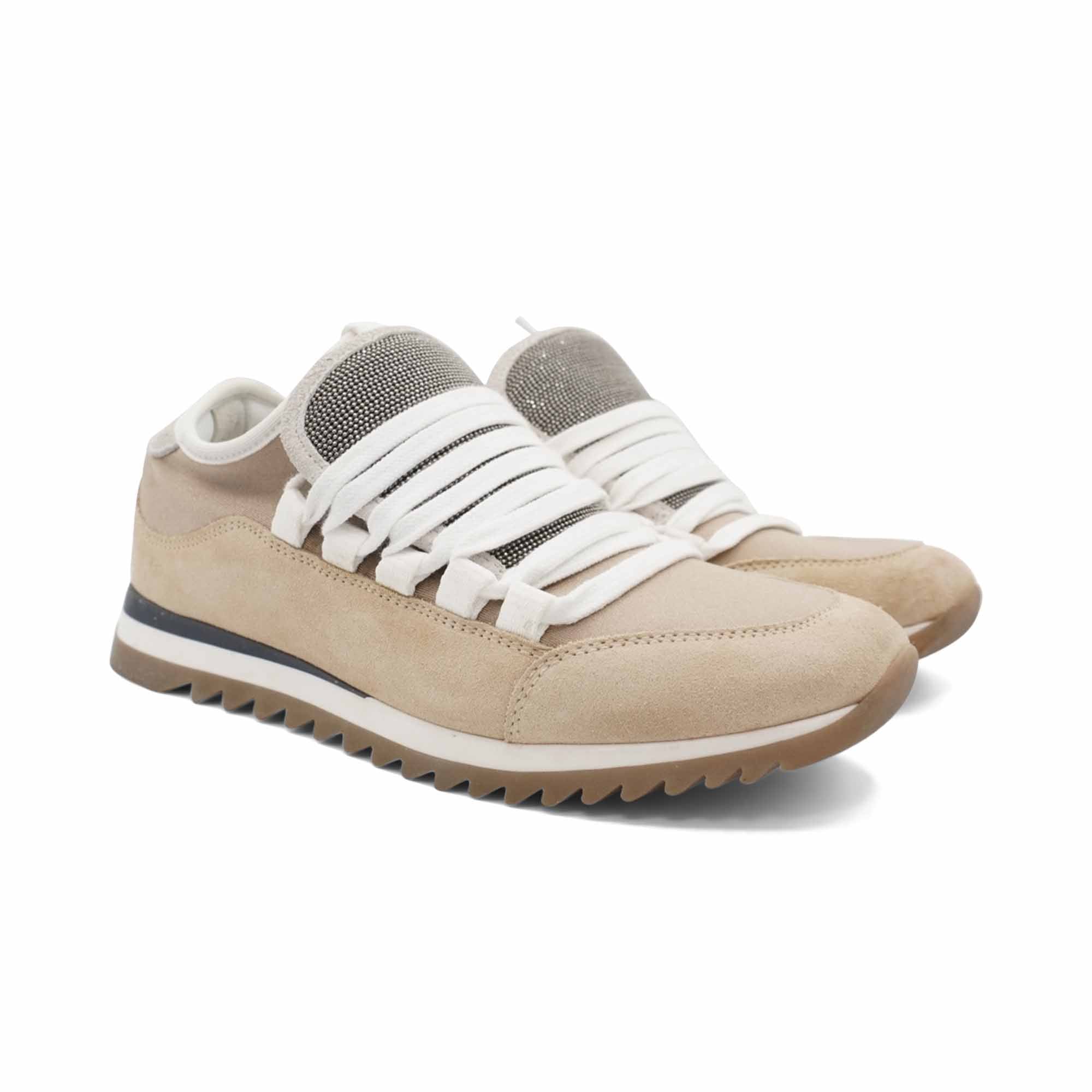 Brunello Cucinelli sneakers in taupe suede with white laces, and a silver 'monili' beaded tongue.