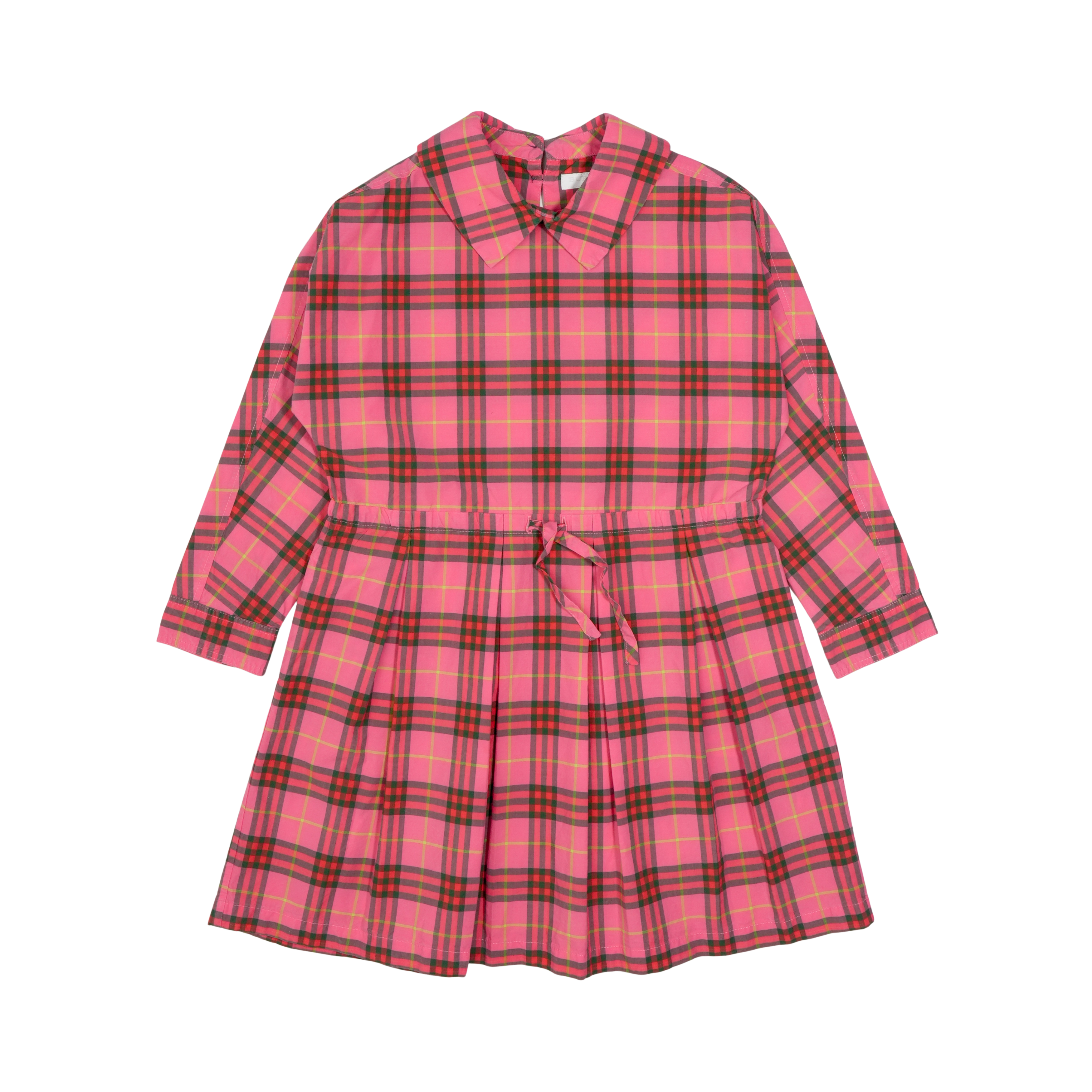 Burberry pink Novacheck dress with a pleated A-line dress, self tie bow at the waist, and long sleeves.
