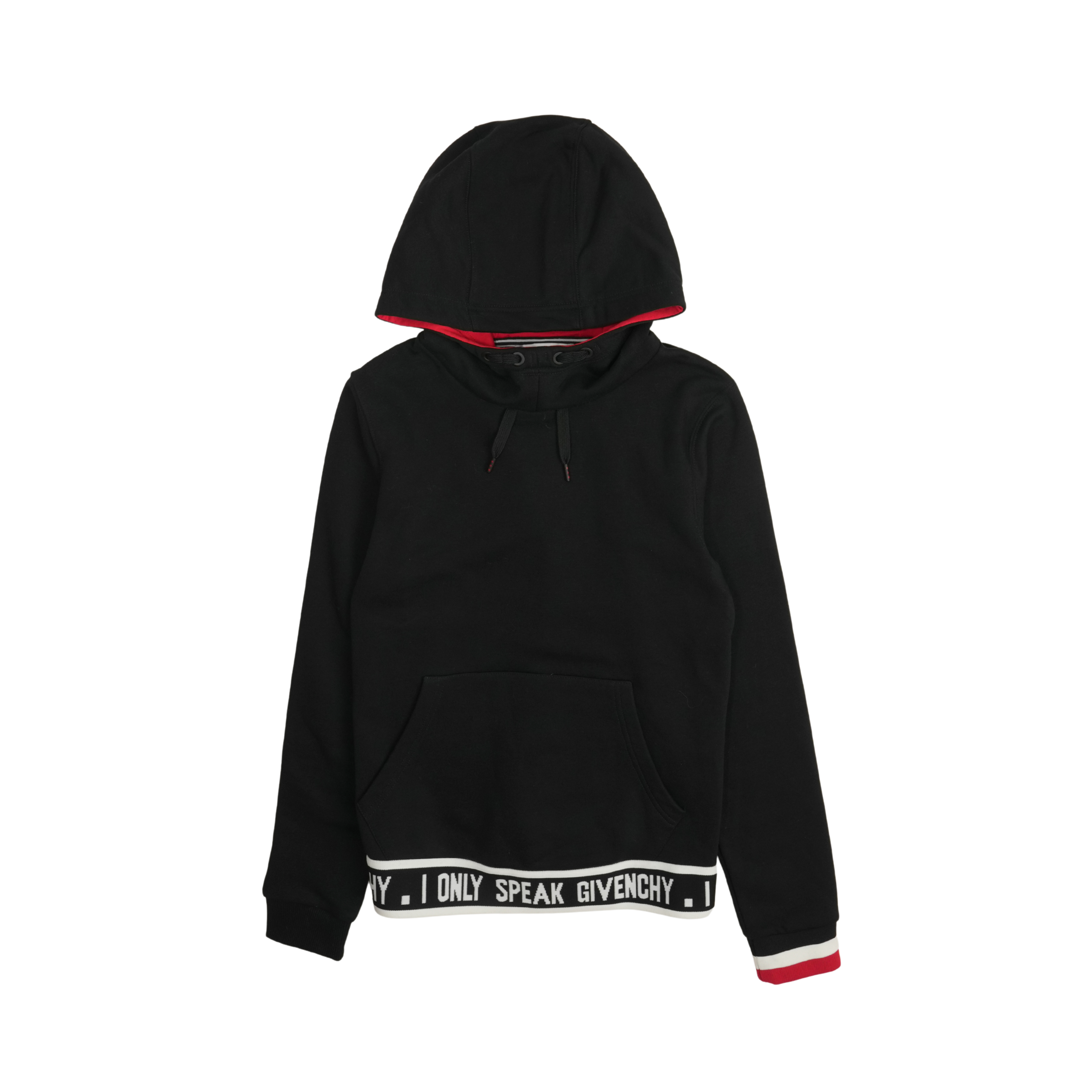 Givenchy kid's pull-over hoodie in black with logo elastic waistband that reads "I ONLY SPEAK GIVENCHY". Features a red interior, a black, white and red sleeve cuff and a faux sewn in drawstring at neckline.