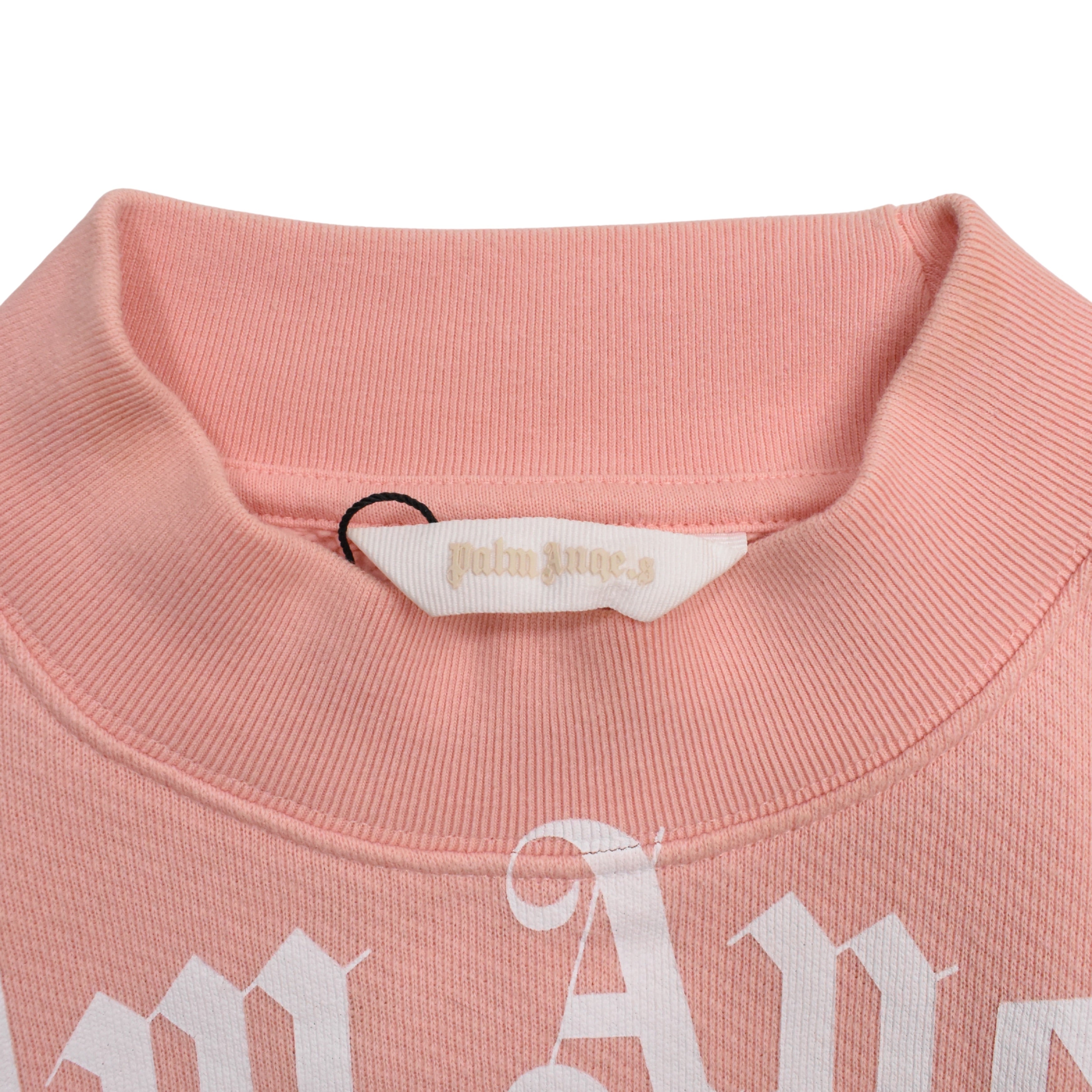 Palm Angels mock neck sweater in light pink with white gothic writing across the chest.