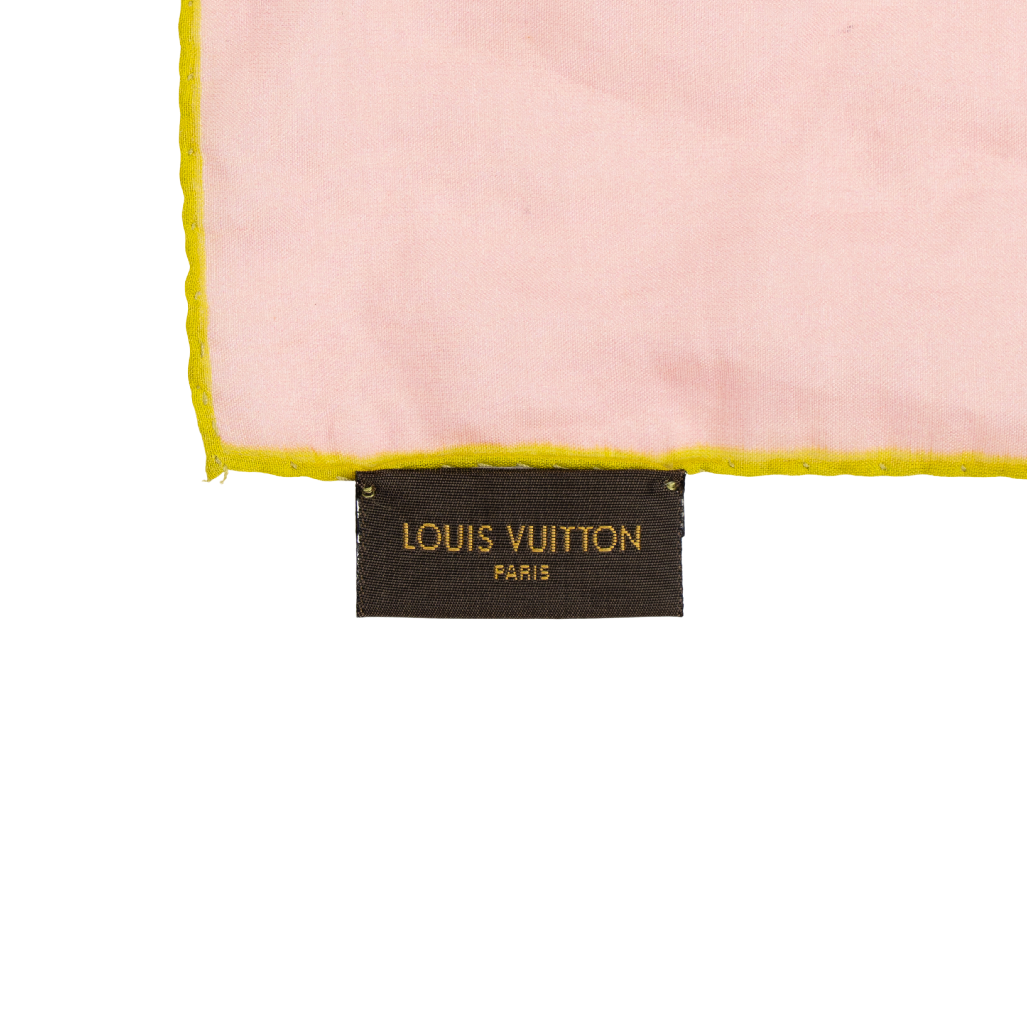 Louis Vuitton 'Pareo Aqua Keepall Rose' sheer square scarf in pink with brown monogram keepall graphic with red strap and trim. Featuring orange logo near the edge and lime green rolled hem.