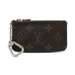 Louis Vuitton 'Pochette Cles' key pouch in brown monogram coated canvas. Features a gold clip on a chain, and a zipper closure.