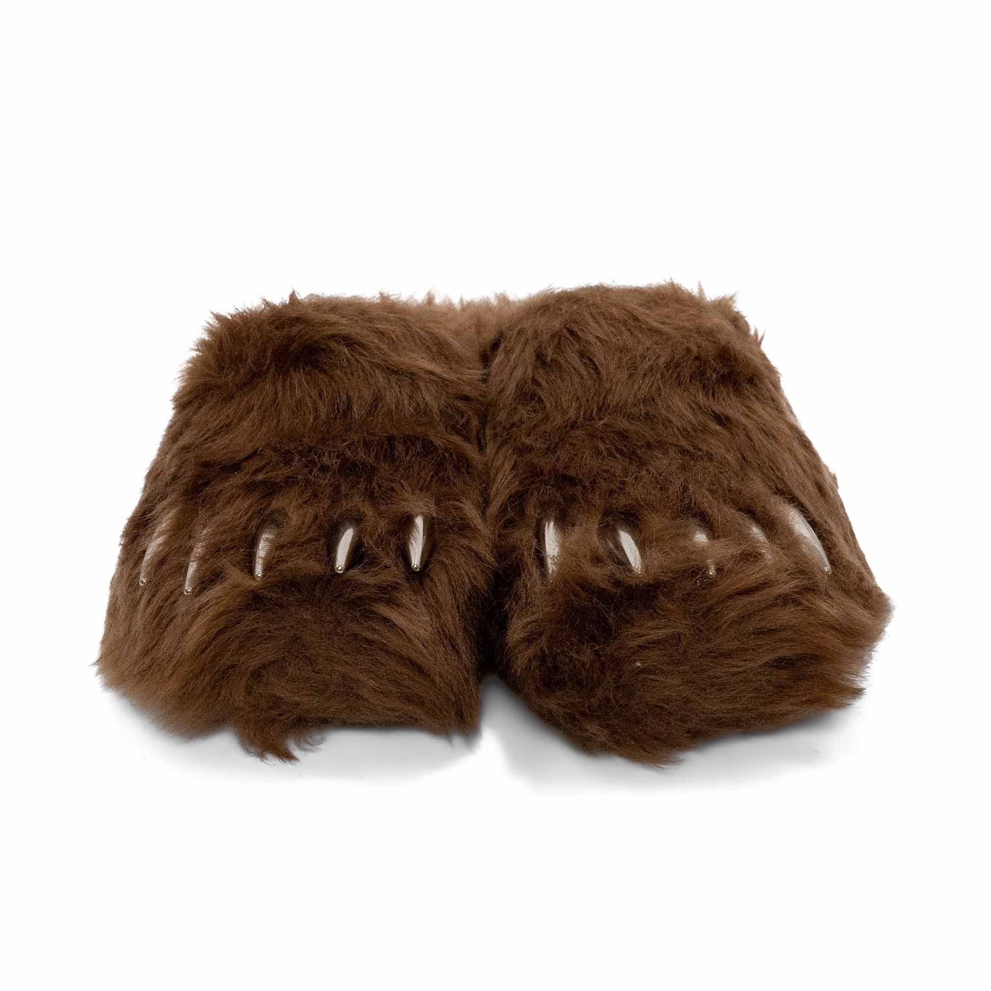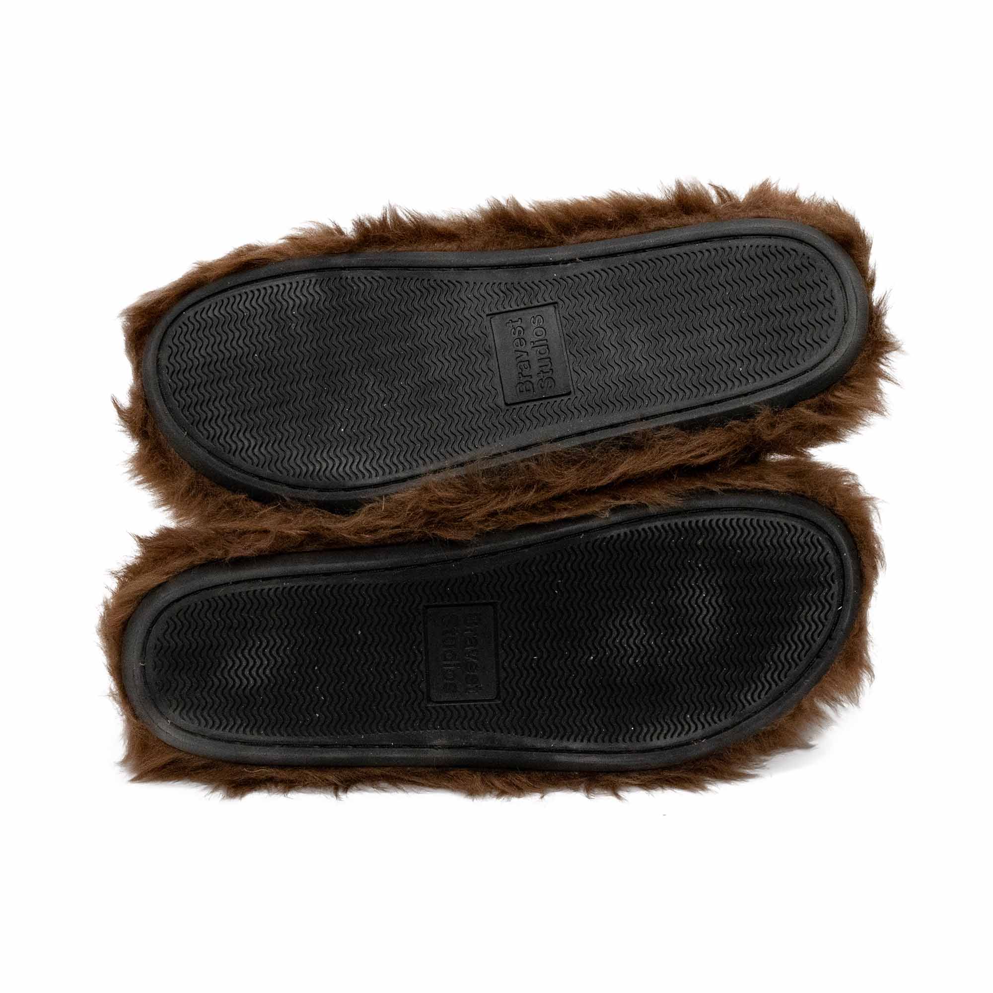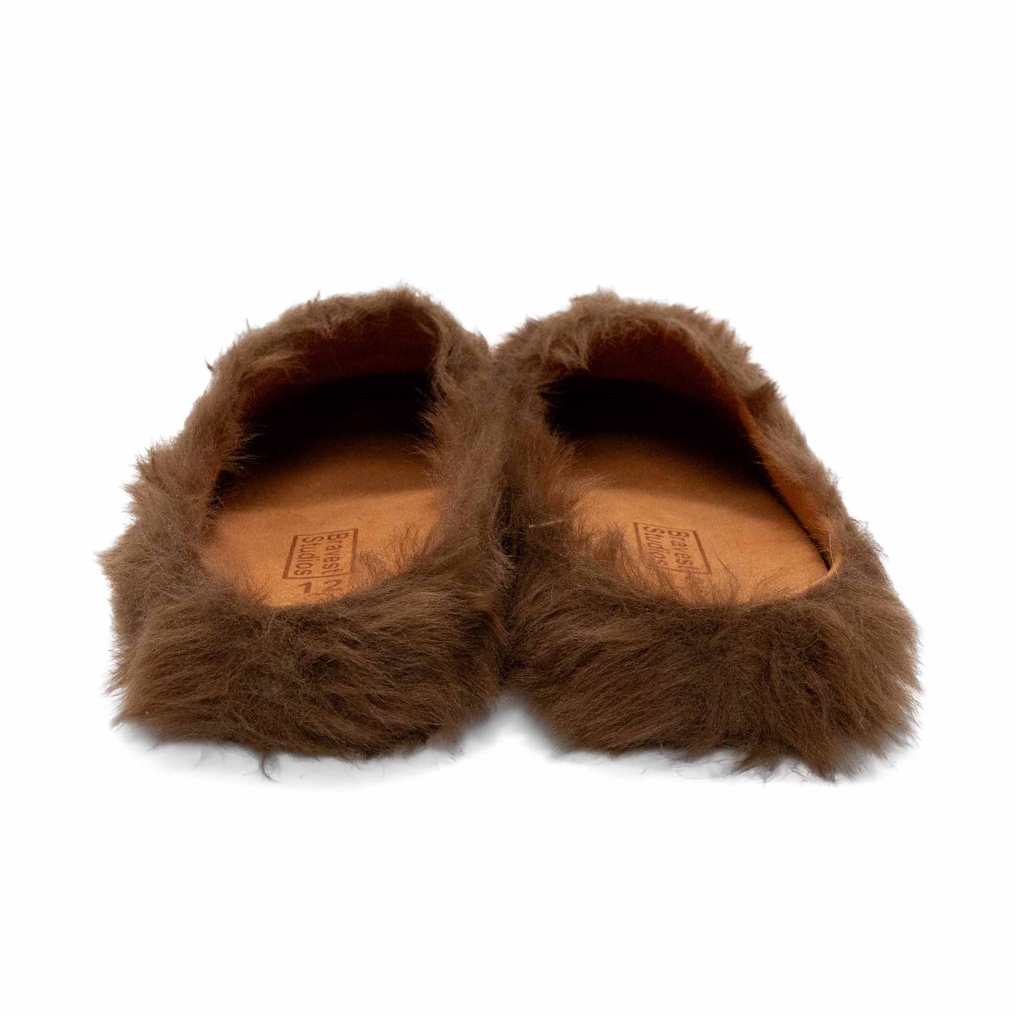 Bravest Studio 'Bear Claw Mules' slippers in brown faux fur with spiked steel silver claw details on toe area, and black rubber sole.