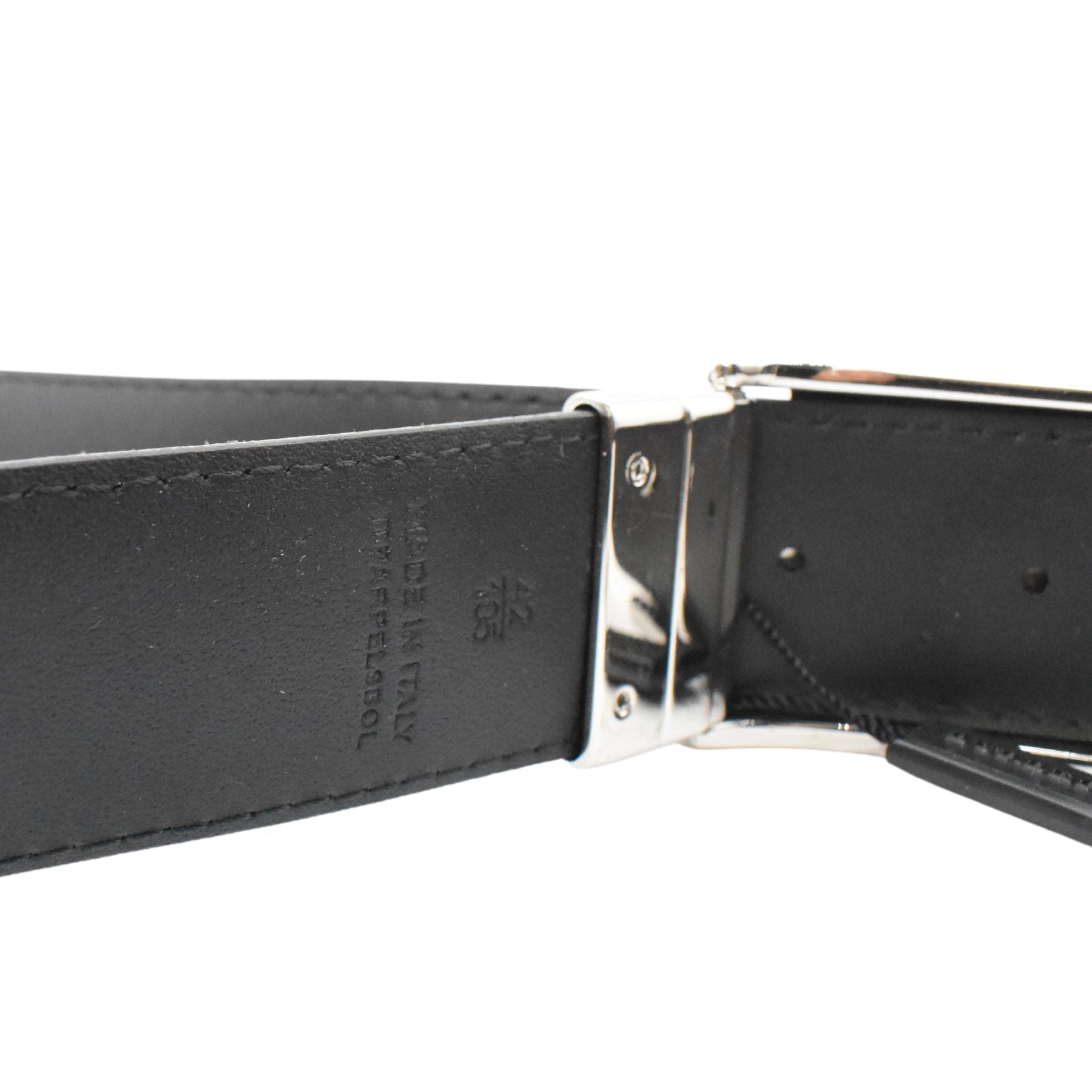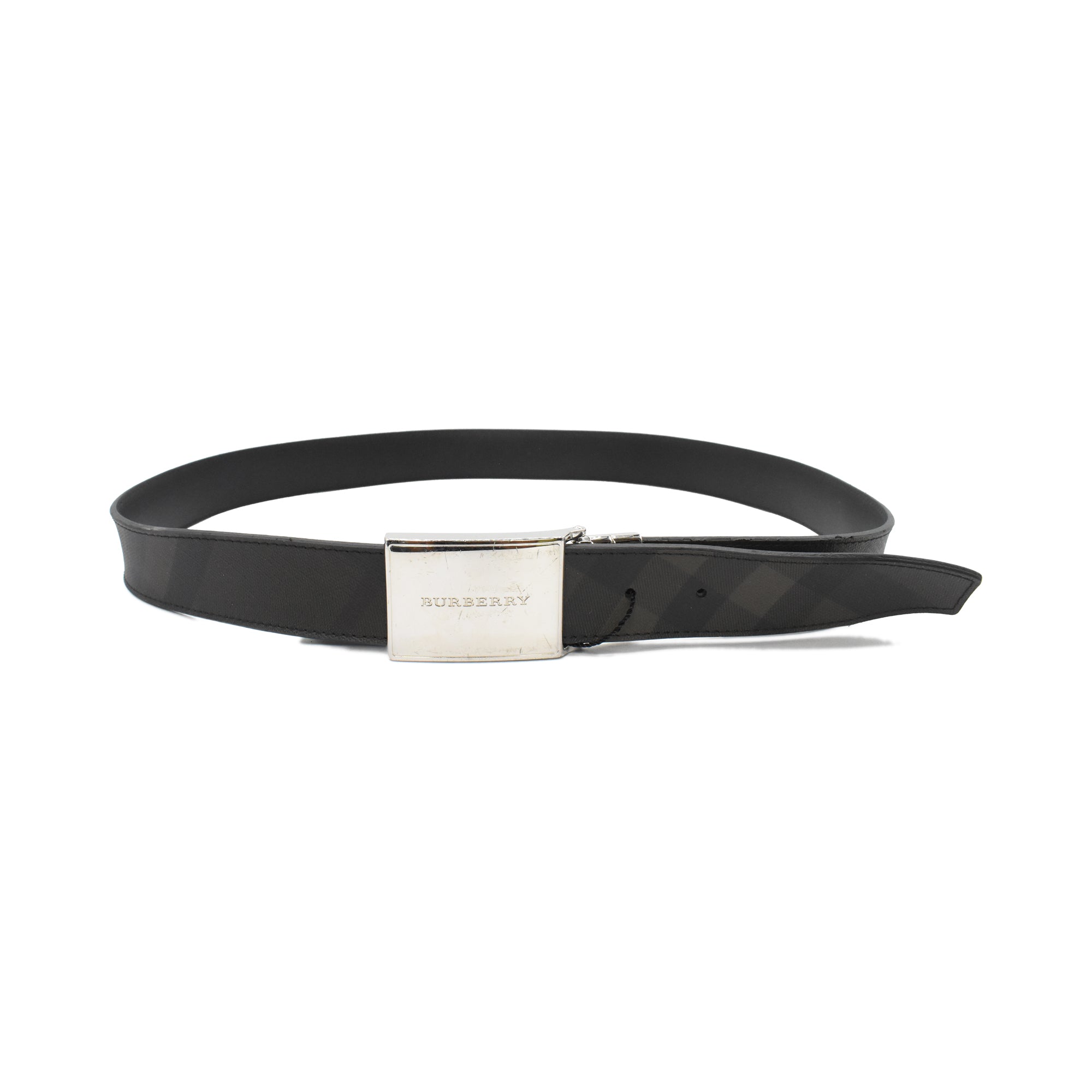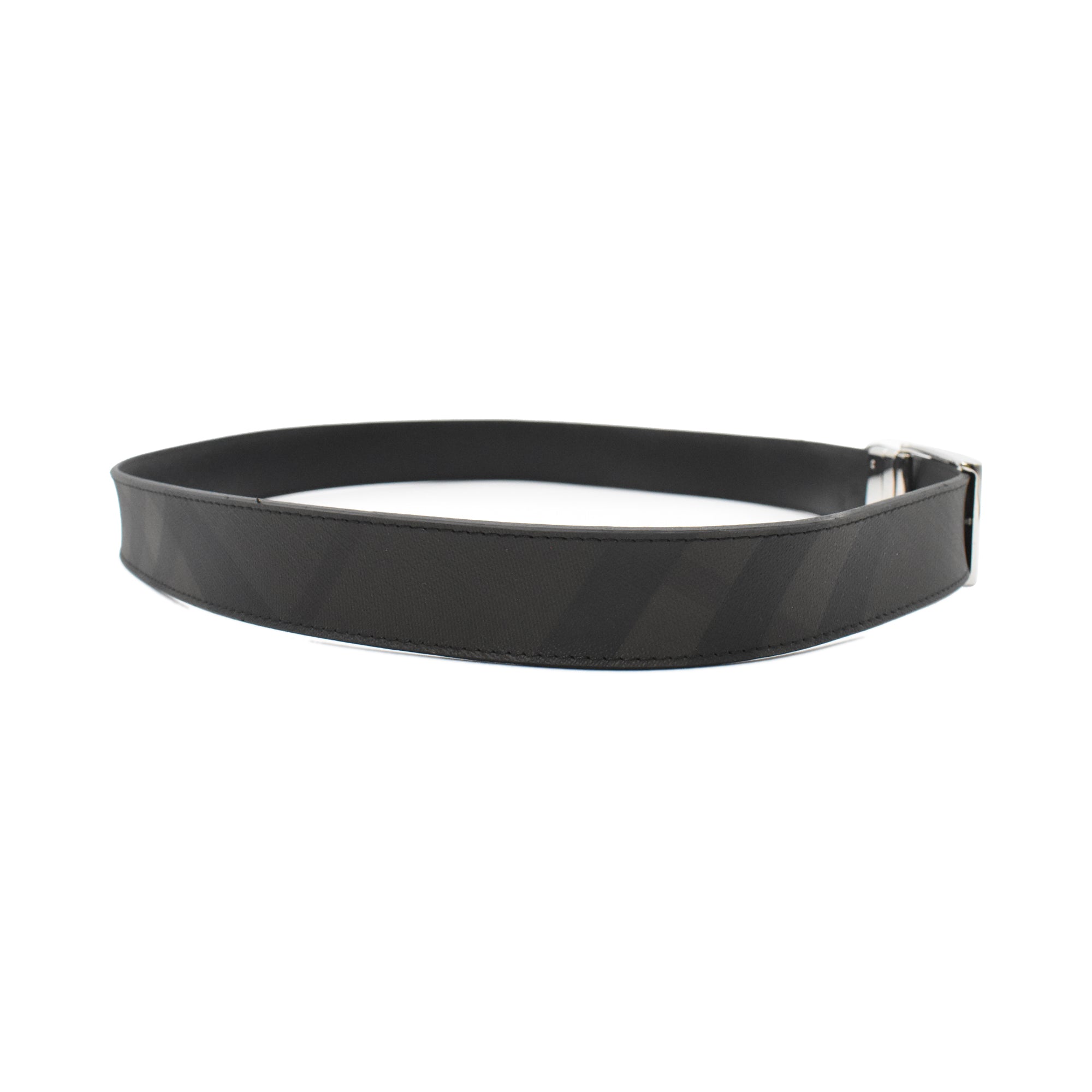 Burberry reversible belt in black and brown novacheck printed coated canvas with a black leather interior and a rectangular buckle in silver hardware.
