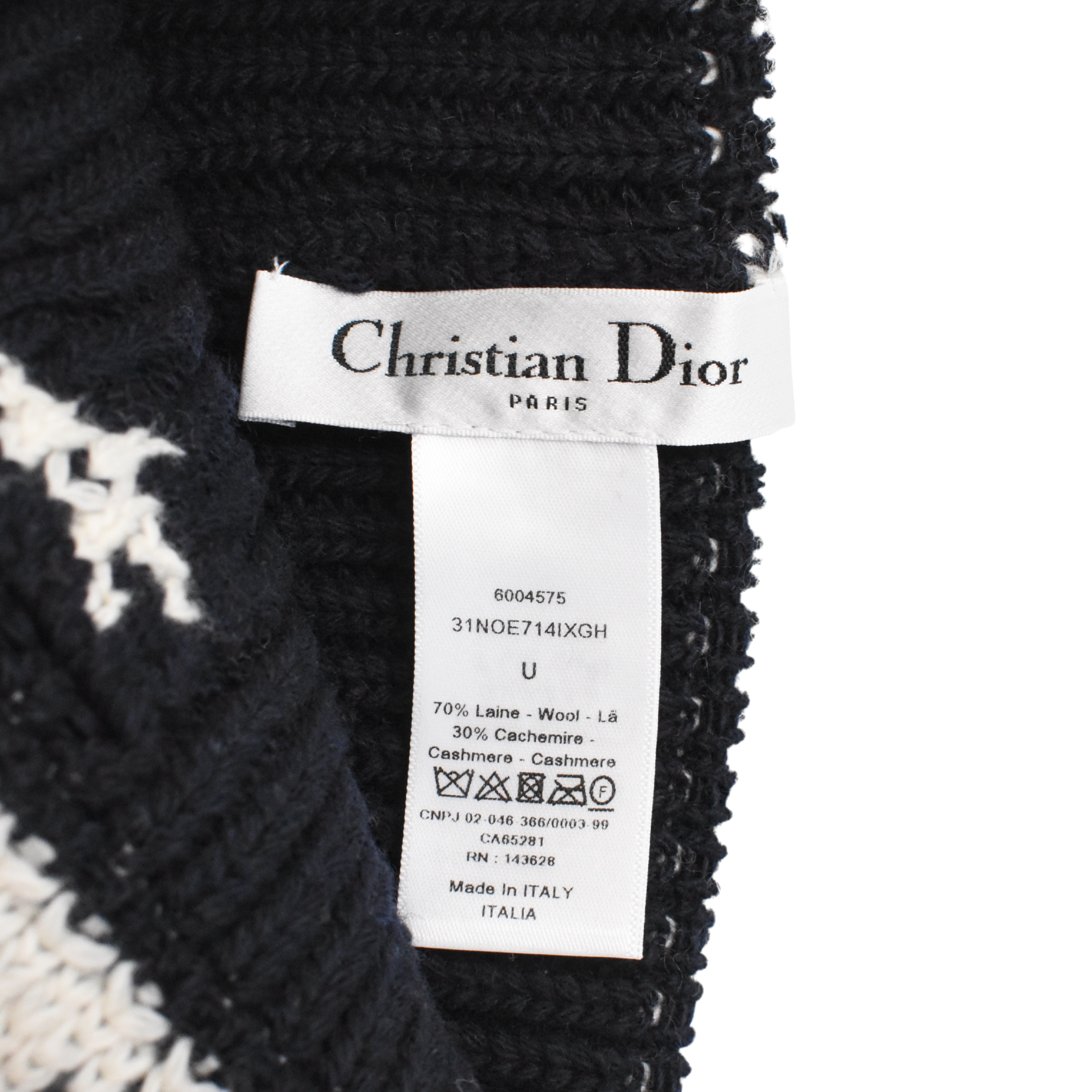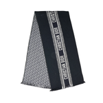 Christian Dior knit blanket scarf in navy and white. One side features Dior 'Oblique' all-over print, other side is navy with white Christian Dior logo down centre. Features fringes on ends.