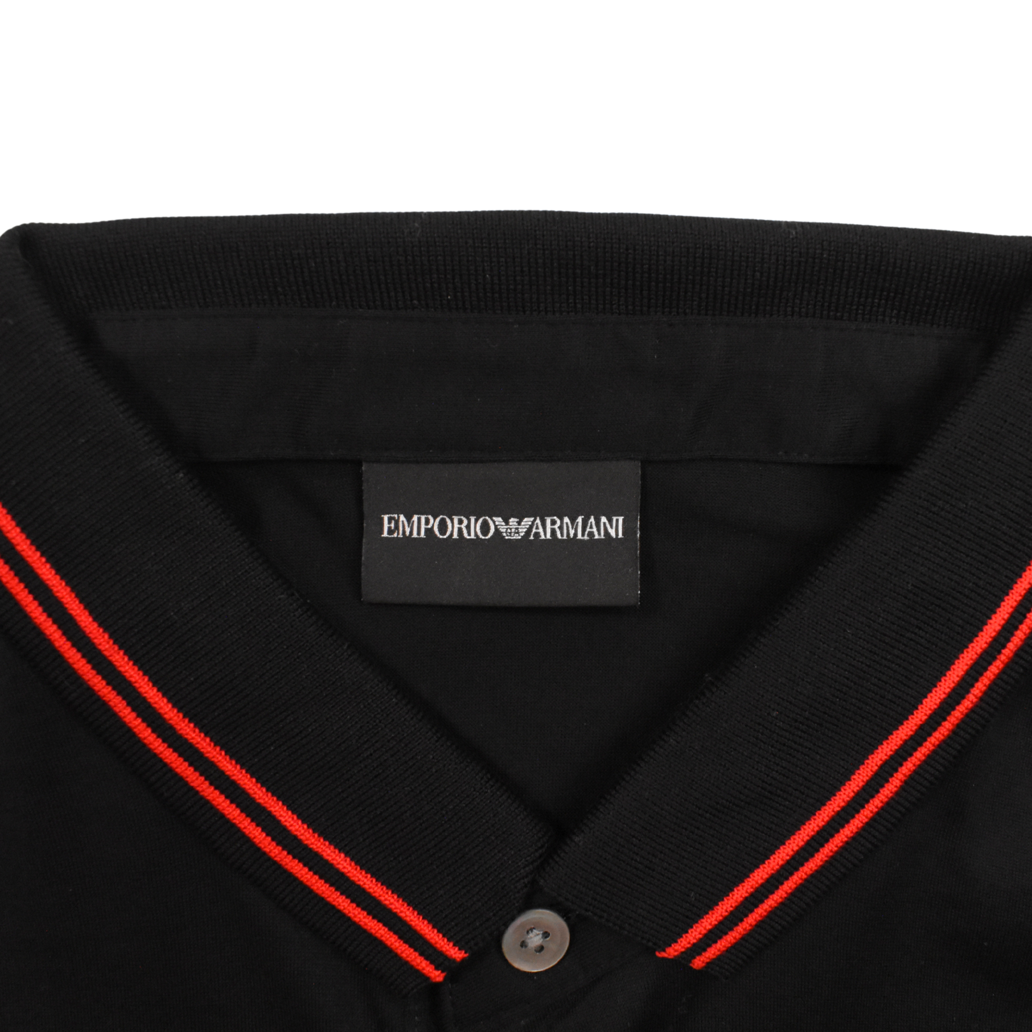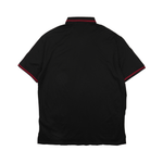 Emporio Armani polo shirt in black cotton-jersey. Features a ribbed collar and sleeve cuffs with red stripe details and a textured rubber black bear logo on chest.