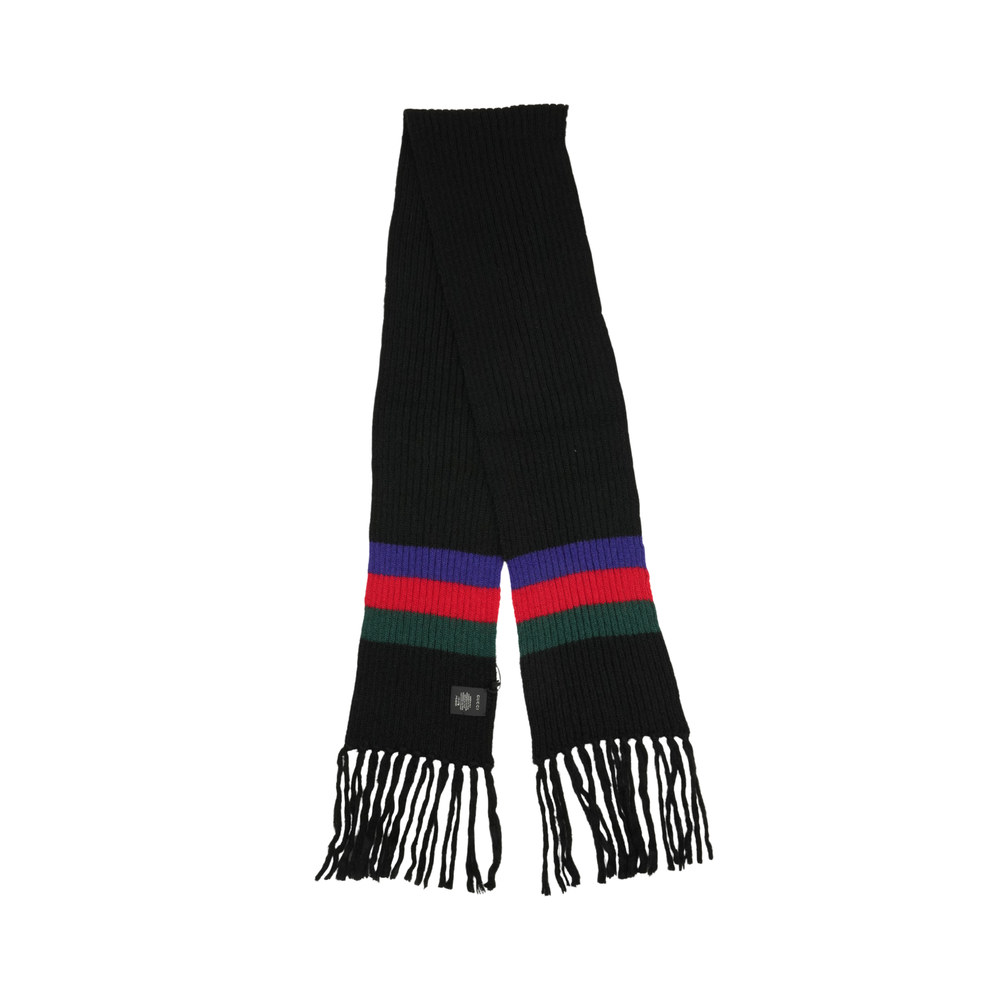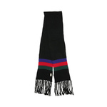 Gucci 'Crazy Lady' long skinny scarf in black ribbed knit with red, green, and blue stripes and fringe at both ends.