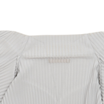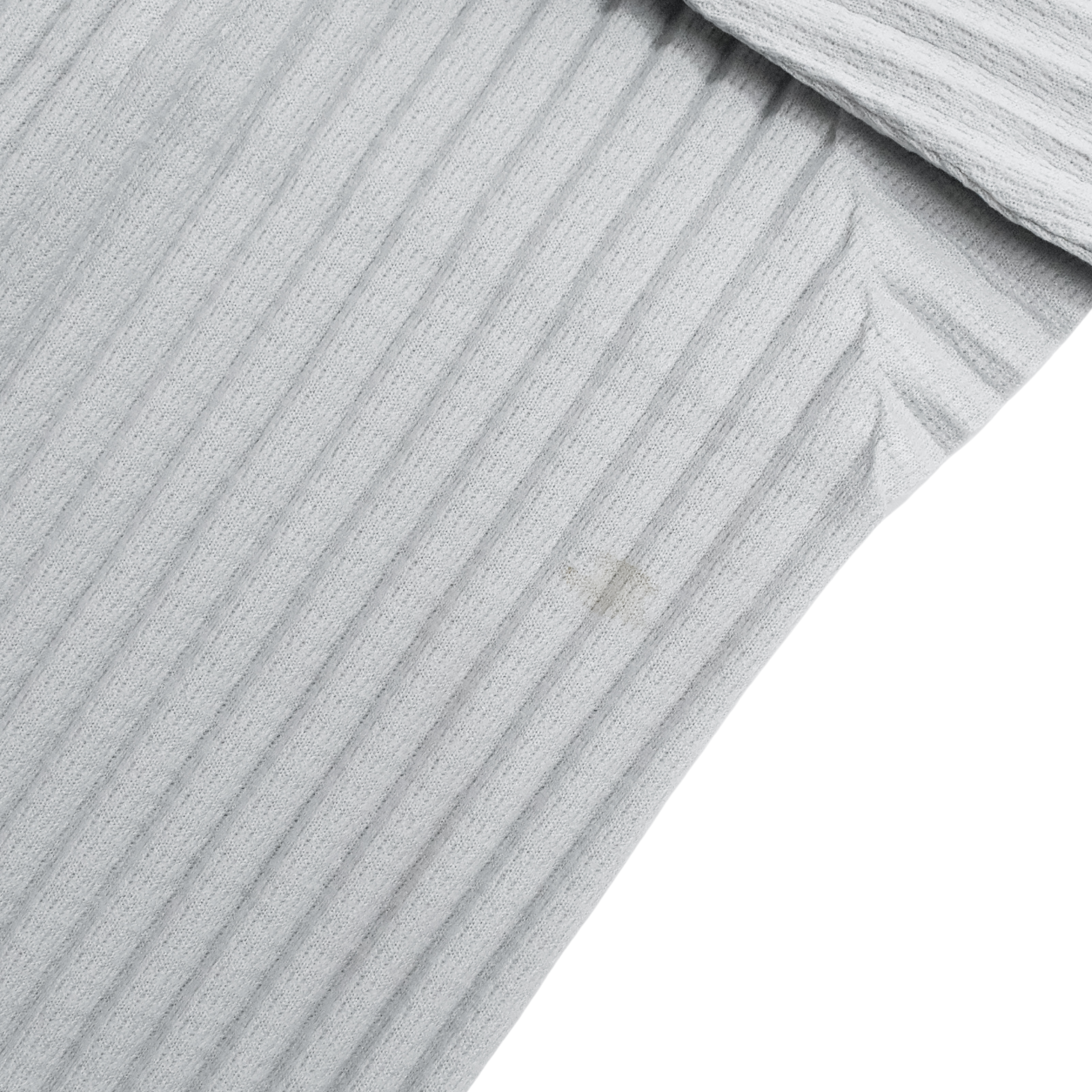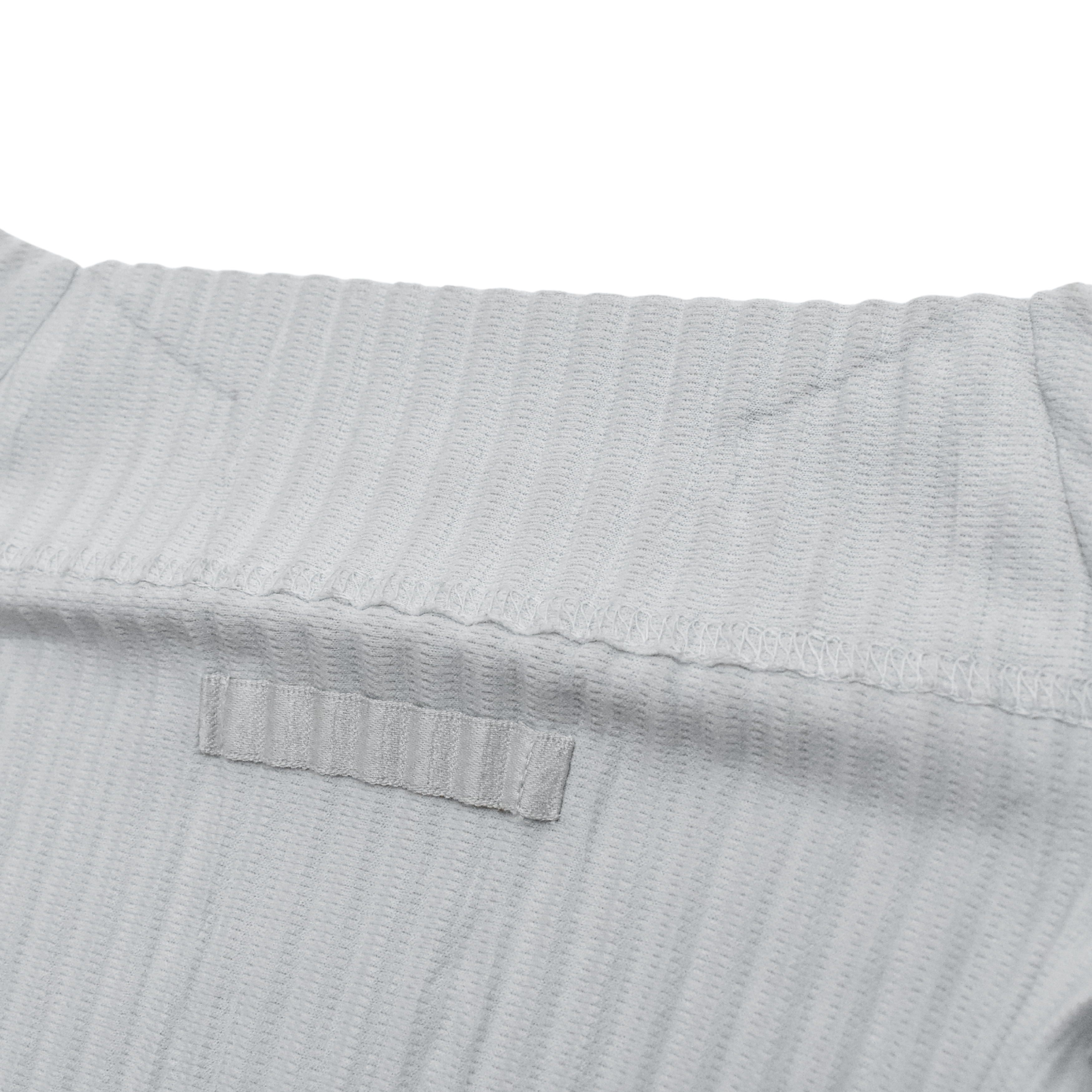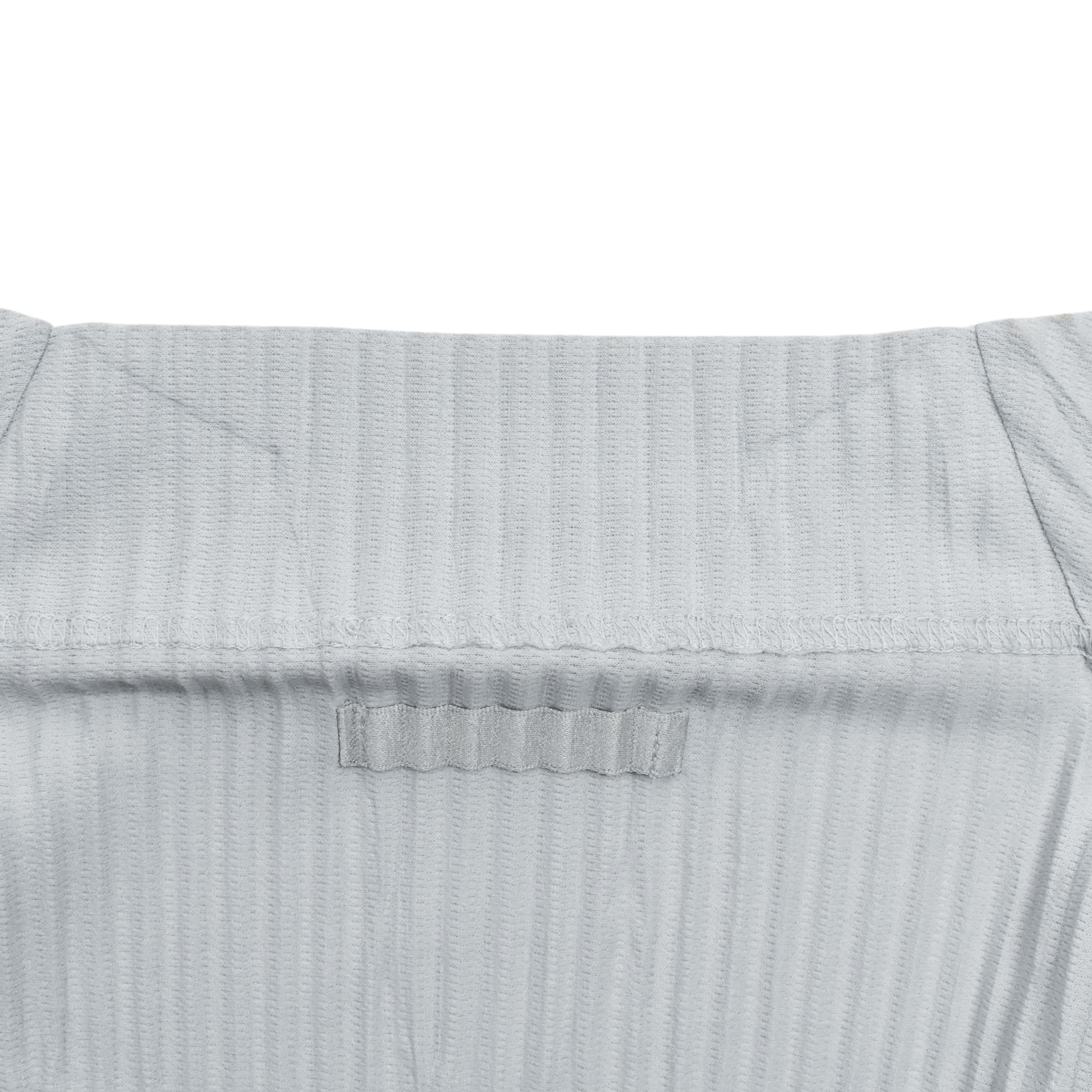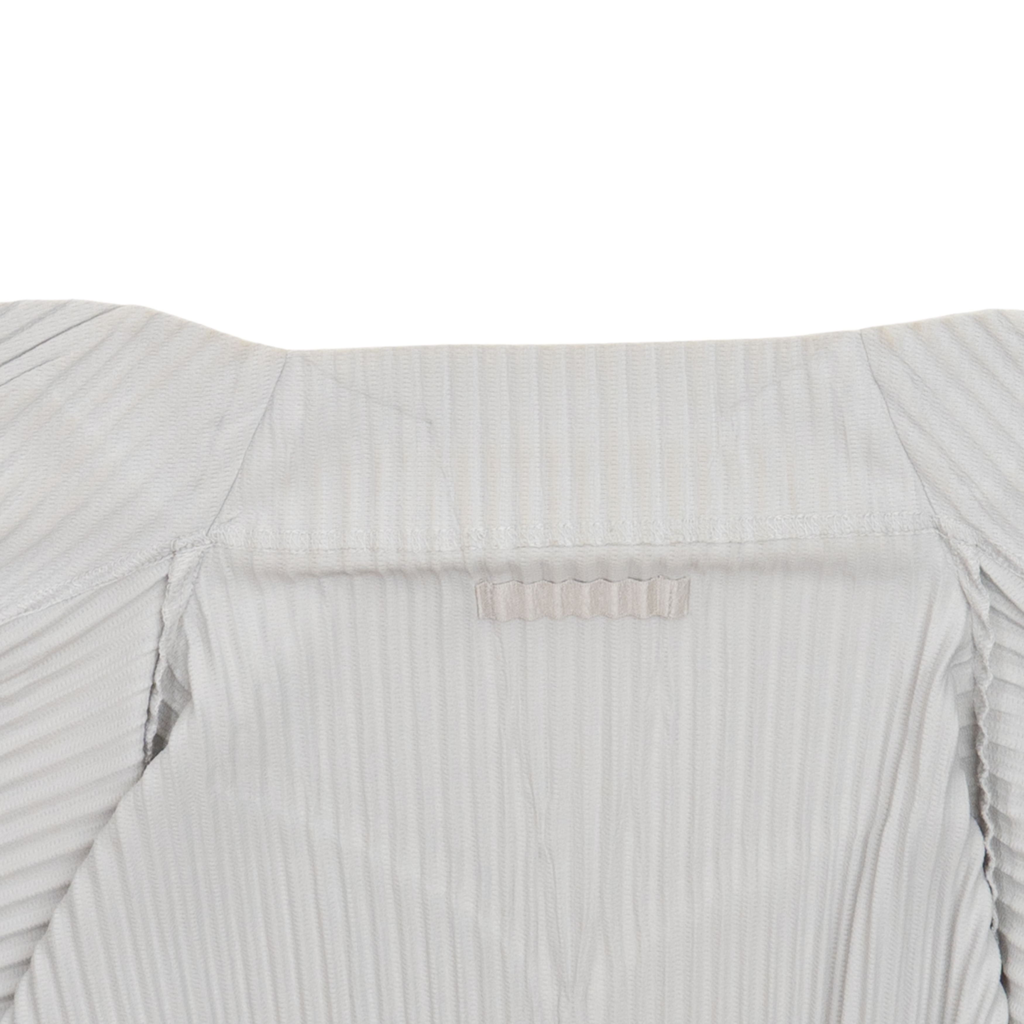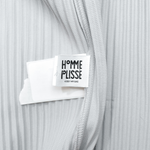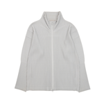 Homme Plisse Issey Miyake double-zip sweater in light grey signature pleated fabric with a front-zip opening in tonal hardware and a mock neck.