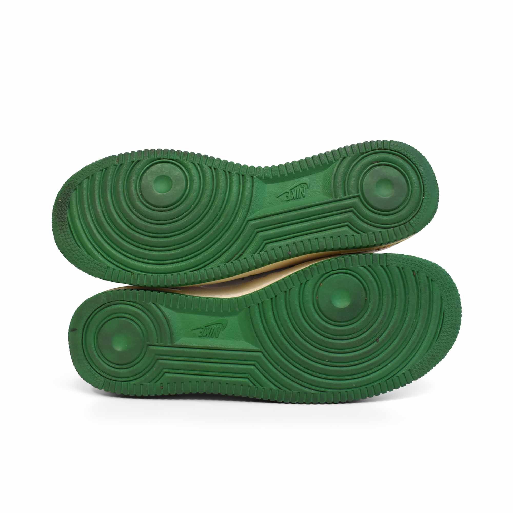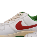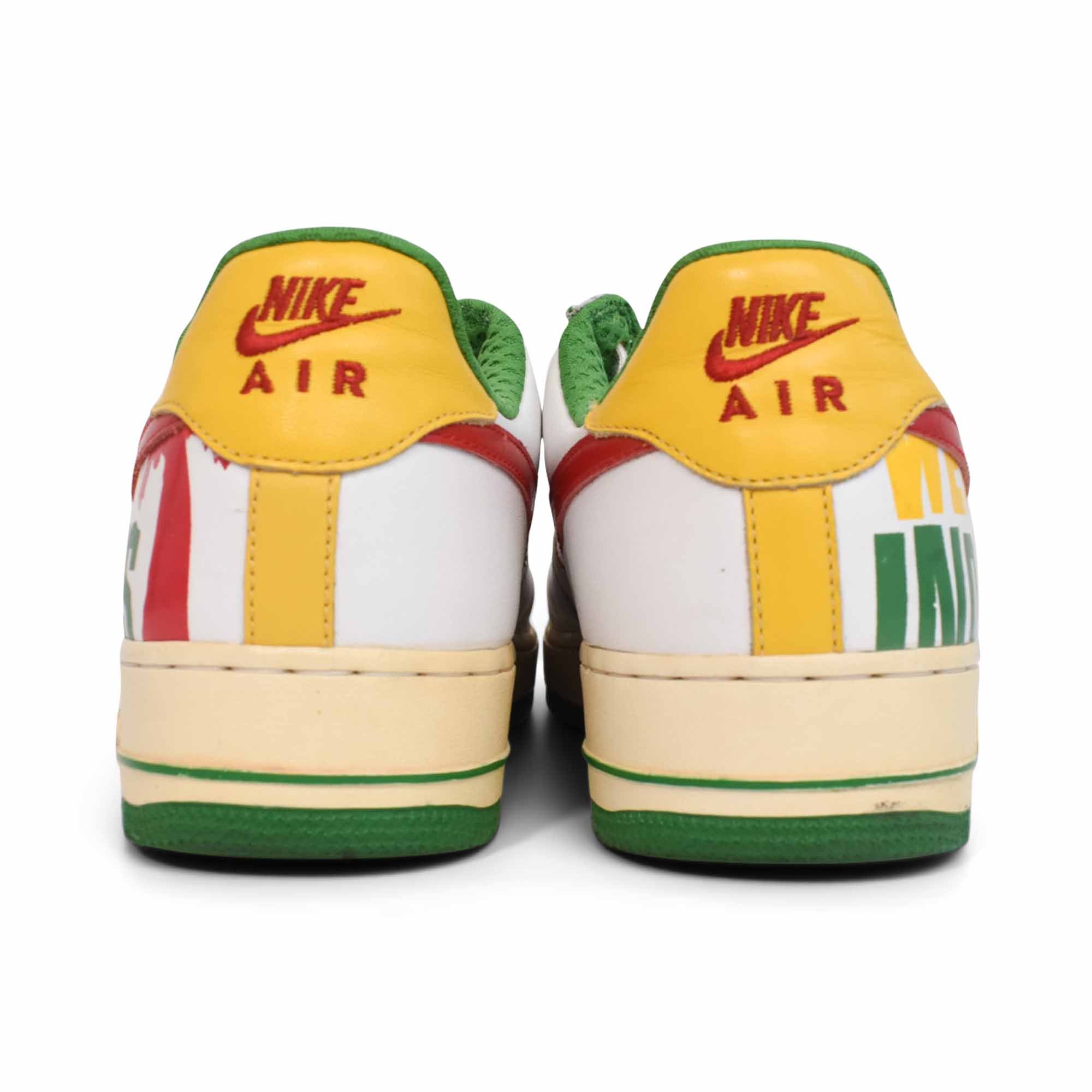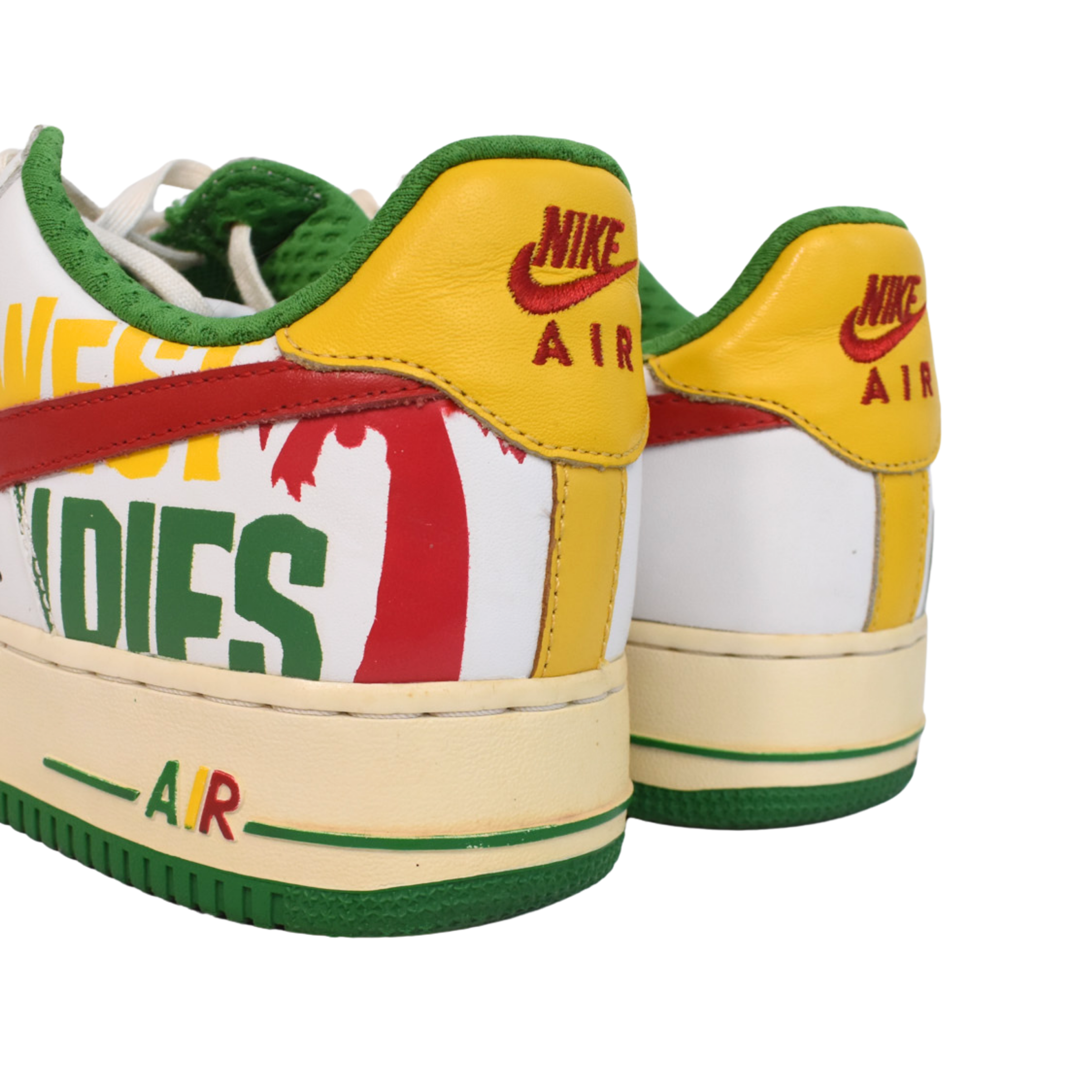 Nike low top 'Air Force 1' sneakers in white leather with red, green and yellow details. Features text that reads "WEST INDIES" in yellow and green across side, on tongue and lace aglets, a red 'Swoosh', green soles and lining, and yellow heel.