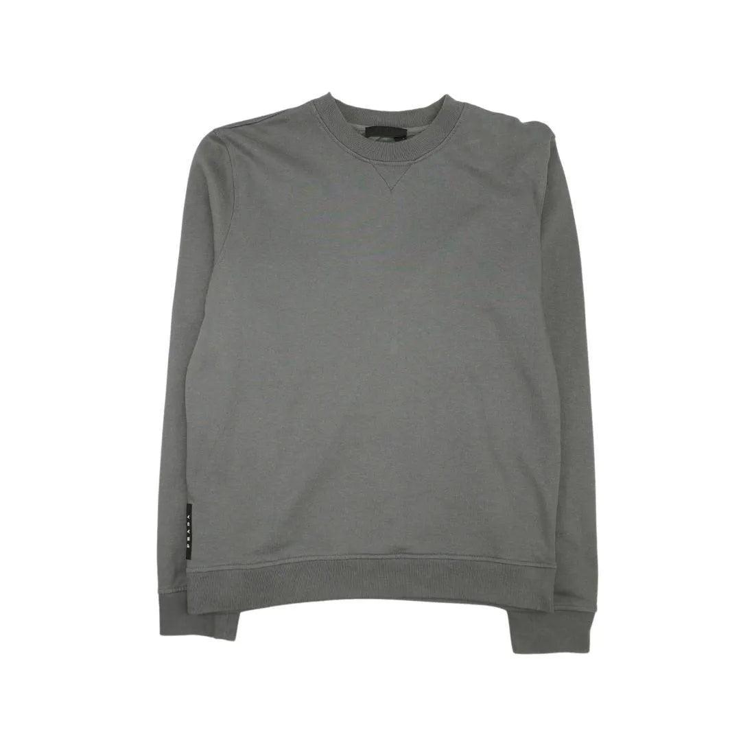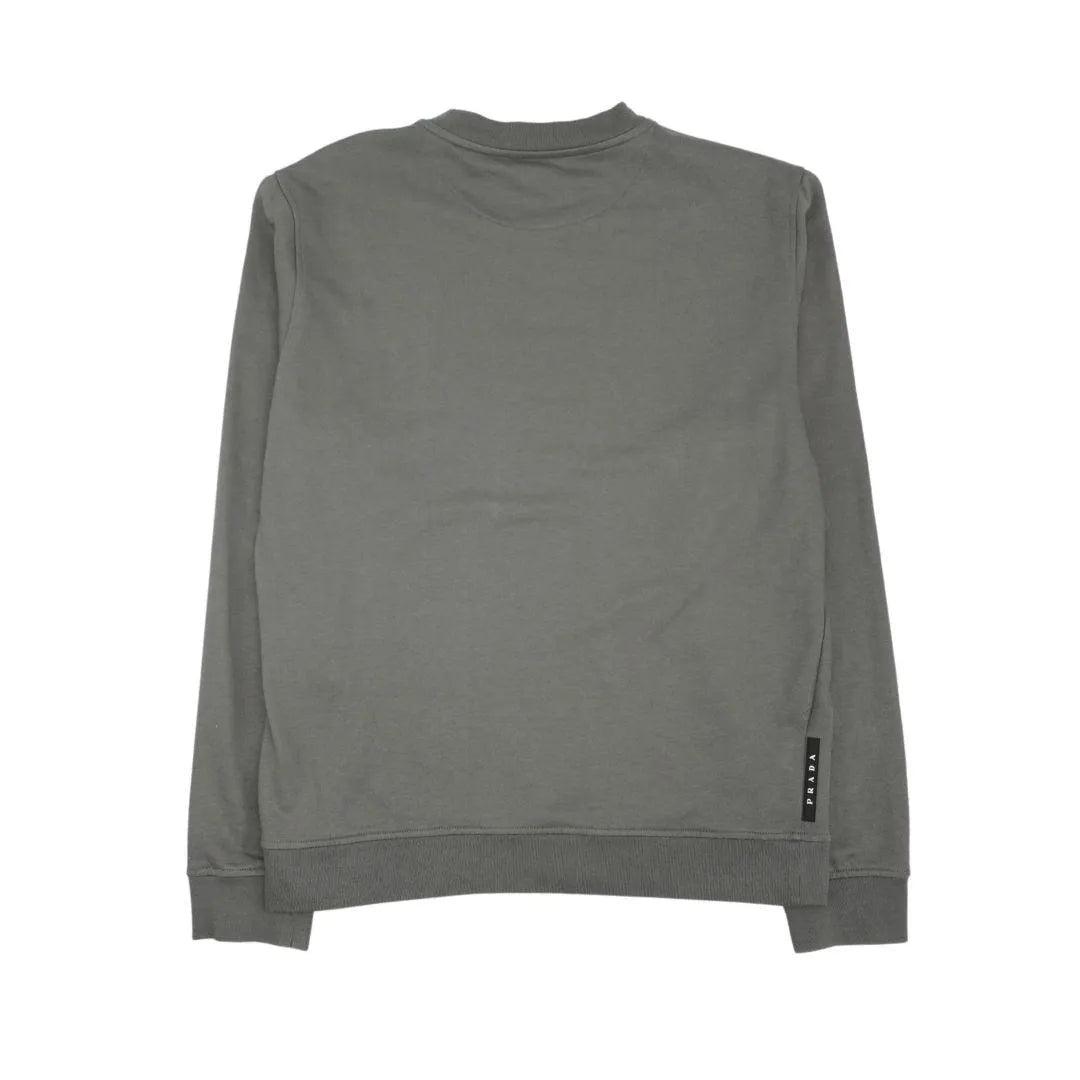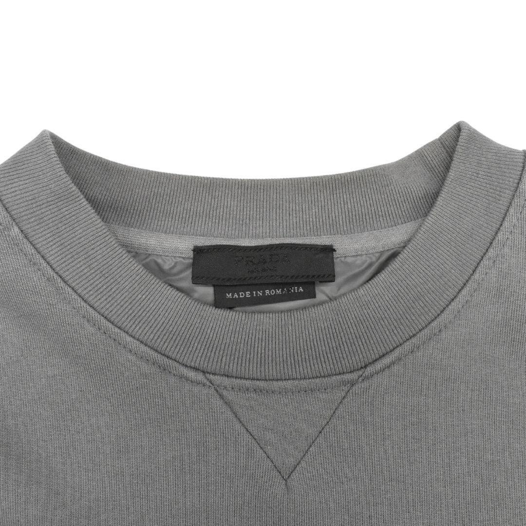 Prada long-sleeve crewneck in grey with a ribbed collar and hems. Features a black and white rubber logo on the right side.