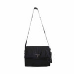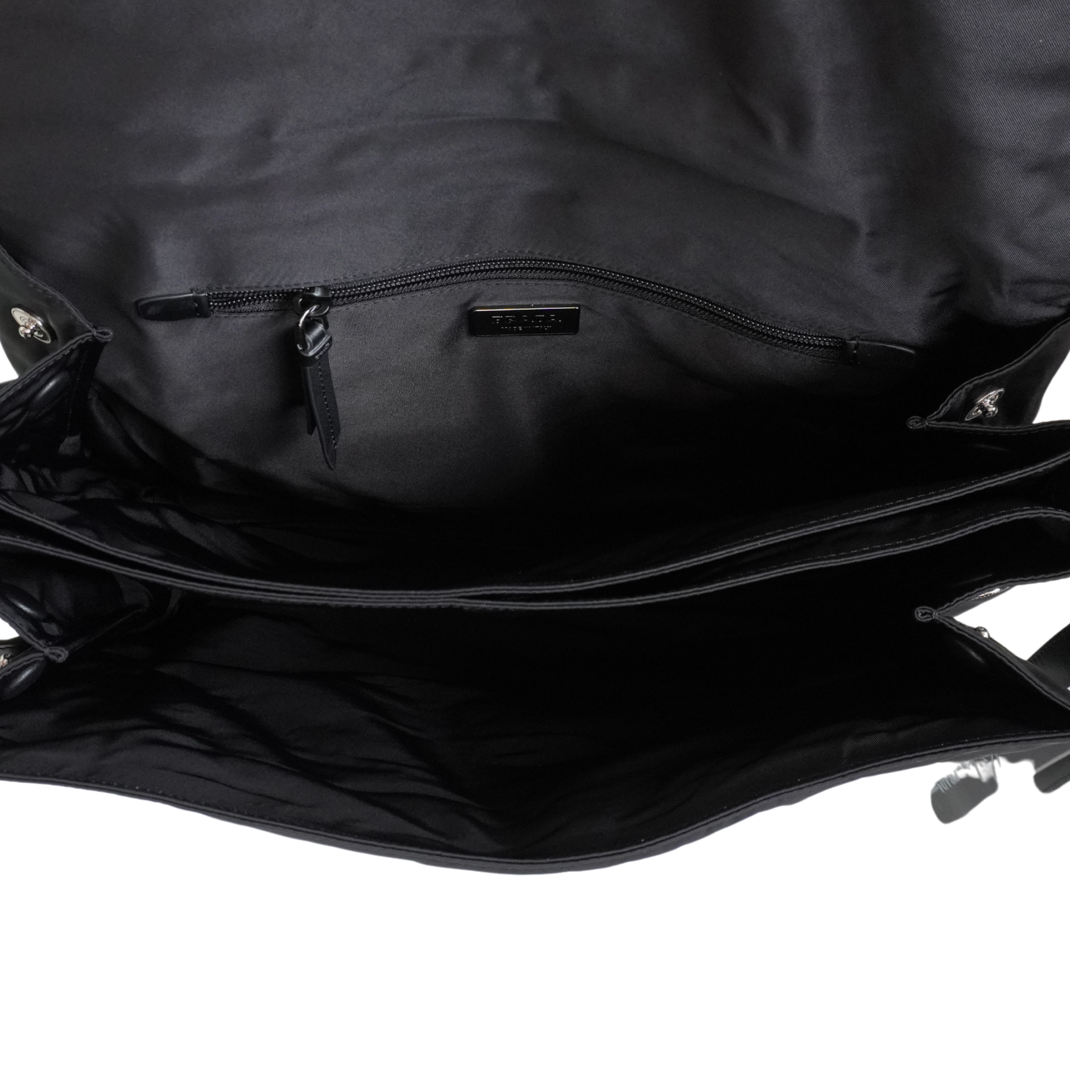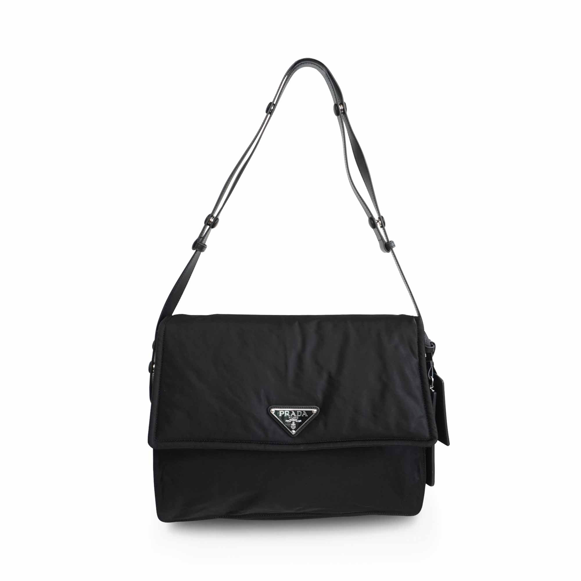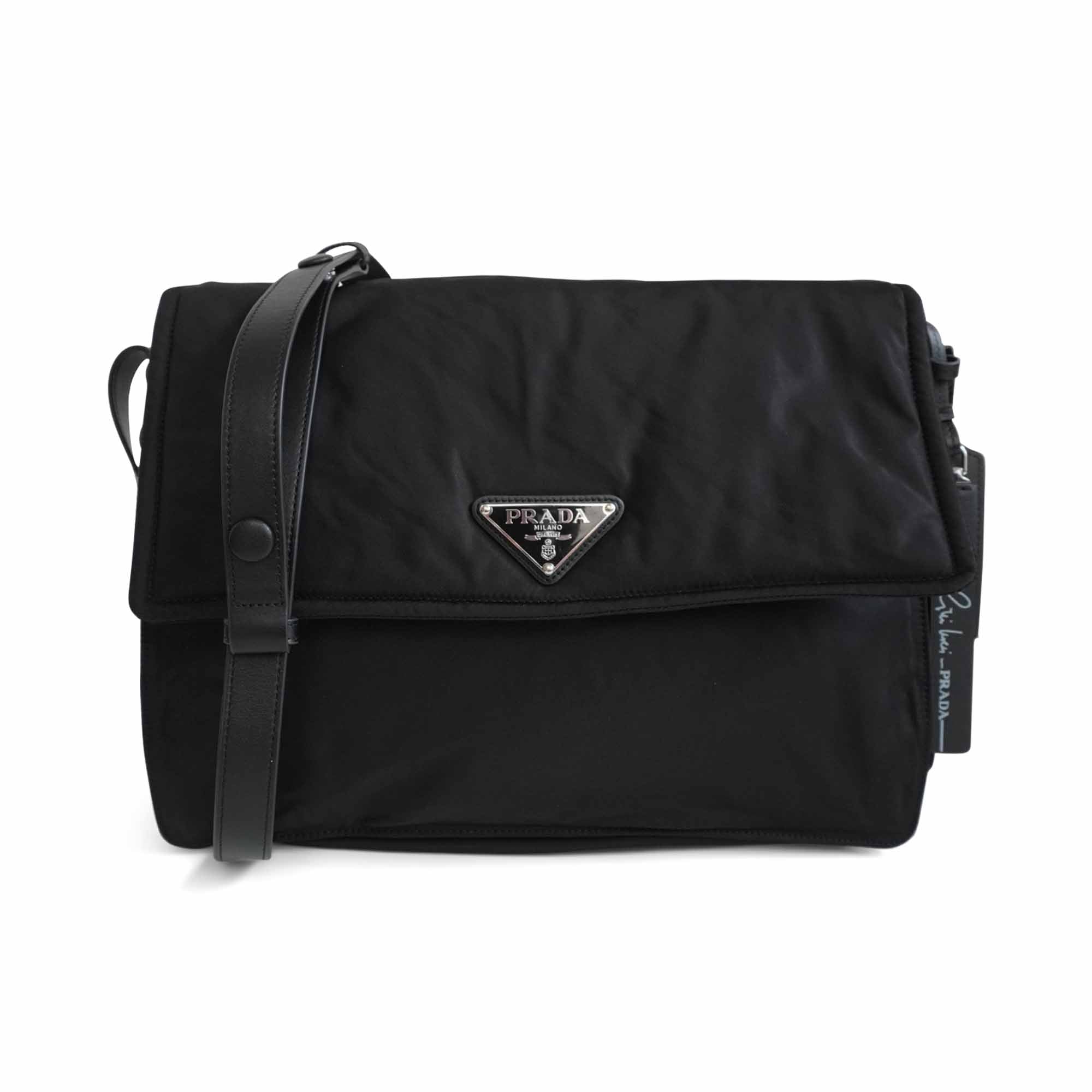 Prada messenger bag in black nylon with leather trim, an adjustable crossbody strap, a back zip pocket, and a signature silver metal triangle logo plaque on the front. The bag has a top flap opening with  a magnetic snap closure revealing dual interior compartments with a zip pocket.