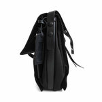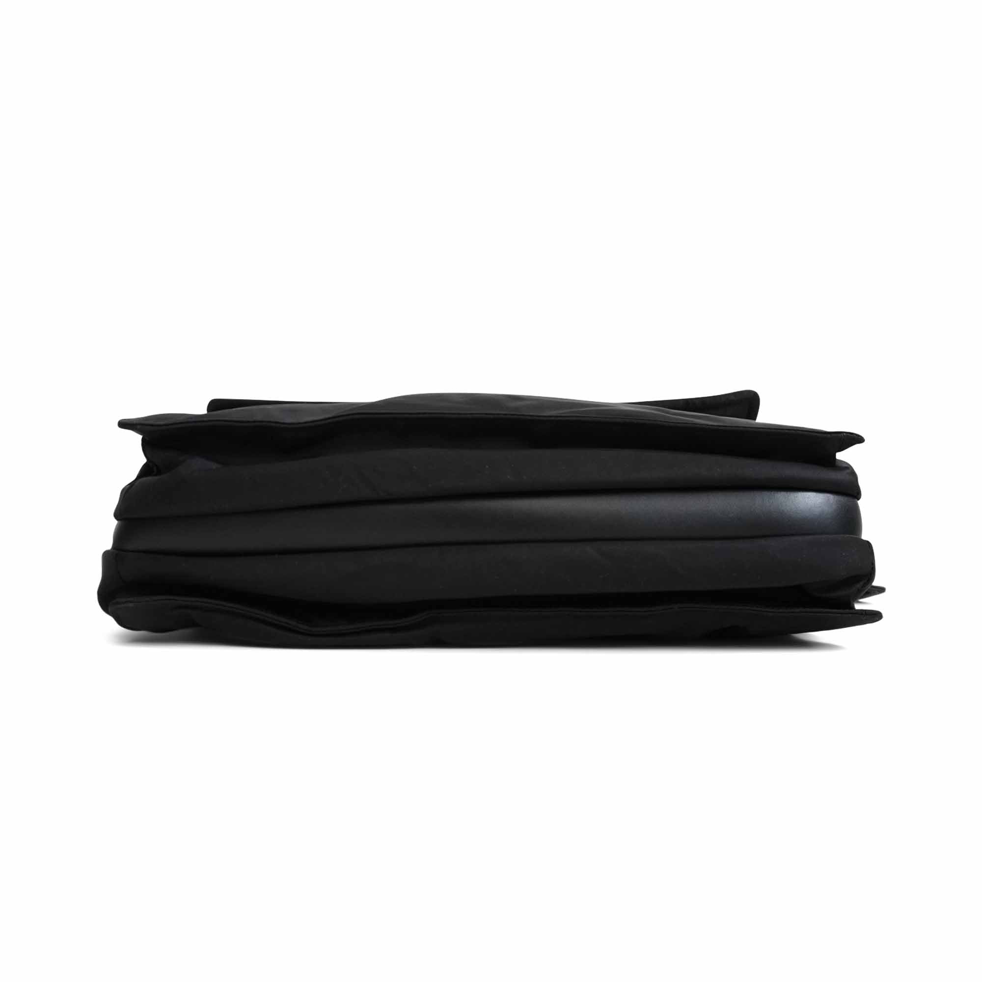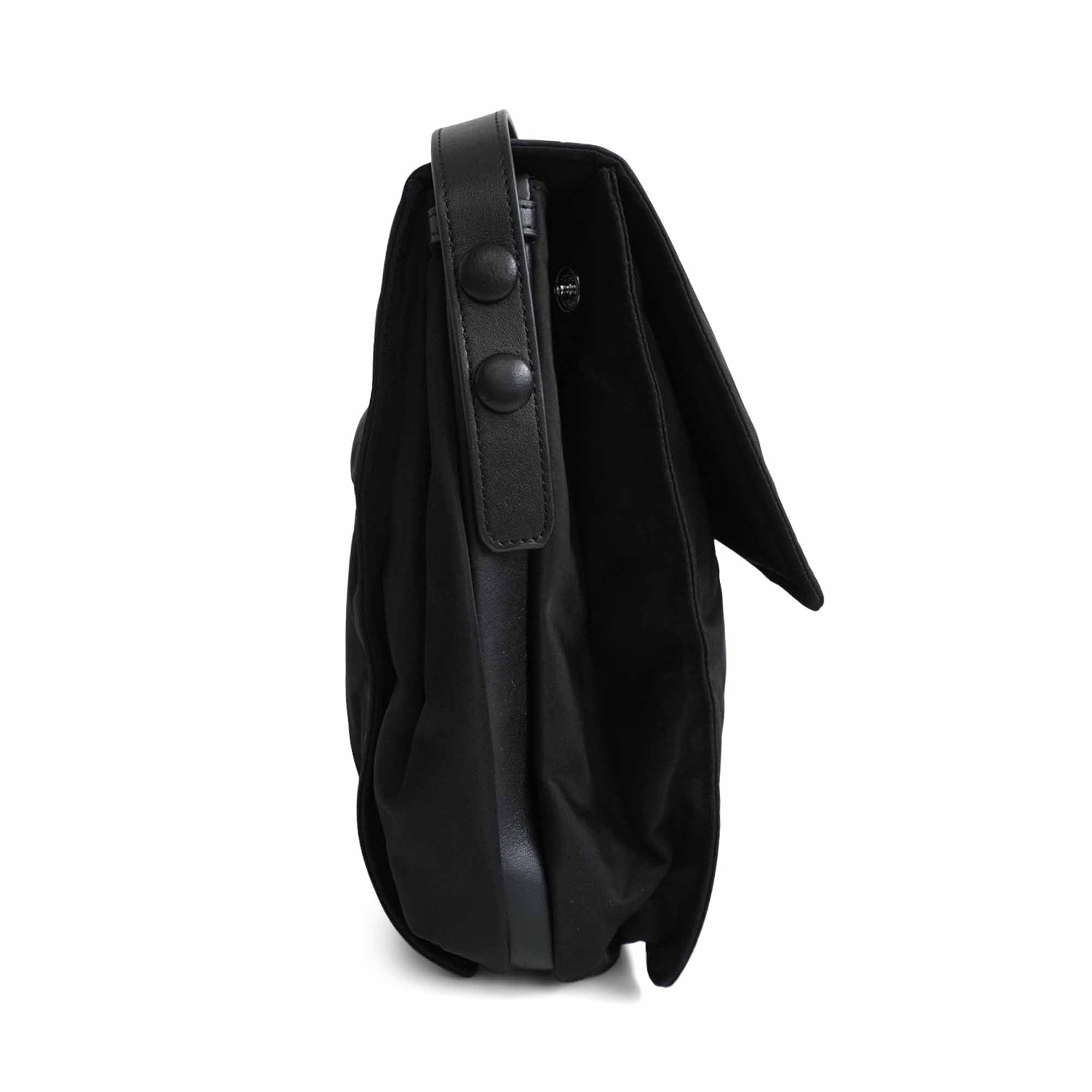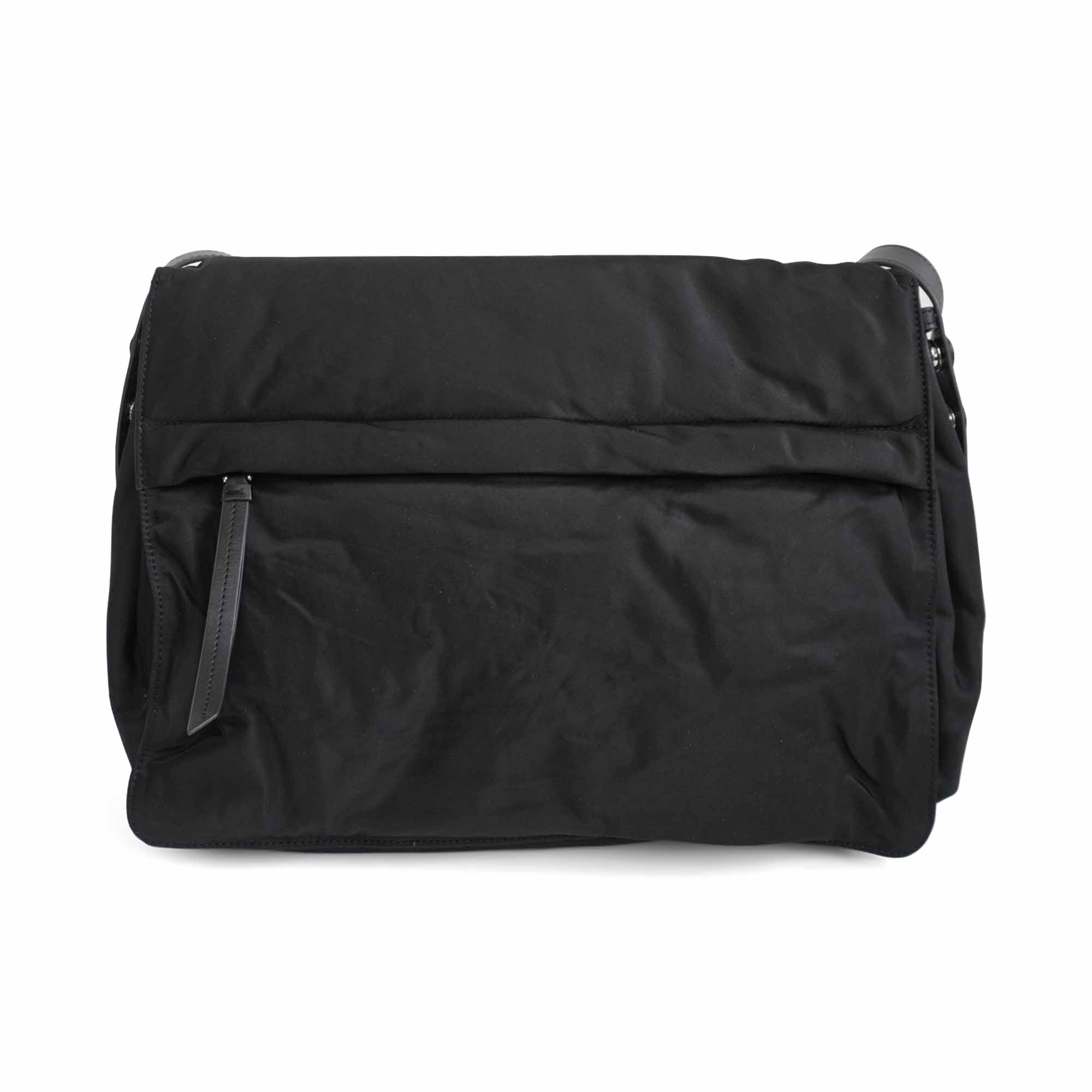 Prada messenger bag in black nylon with leather trim, an adjustable crossbody strap, a back zip pocket, and a signature silver metal triangle logo plaque on the front. The bag has a top flap opening with  a magnetic snap closure revealing dual interior compartments with a zip pocket.