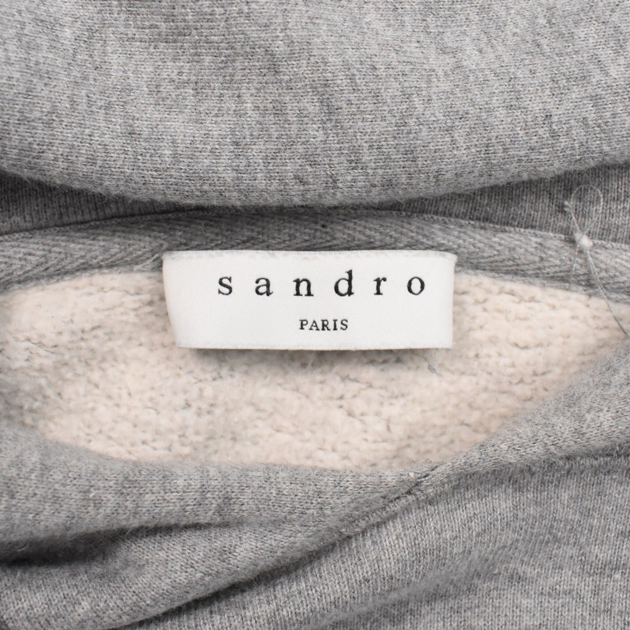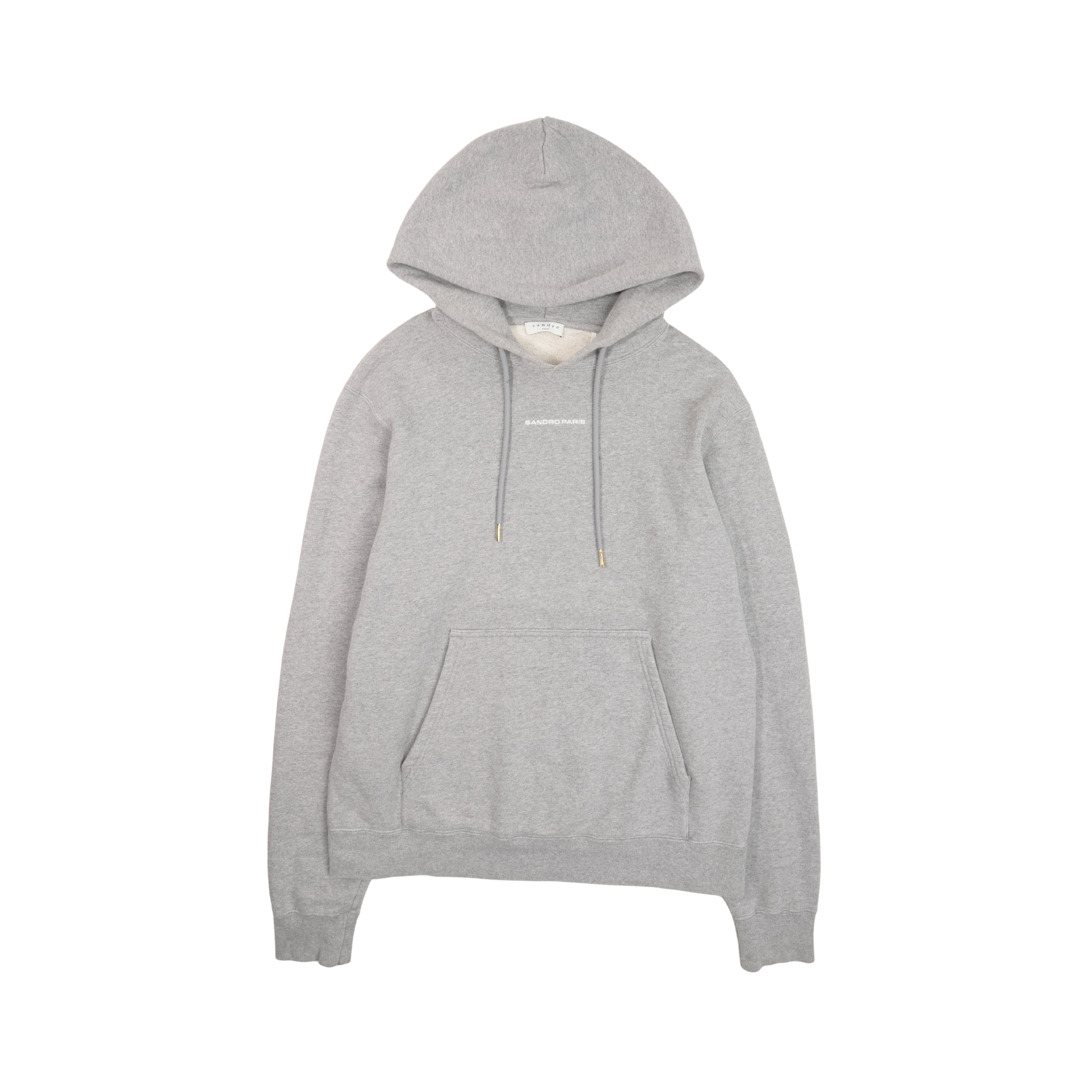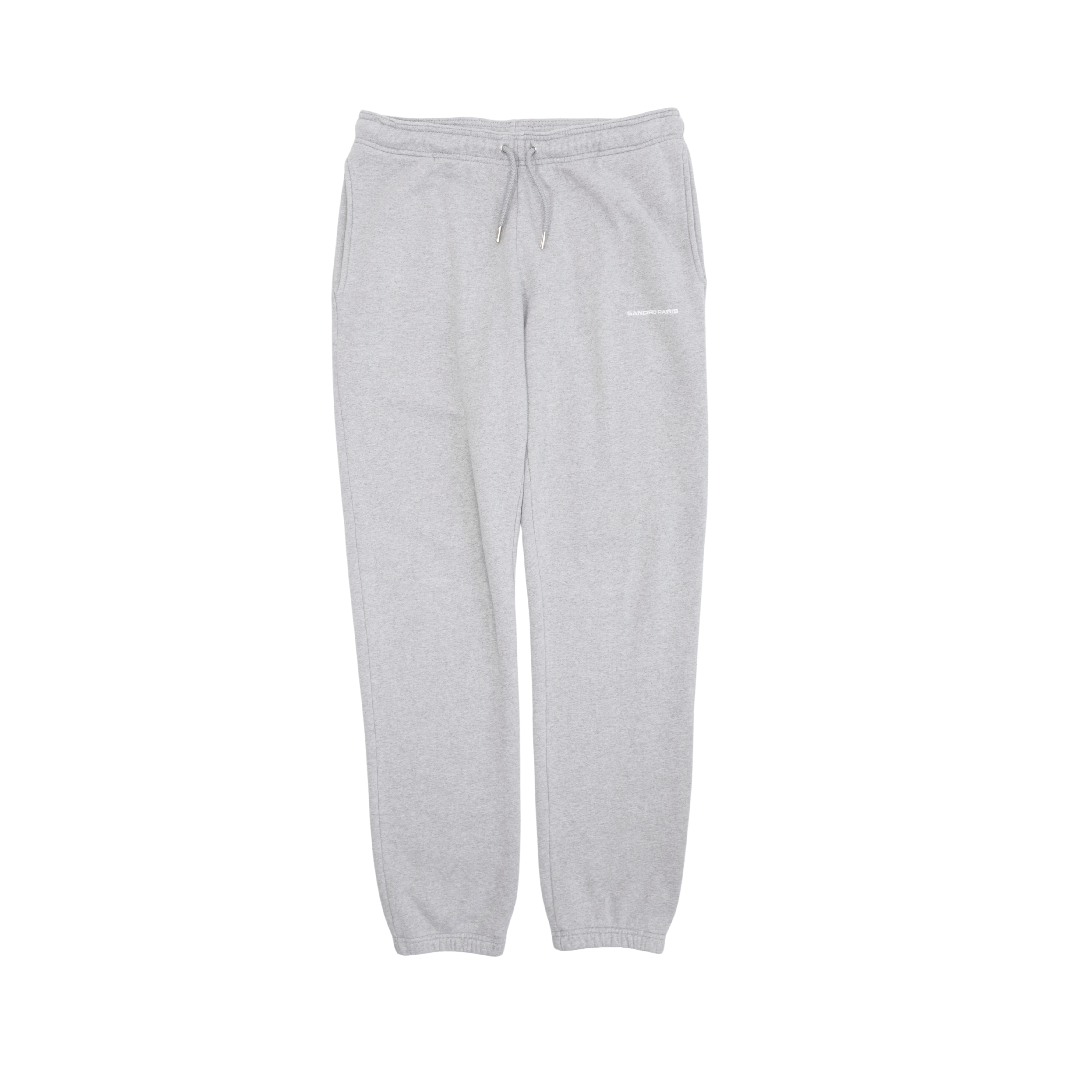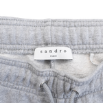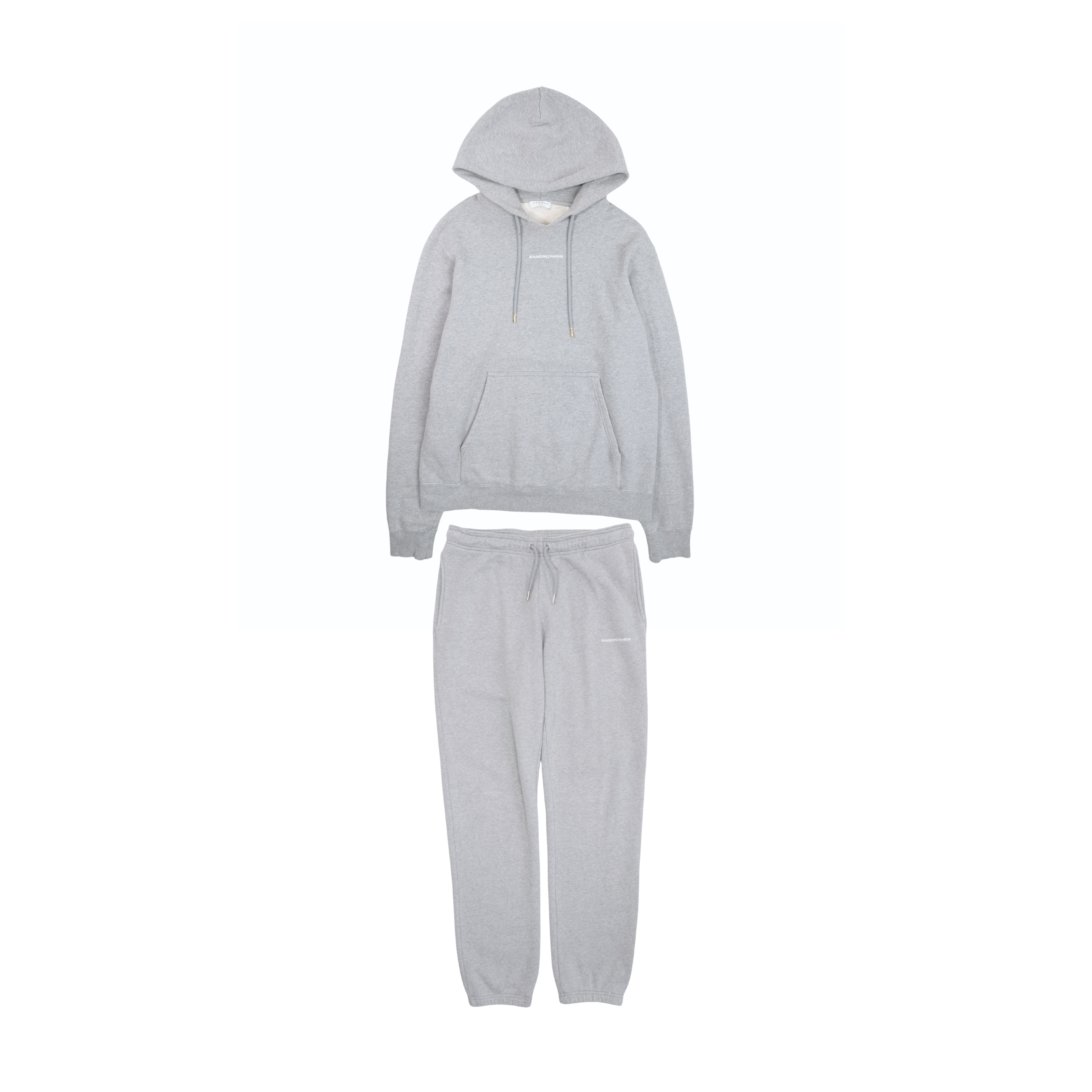 Sandro sweatsuit in light heather grey cotton with a matching hoodie and joggers. Featuring white logo across the chest and small logo on the pants.