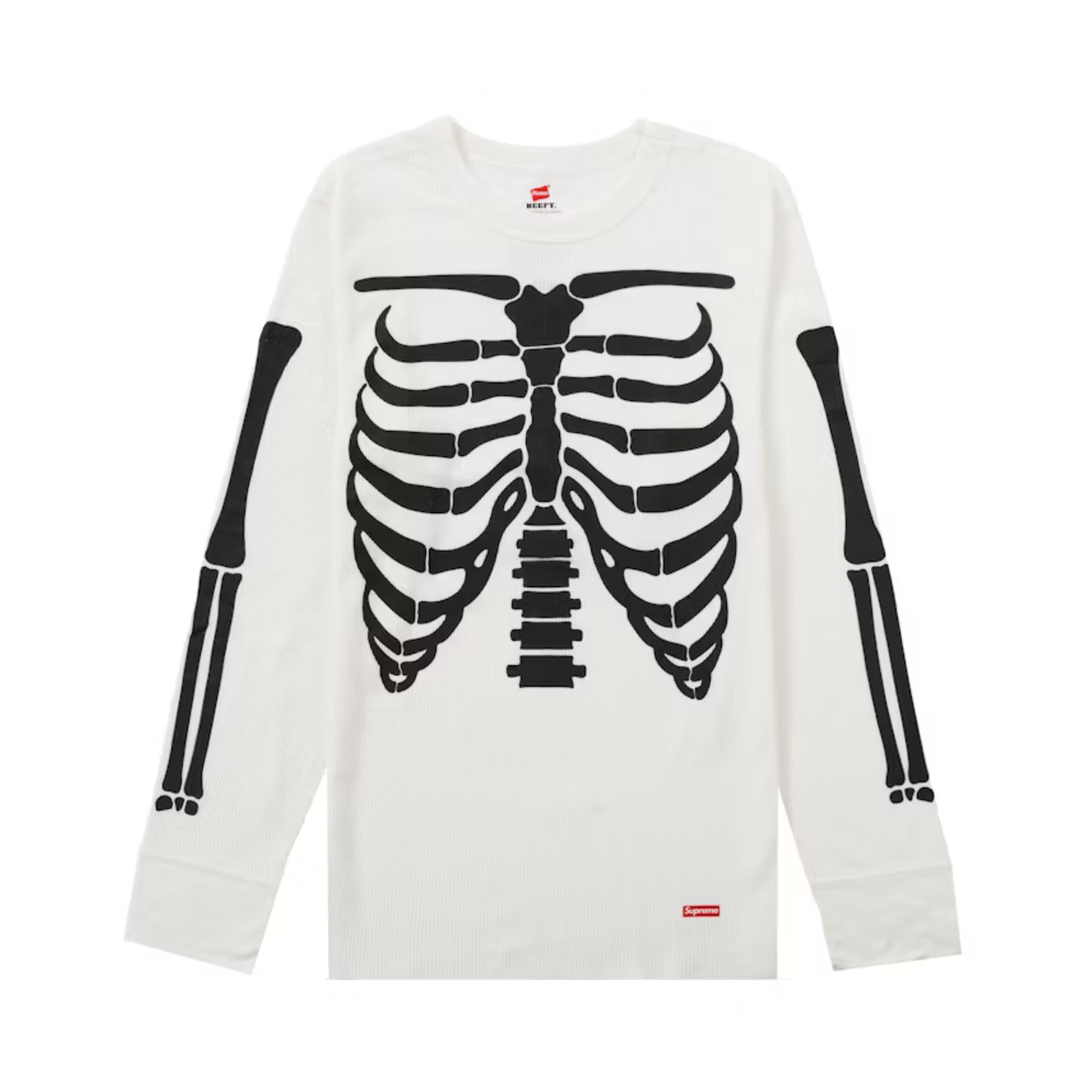 Supreme x Hanes 'Bones' thermal crew top in white waffle knit cotton with a black skeleton bones graphic.