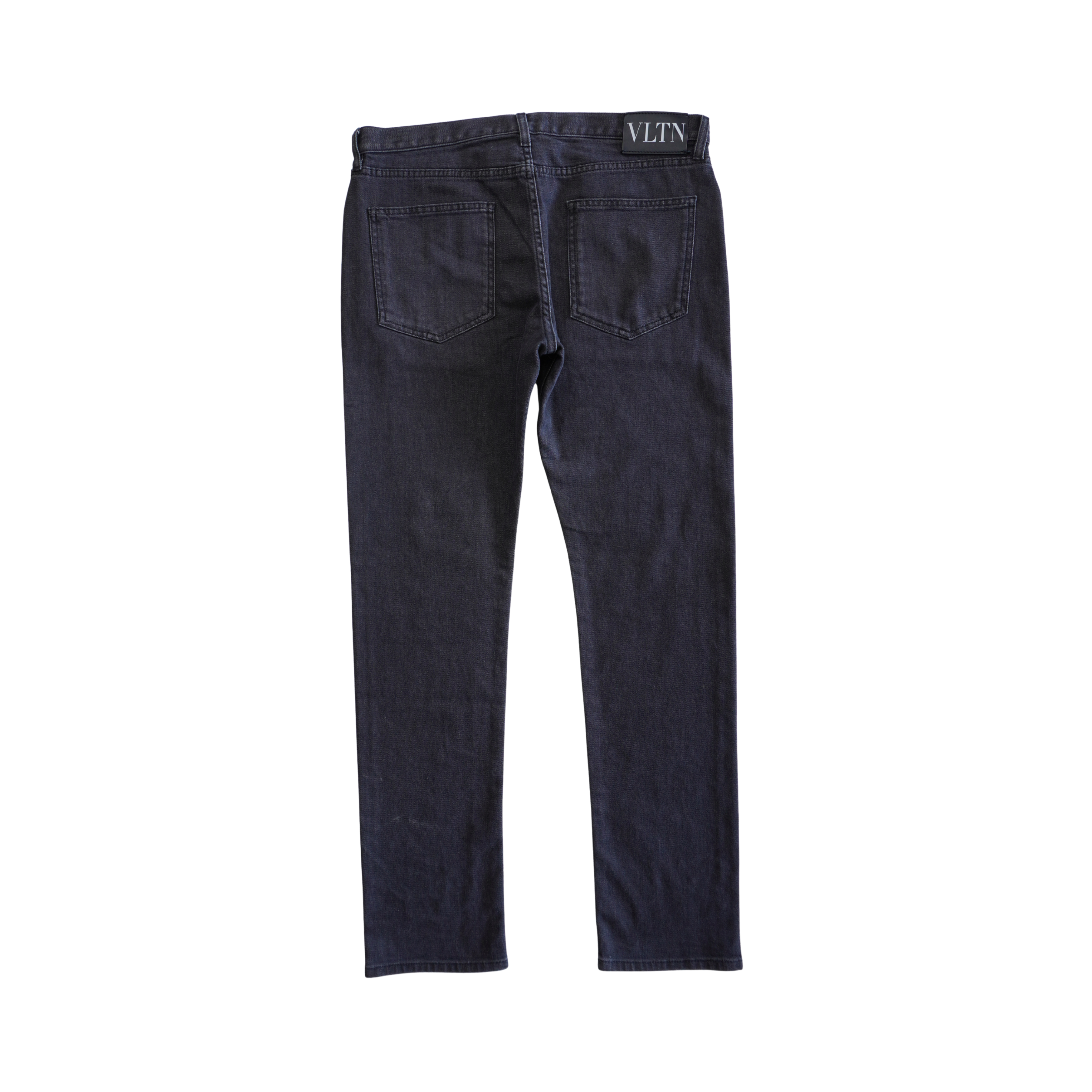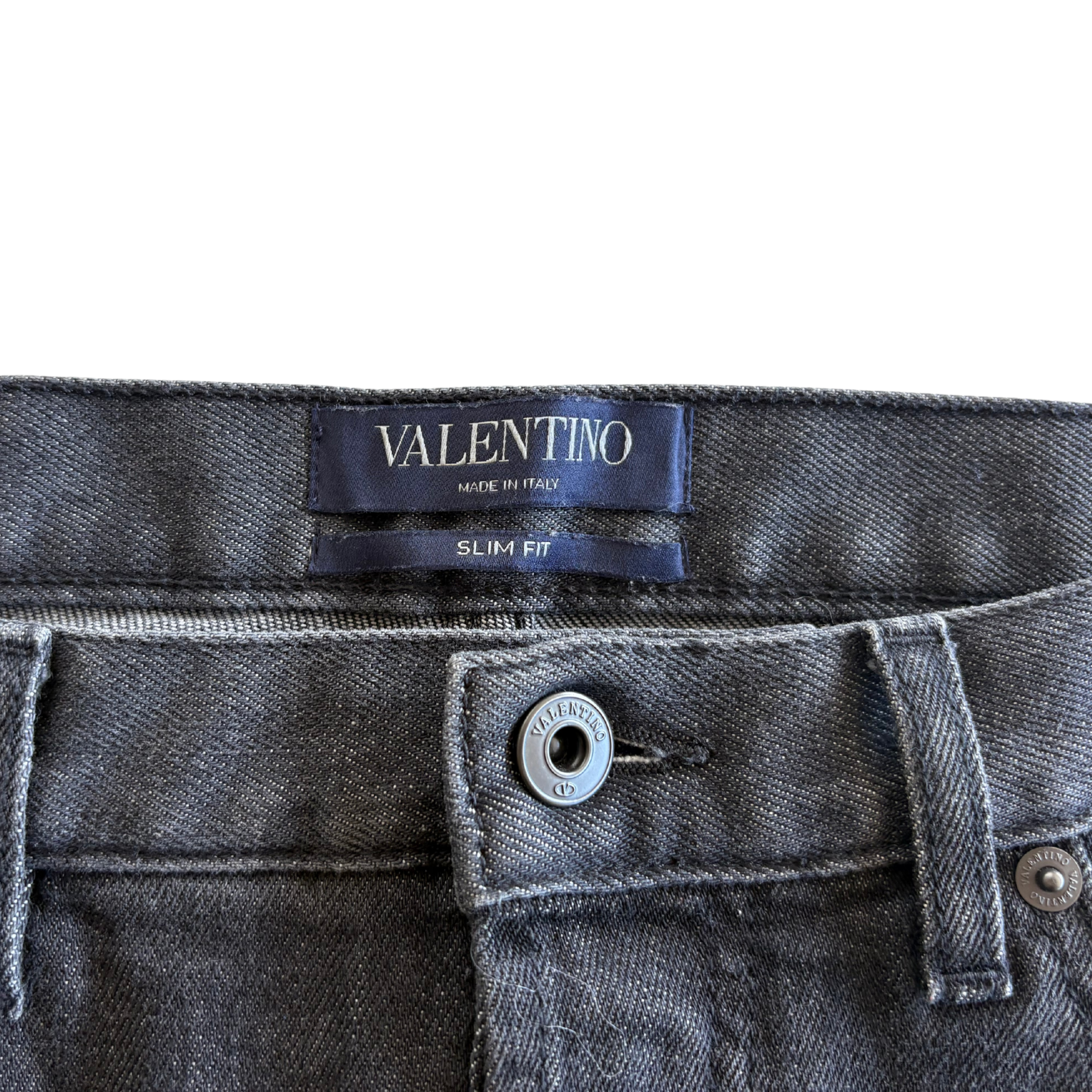 Valentino slim-straight jeans in washed black cotton with five-pocket styling and a black leather waistband patch and gunmetal hardware.