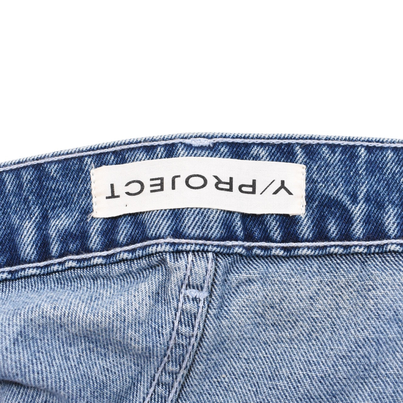 Y Project straight leg jeans in medium blue washed denim with an exaggerated high waist with an asymmetrical fold-over design, silver button hardware, and a large brown leather logo patch. From the evergreen collection.