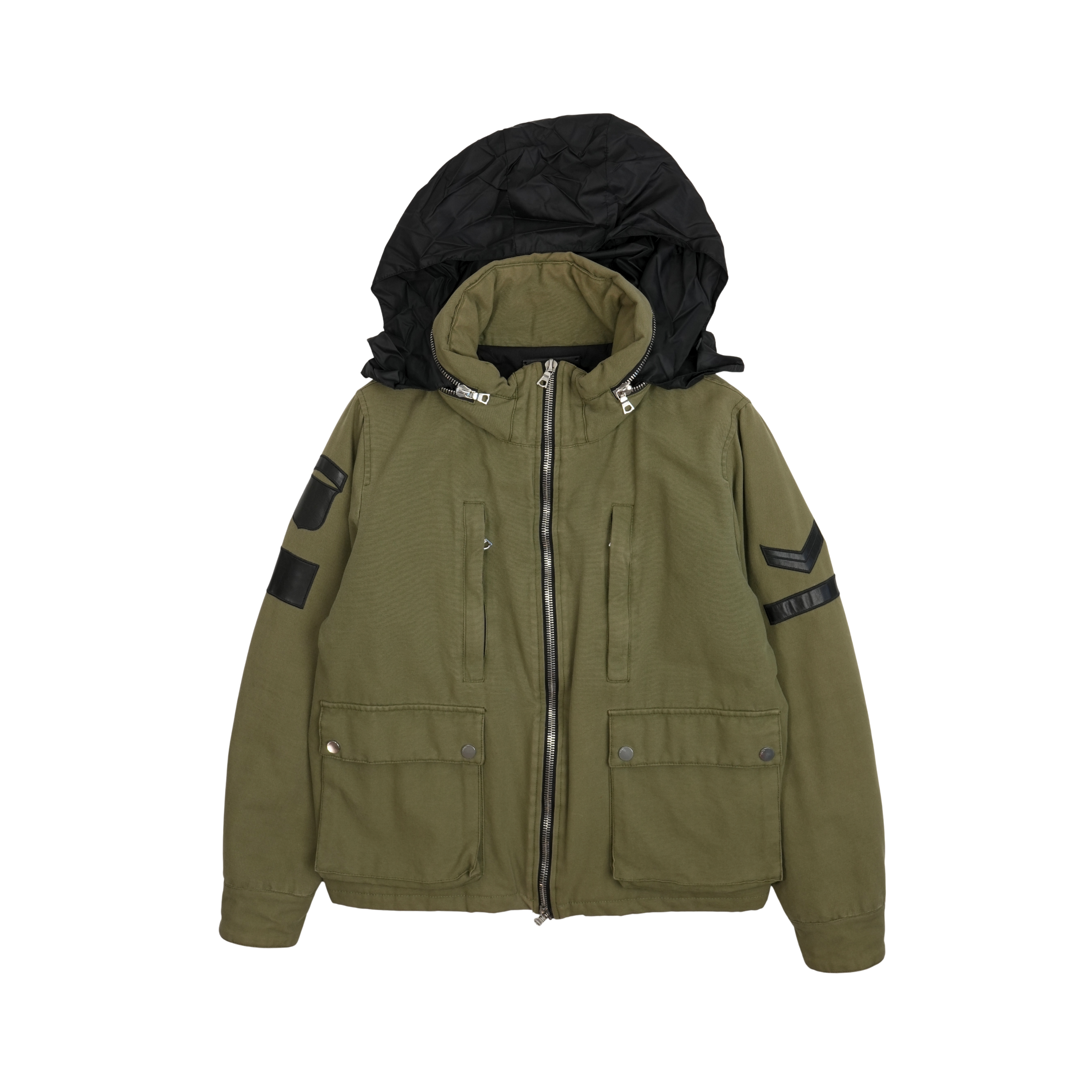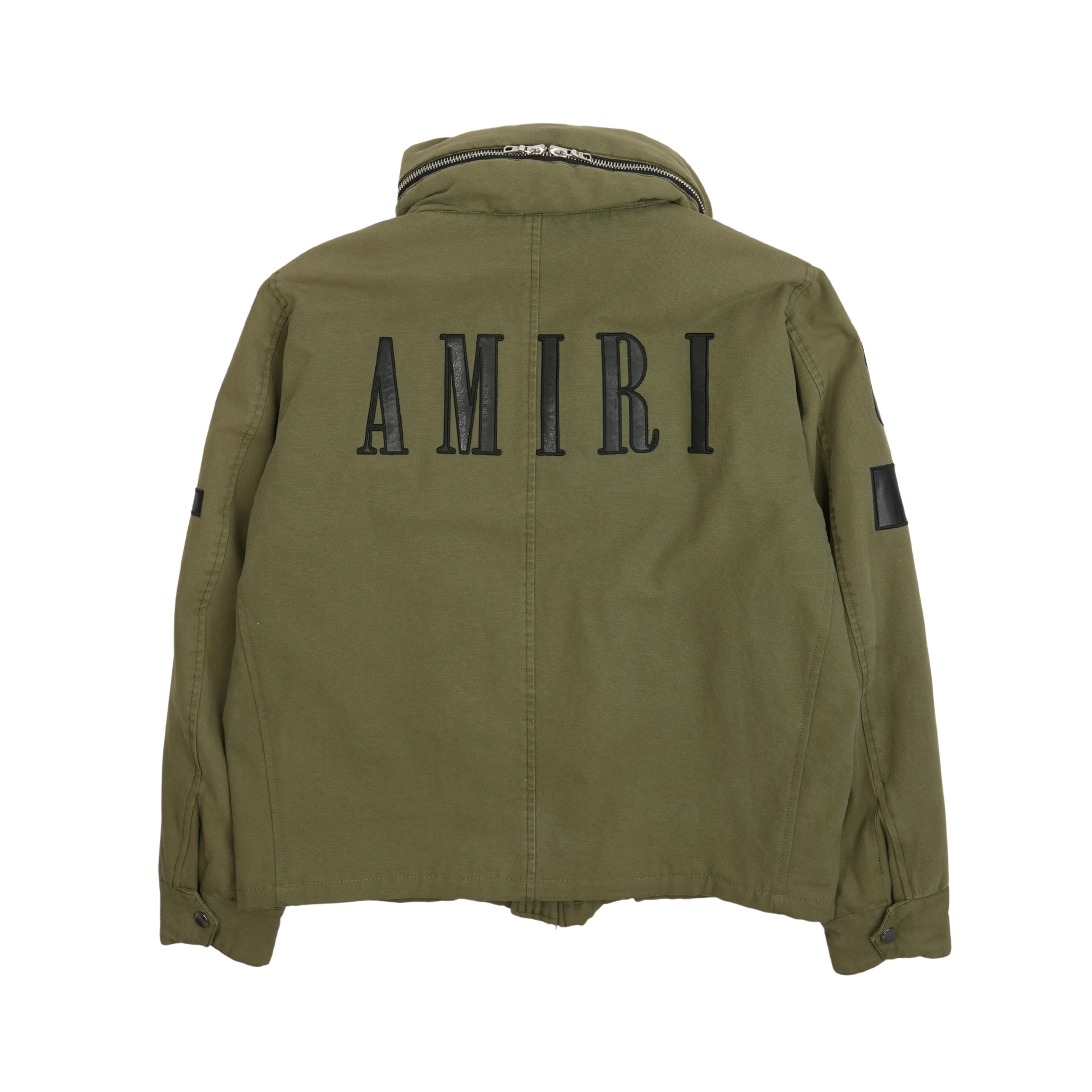 Amiri military style jacket in army green canvas with silver hardware. Features a convertible hood that zips into collar, double zip closure down front, front flap pockets with snap closure, zipper welt chest pockets and black leather patch details on arm and logo leather patches across back.