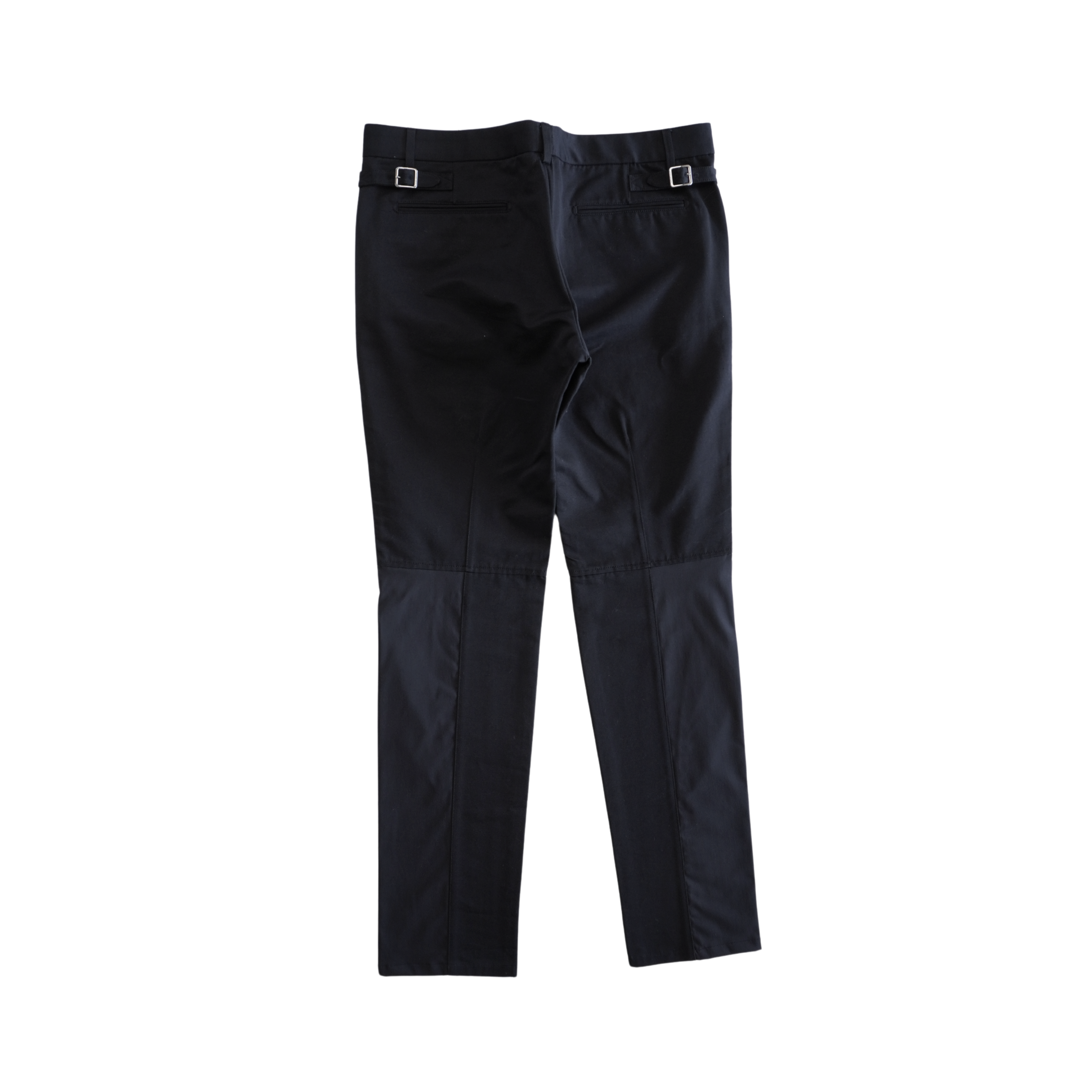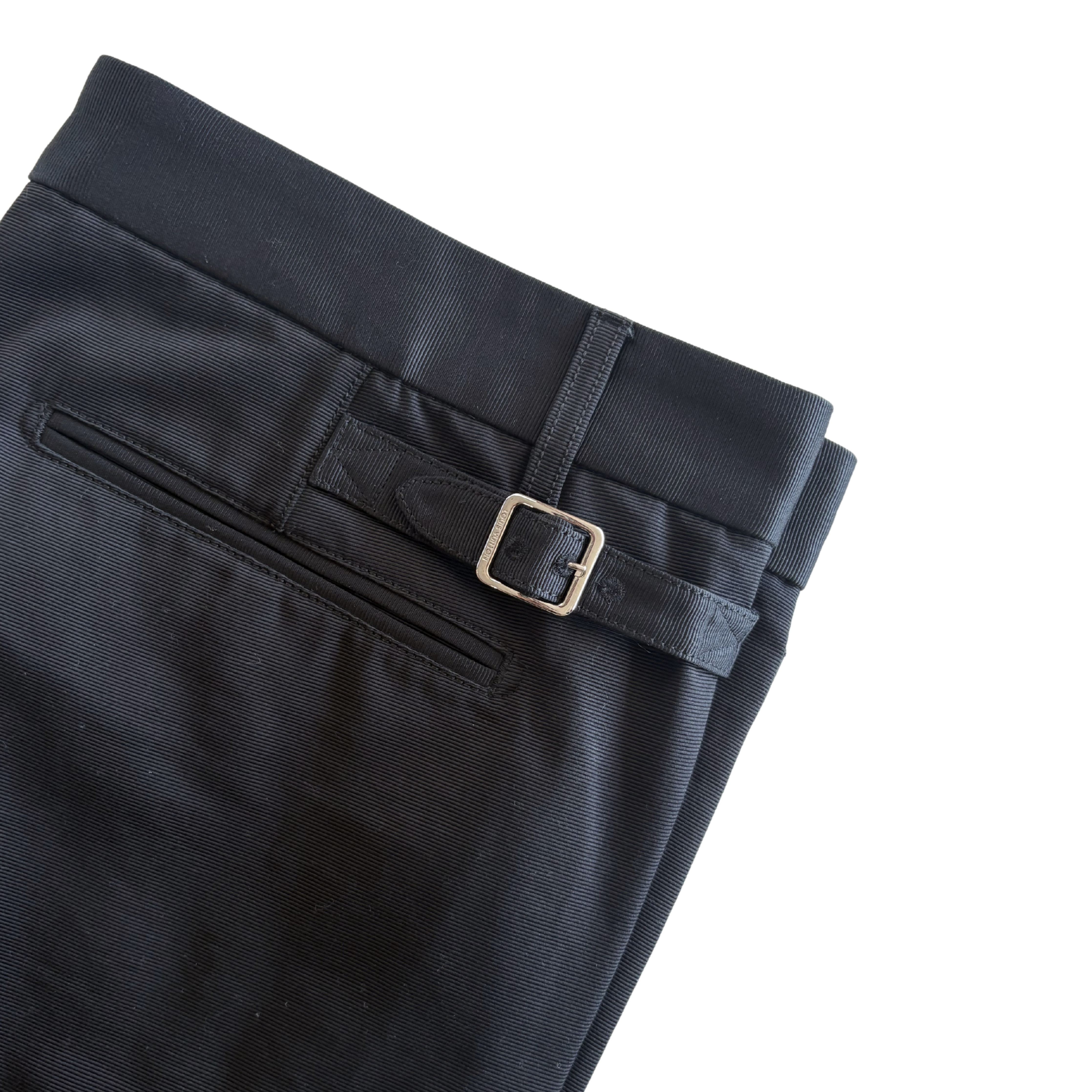 Louis Vuitton slim fit pants in black cotton with nylon panels on the leg, side buckle details in silver hardware, and a wood centre button.