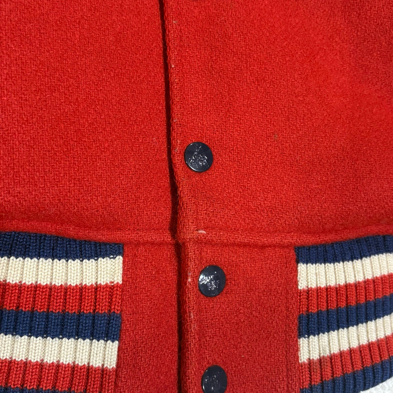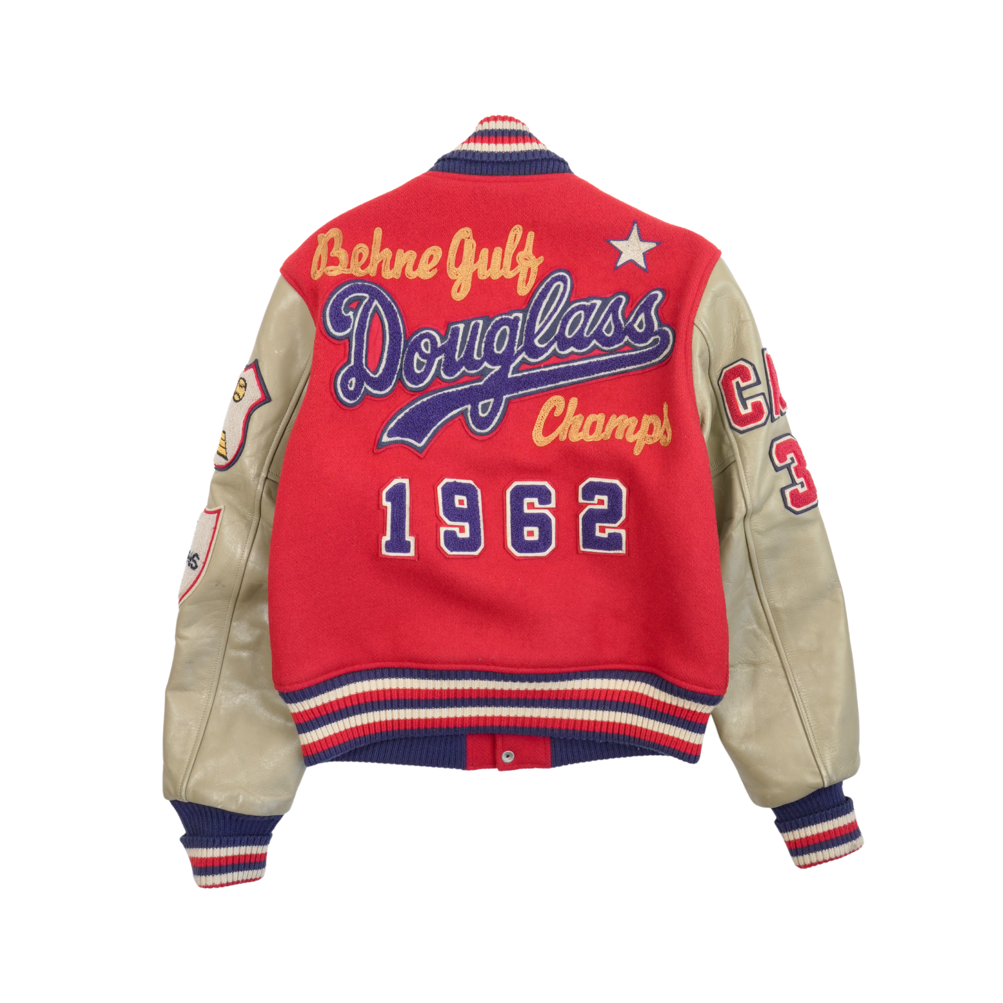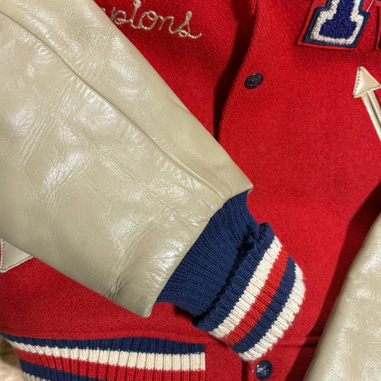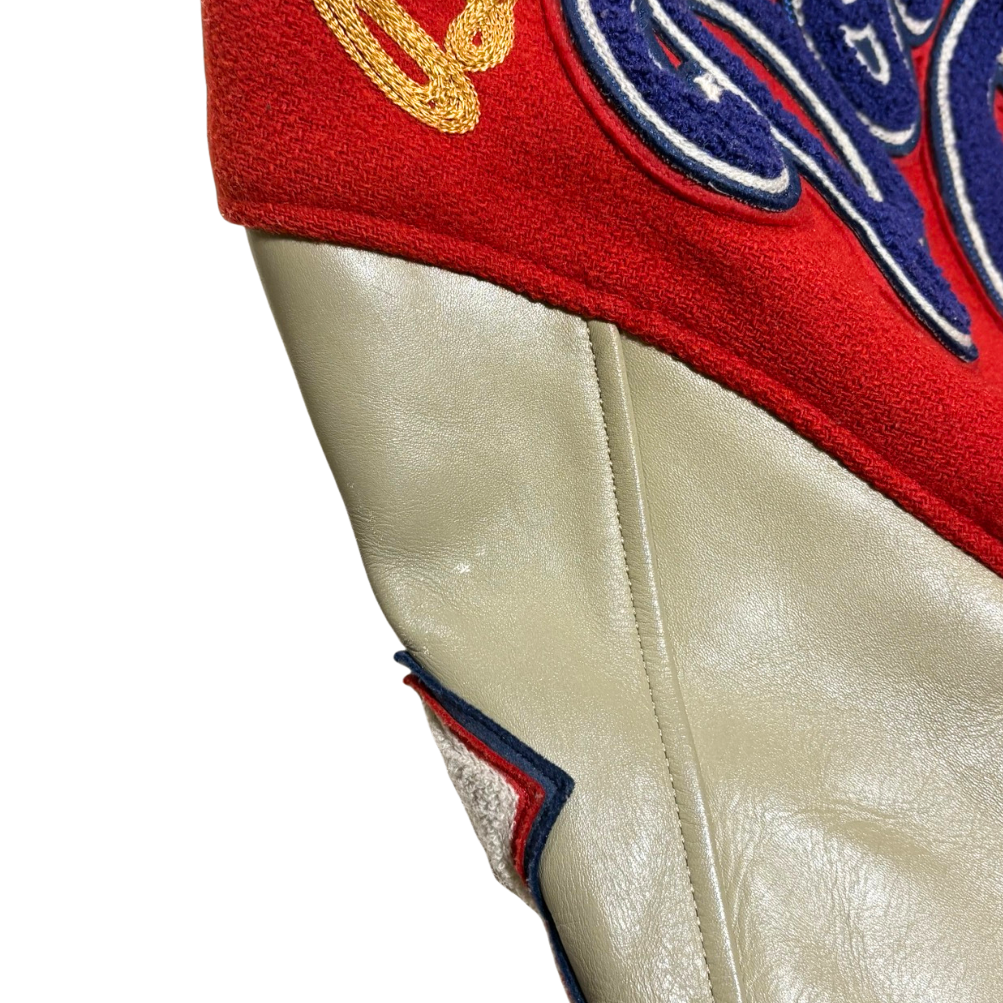 Style Eyes 'Douglas Eagles Champions' varsity jacket in red wool with taupe leather sleeves, terry cloth patches throughout, and red, cream and blue ribbed trim. Features slip pockets and large patch, embroidered lettering on the back and snap button closure.