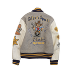Whitesville Letterman 'Silver Spur' varsity jacket in grey wool with cream leather sleeves and yellow, black and white terry cloth patches with large cowboy 'Silver Spur' graphic on the back. Features yellow and navy striped ribbed trim, slip pockets and a satin lining.