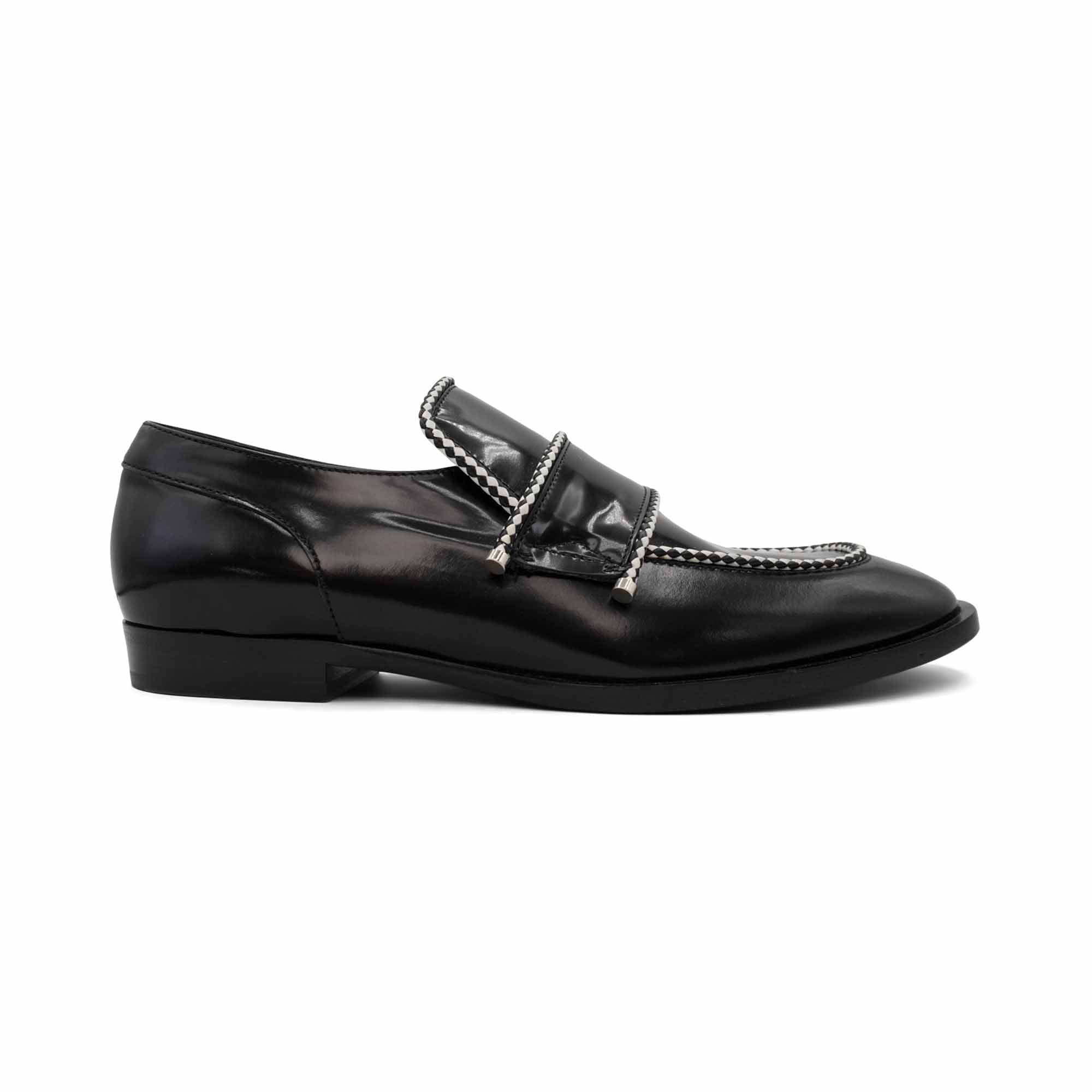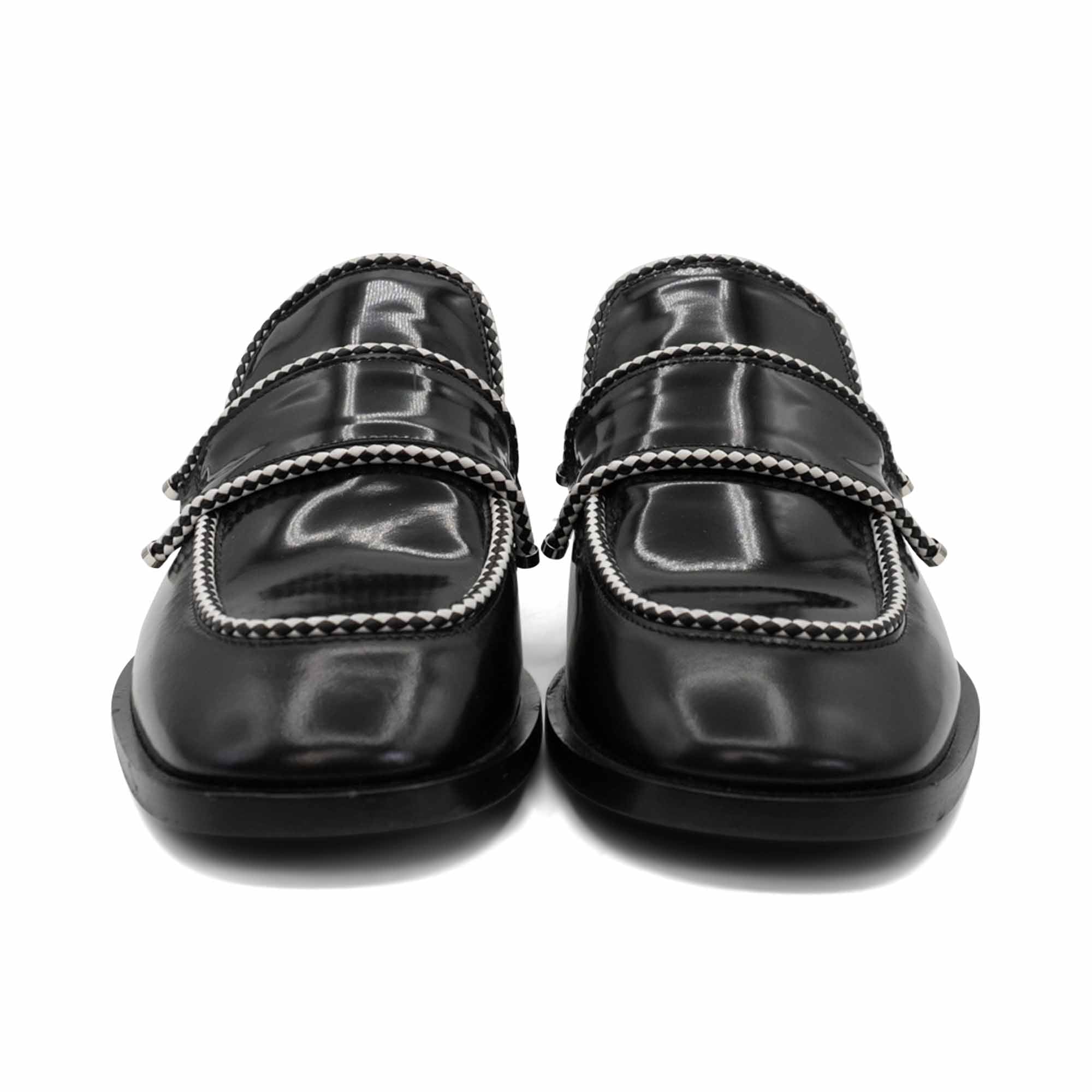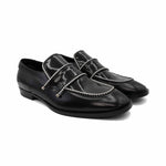 Jimmy Choo 'Talib' slip on loafers in black leather with black and white rope piping with silver details.