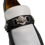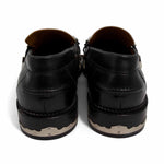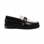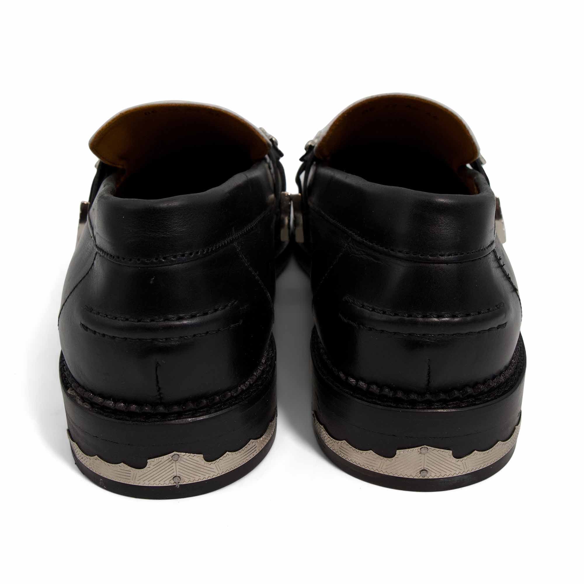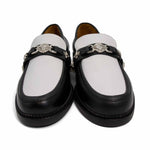 Toga Virilis SSENSE Exclusive 'Hard' loafers in black leather with white tongue. Features silver metal strap buckle detail and silver plaque design on back of heel.