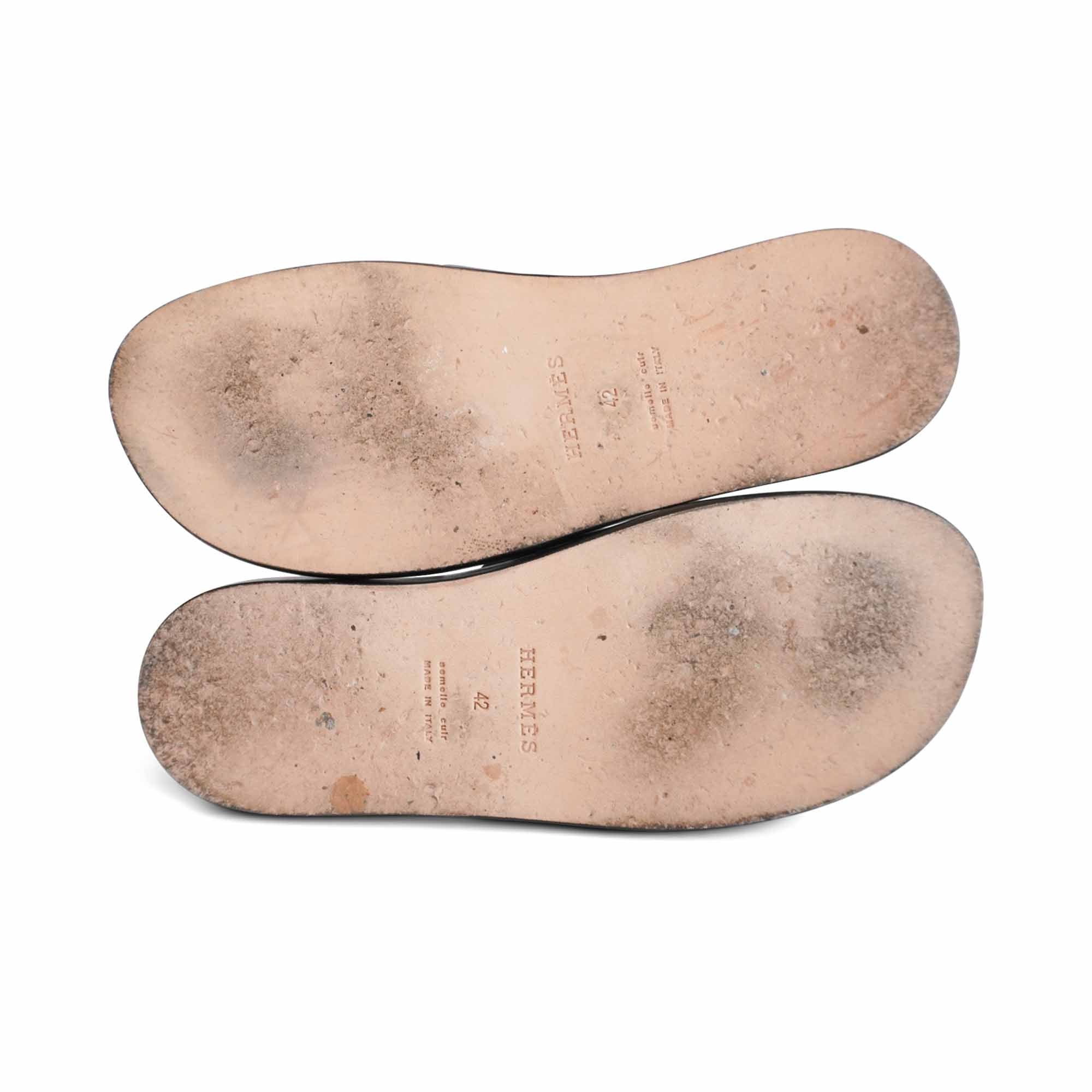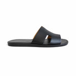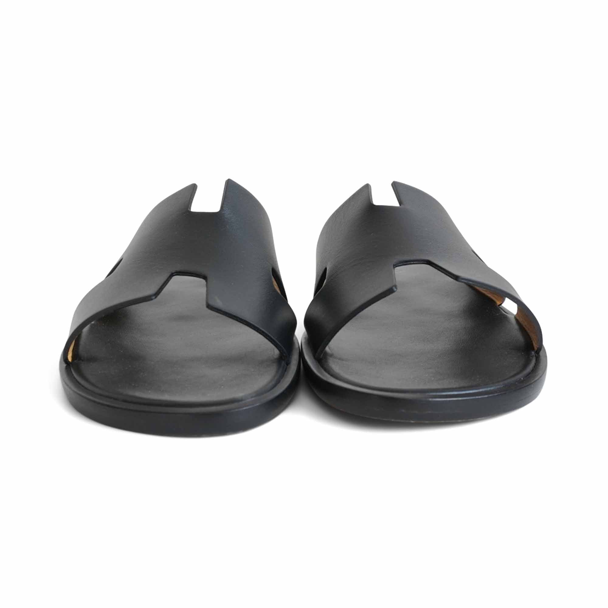 Hermes 'Izmir' sandals in black leather with a signature 'H' strap.