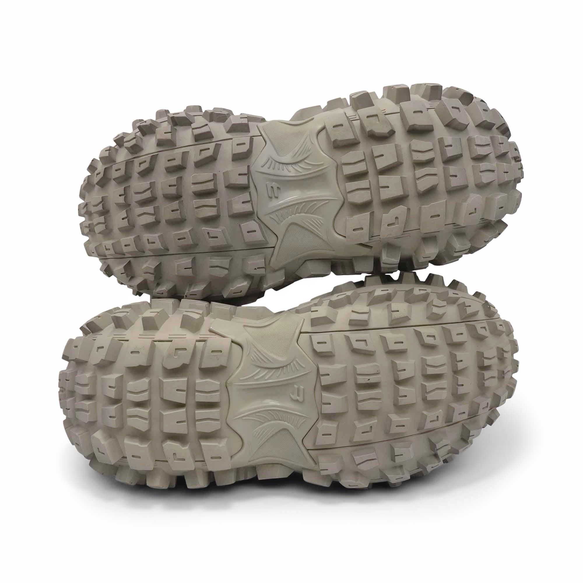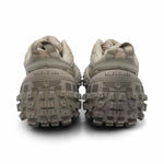 Balenciaga 'Bouncer' paneled, chunky sneakers in light grey mesh and rubber. Features exaggerated chunky tractor soles with embossed logo in front and back.