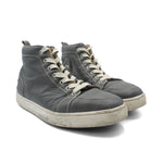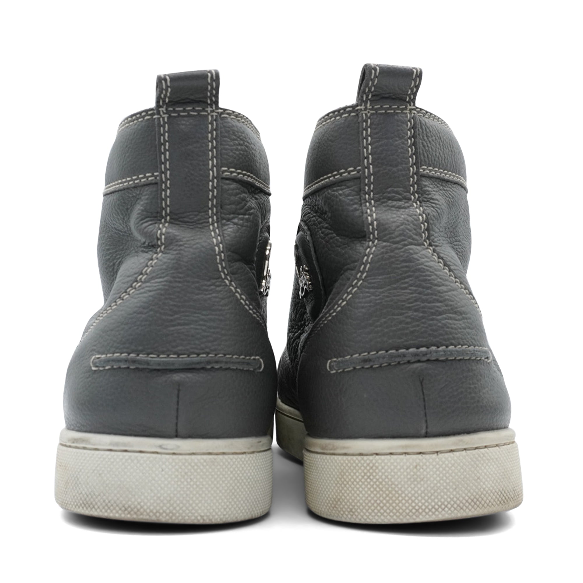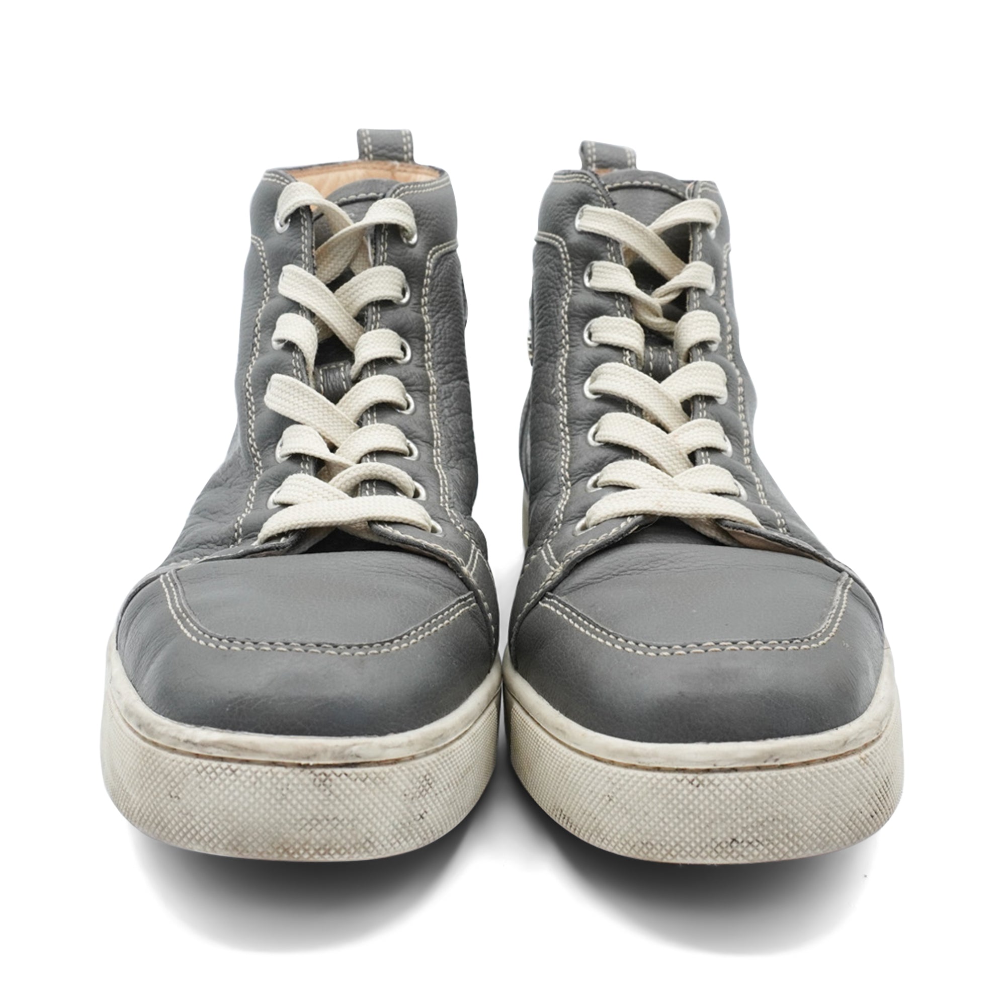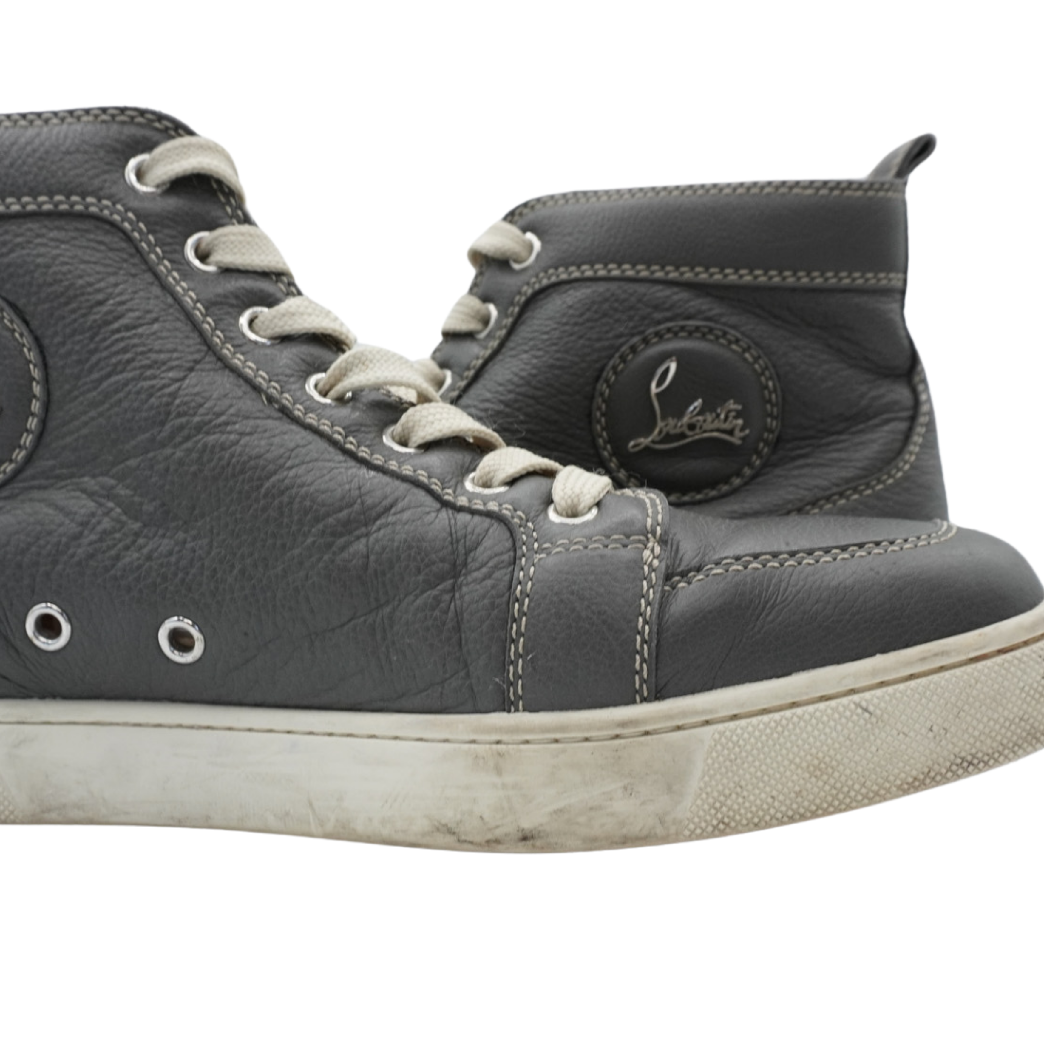 Christian Louboutin 'Rantus Orlato' high-top sneakers in grey leather with white stitching, silver patch logo on the inner heel and grey flat laces.