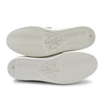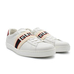 Gucci 'Ace' low top sneakers in white with red heel details. Features logo in black and red on a cream elastic band across the top of shoe.