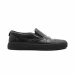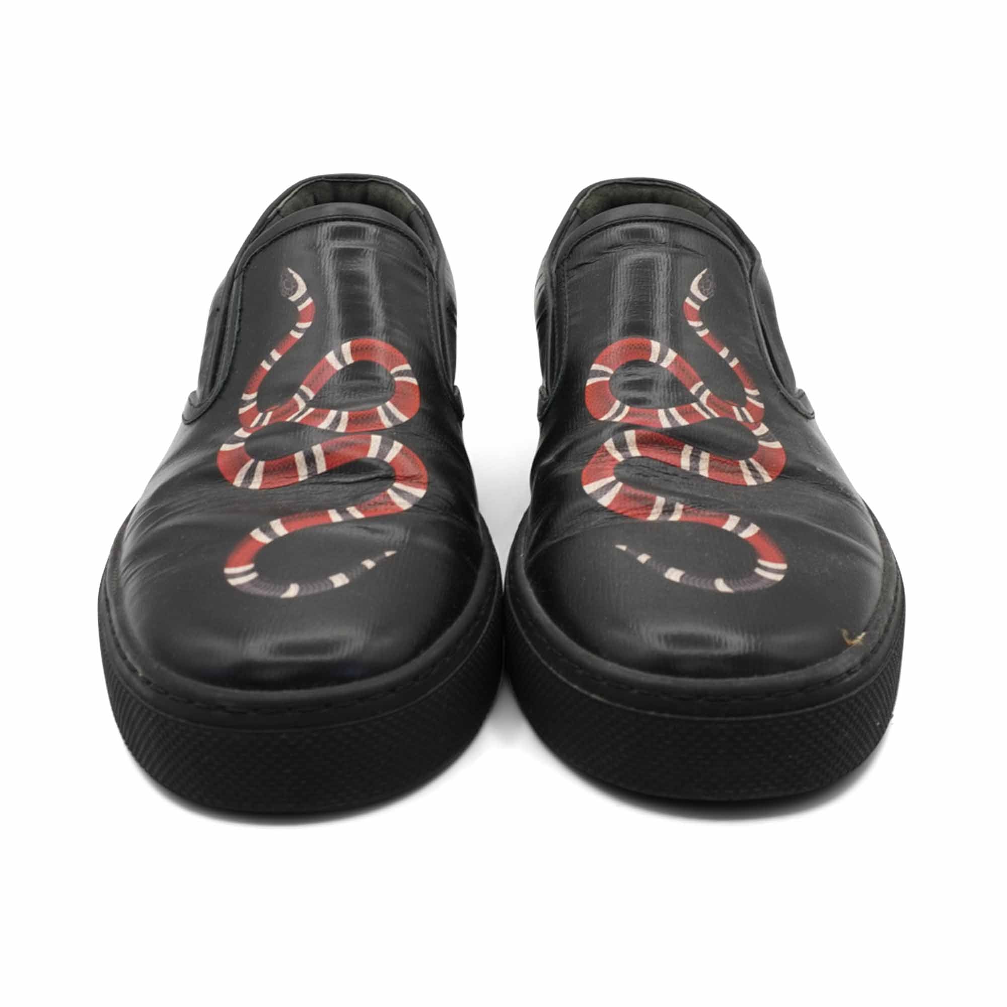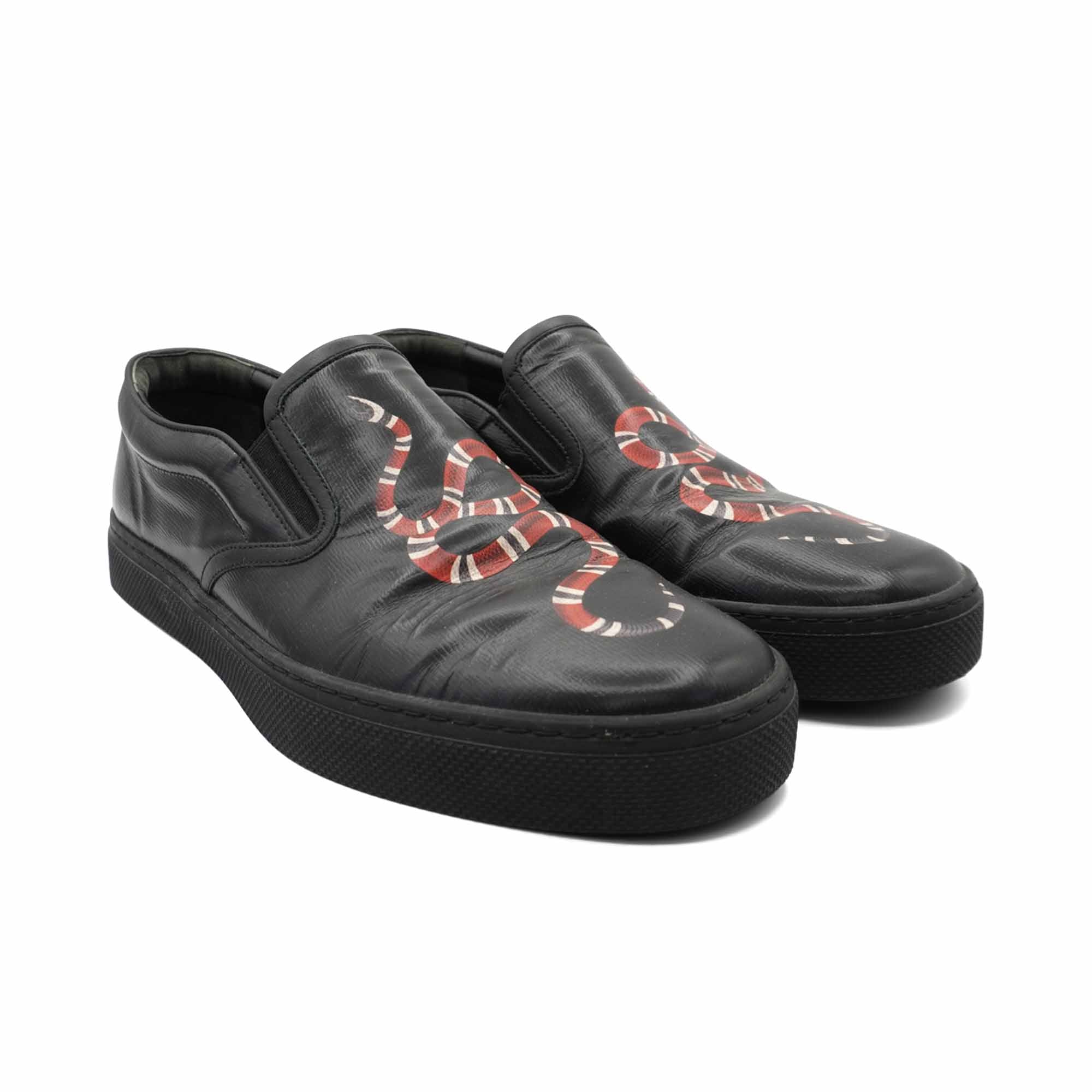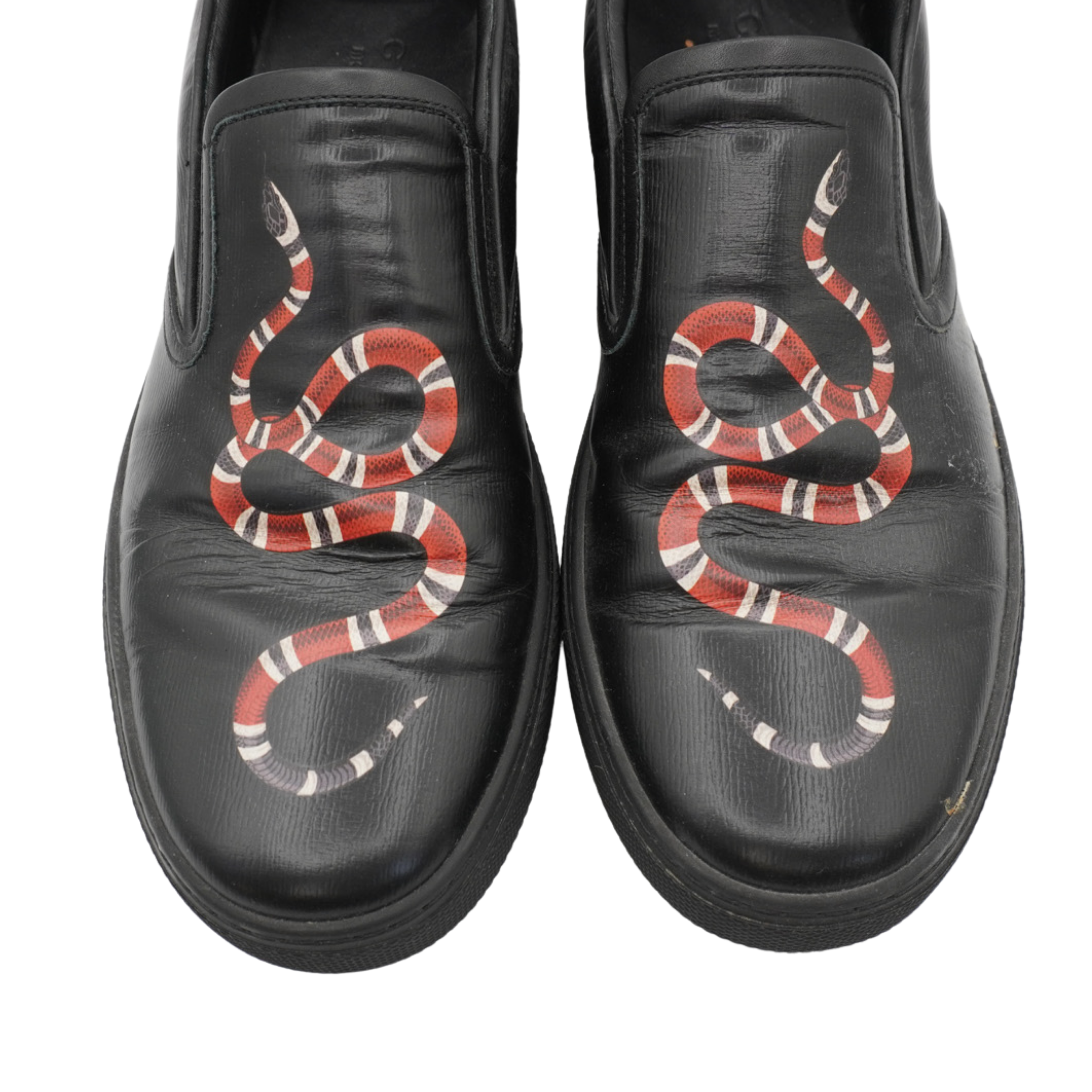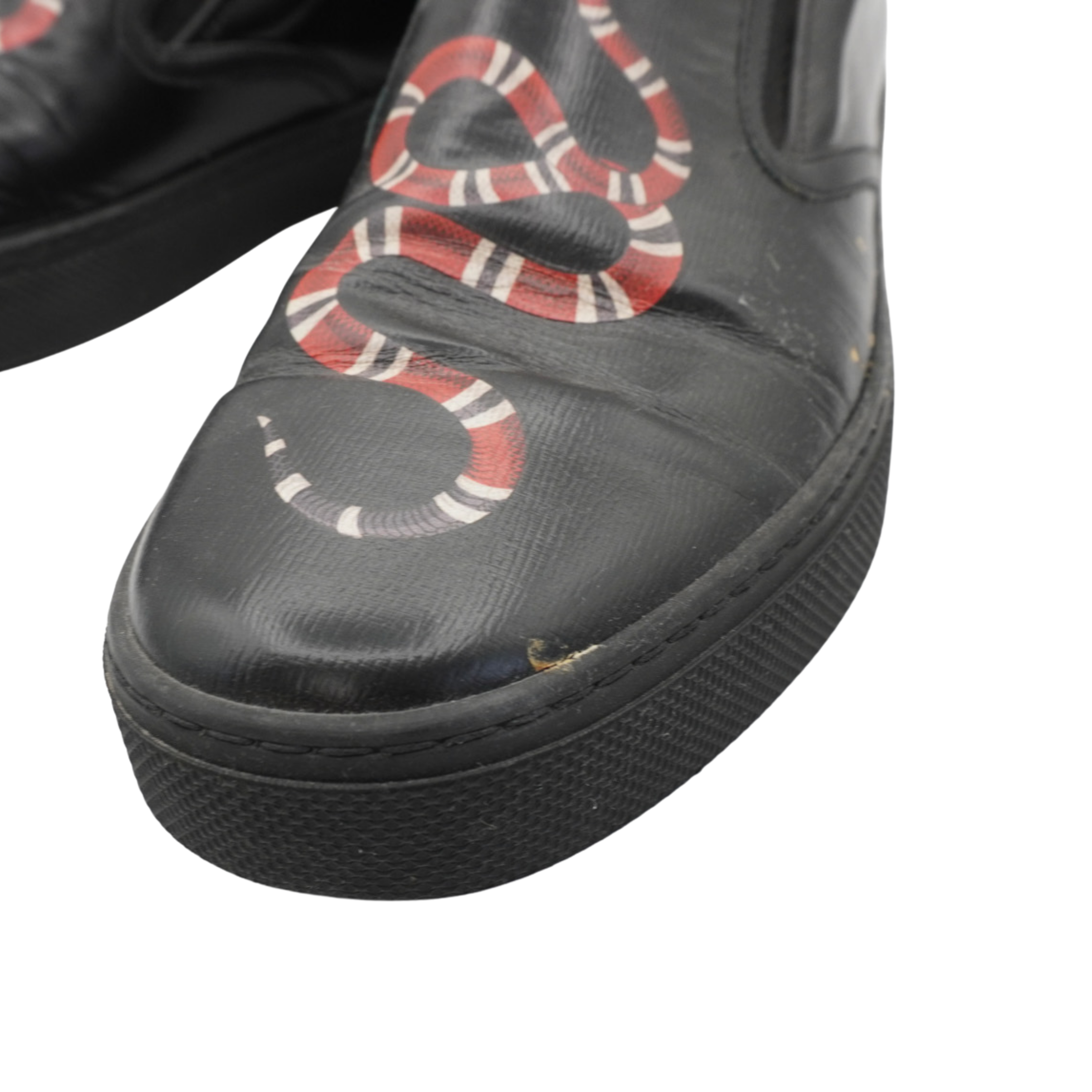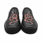 Gucci 'Dublin' slip-on sneakers in black leather with a red and white painted snake graphic on the front and a tonal sole.