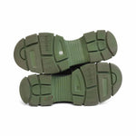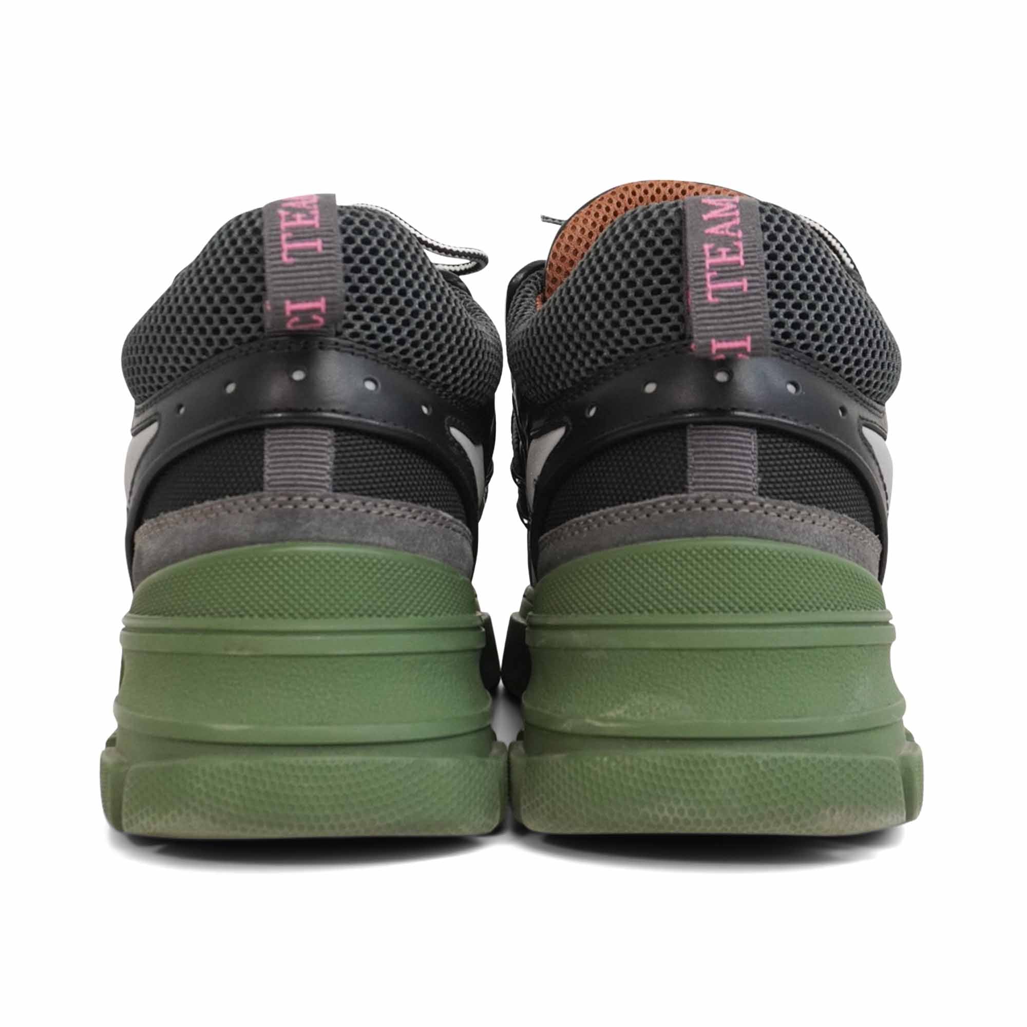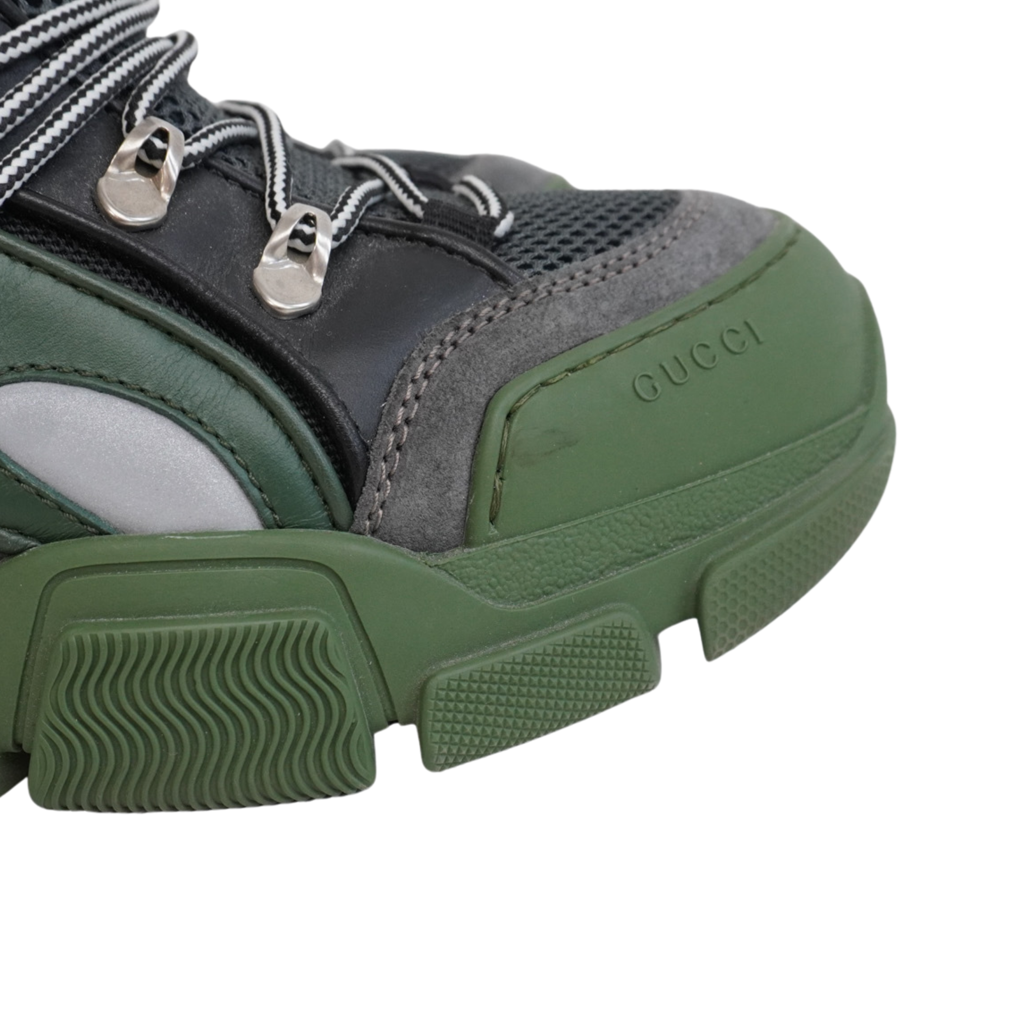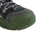 Gucci 'Flashtrek' hiking boot style sneakers in grey and black mesh and suede with chunky, army green sole. Features a caramel interior, black and white laces with silver hooked eyelets, black and green leather details and a yellow rubber logo on tongue.