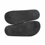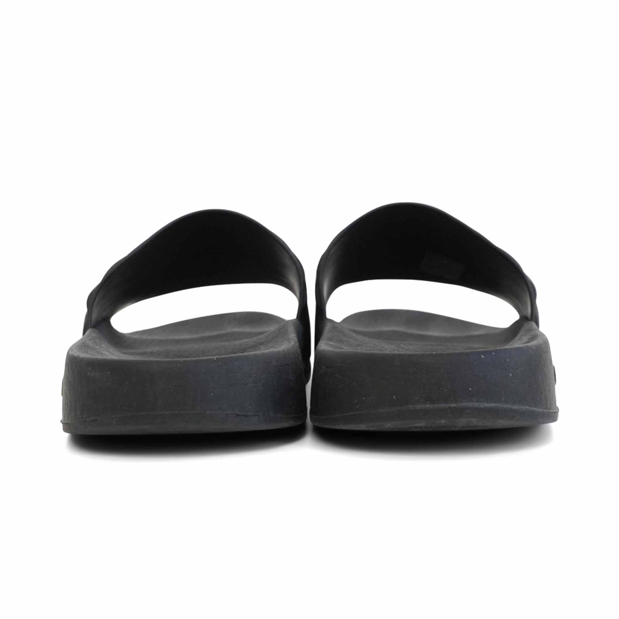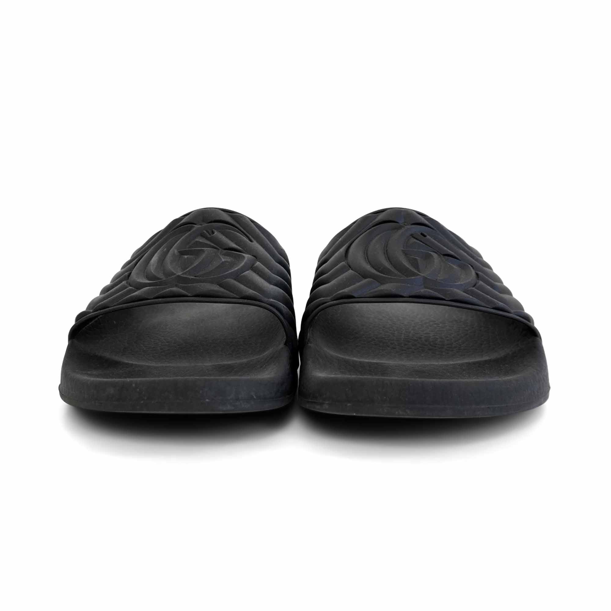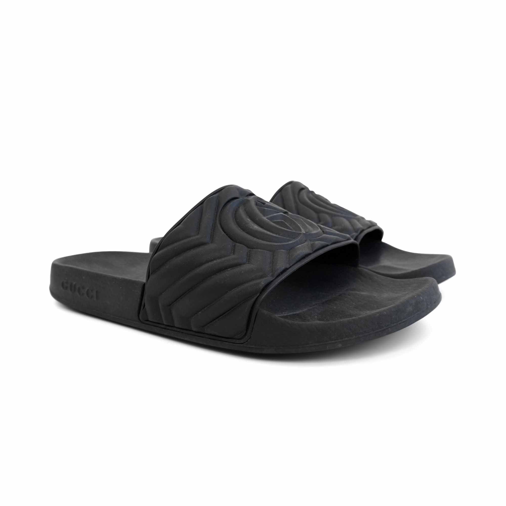 Gucci pool slides in black rubber with a chevron textured strap and an embossed 'GG' logo.