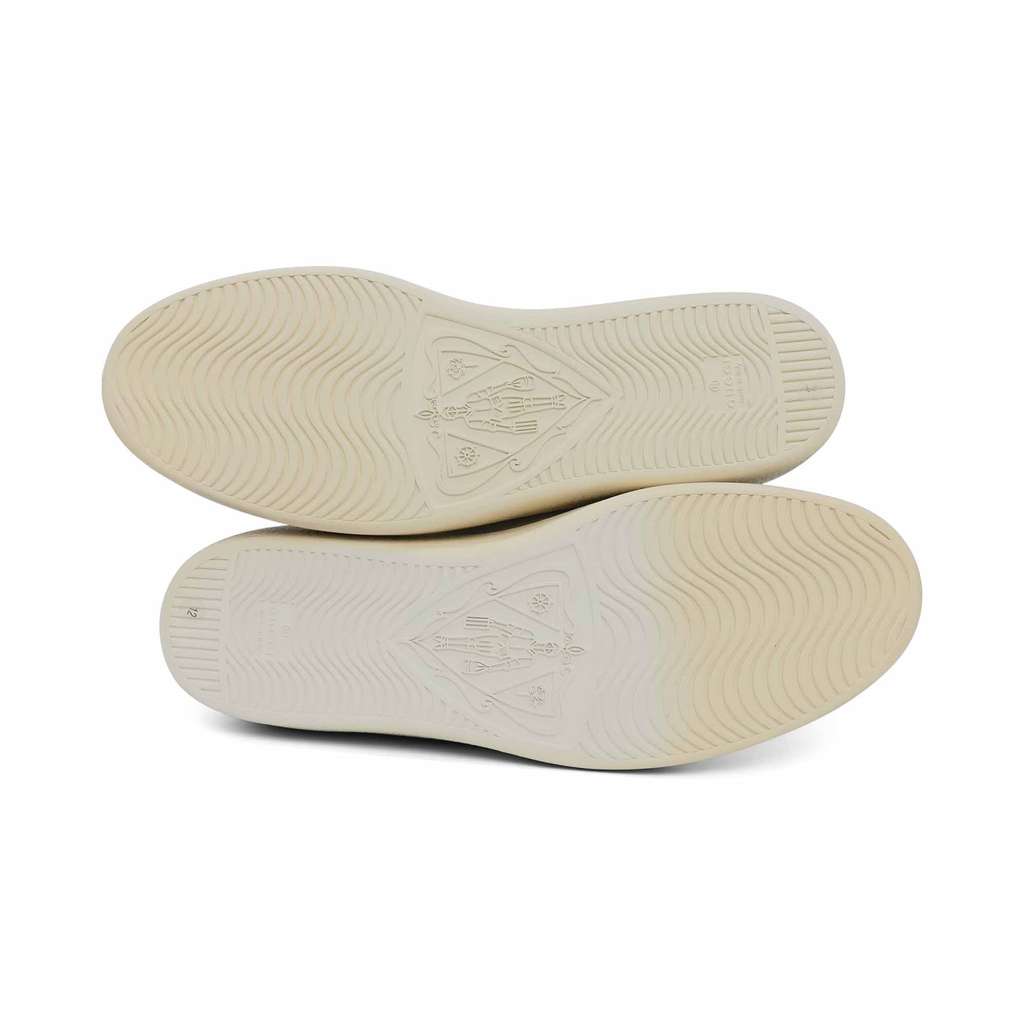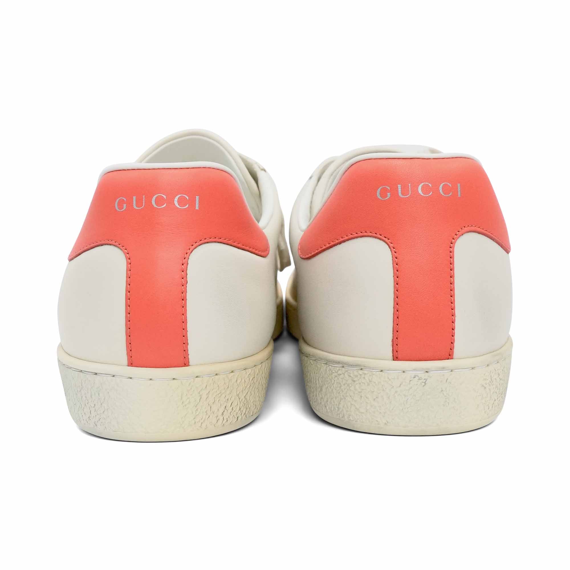 Gucci x Disney low top cream leather sneakers with Mickey Mouse graphic on side and orange heel with Gucci logo.