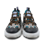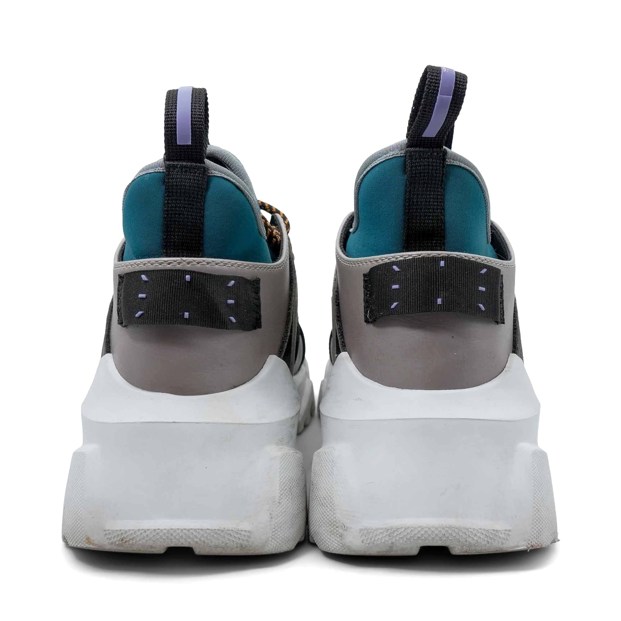 McQ by McQueen 'Orbyt 2.0' sneakers in beige leather and teal neoprene with rope laces, black canvas straps throughout, and a chunky white rubber sole.