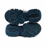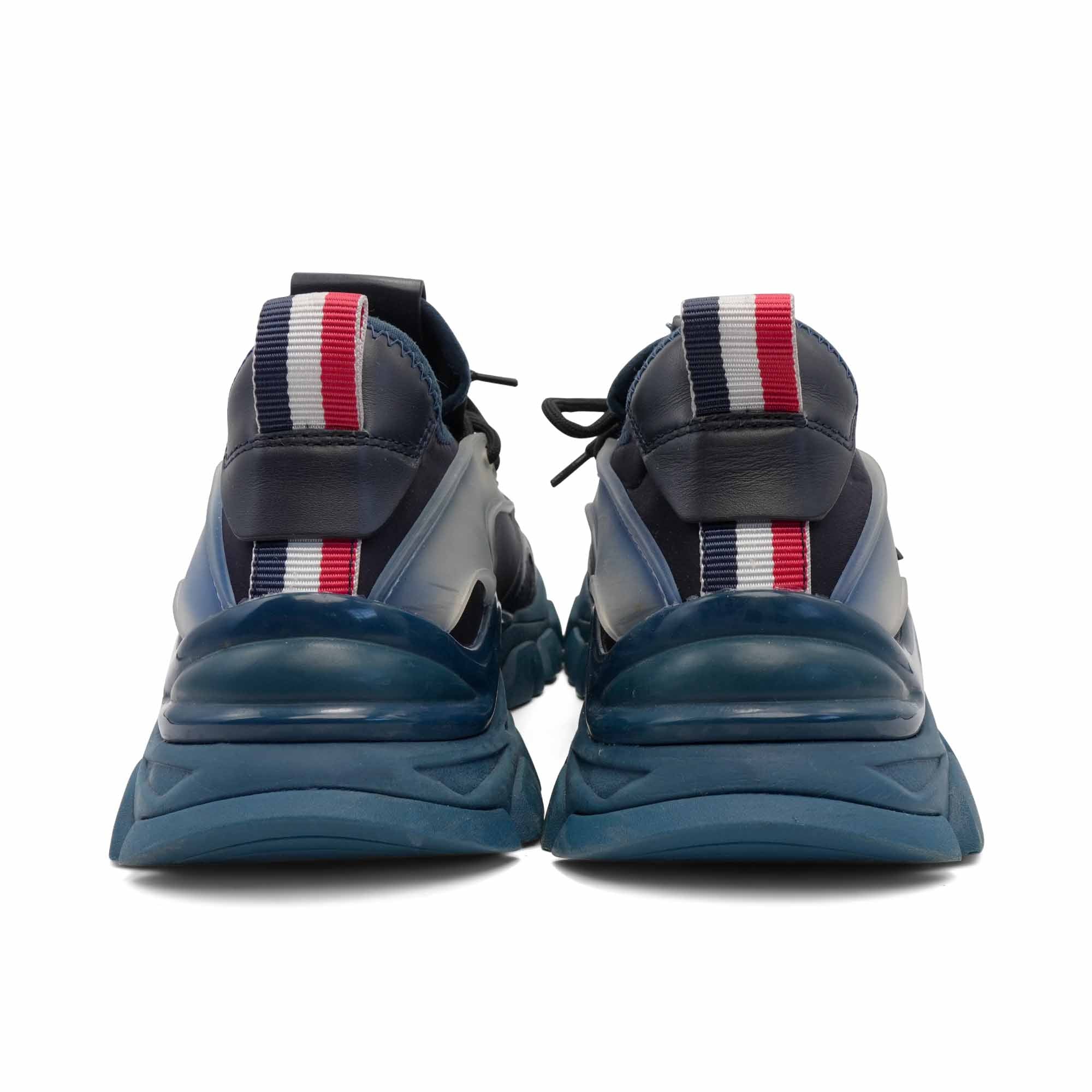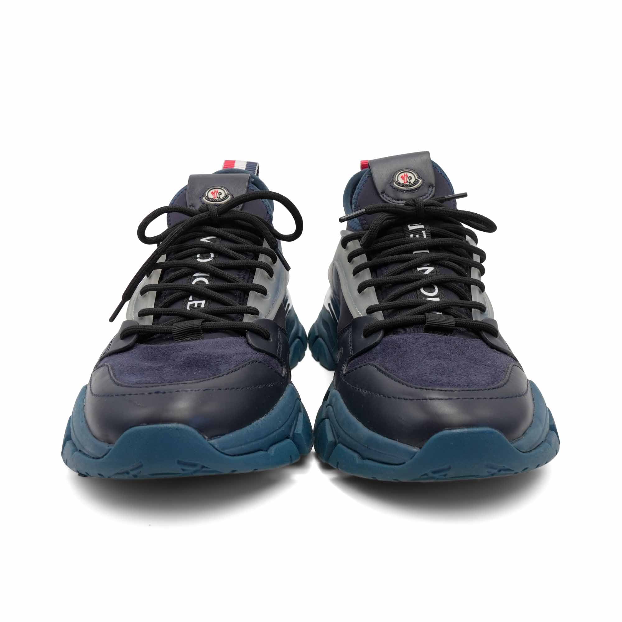 Moncler 'Trevor' sneakers in navy neoprene with leather and suede trim throughout, black laces, a striped ribbon detail at the heel, and a chunky blue sole.