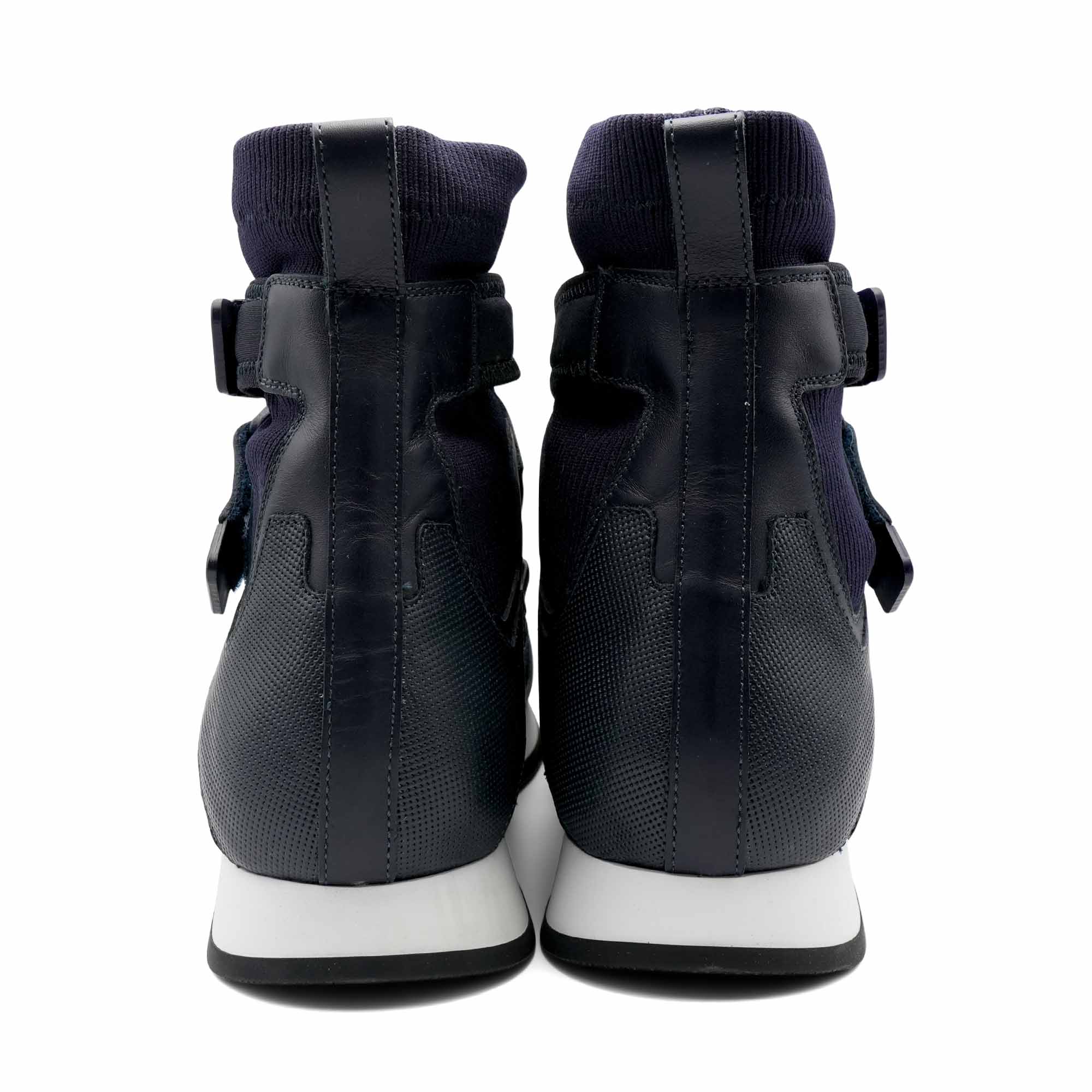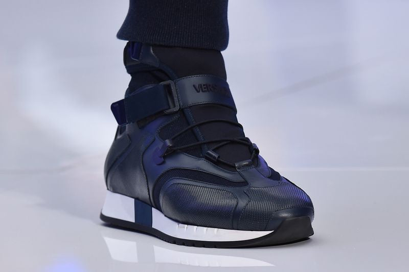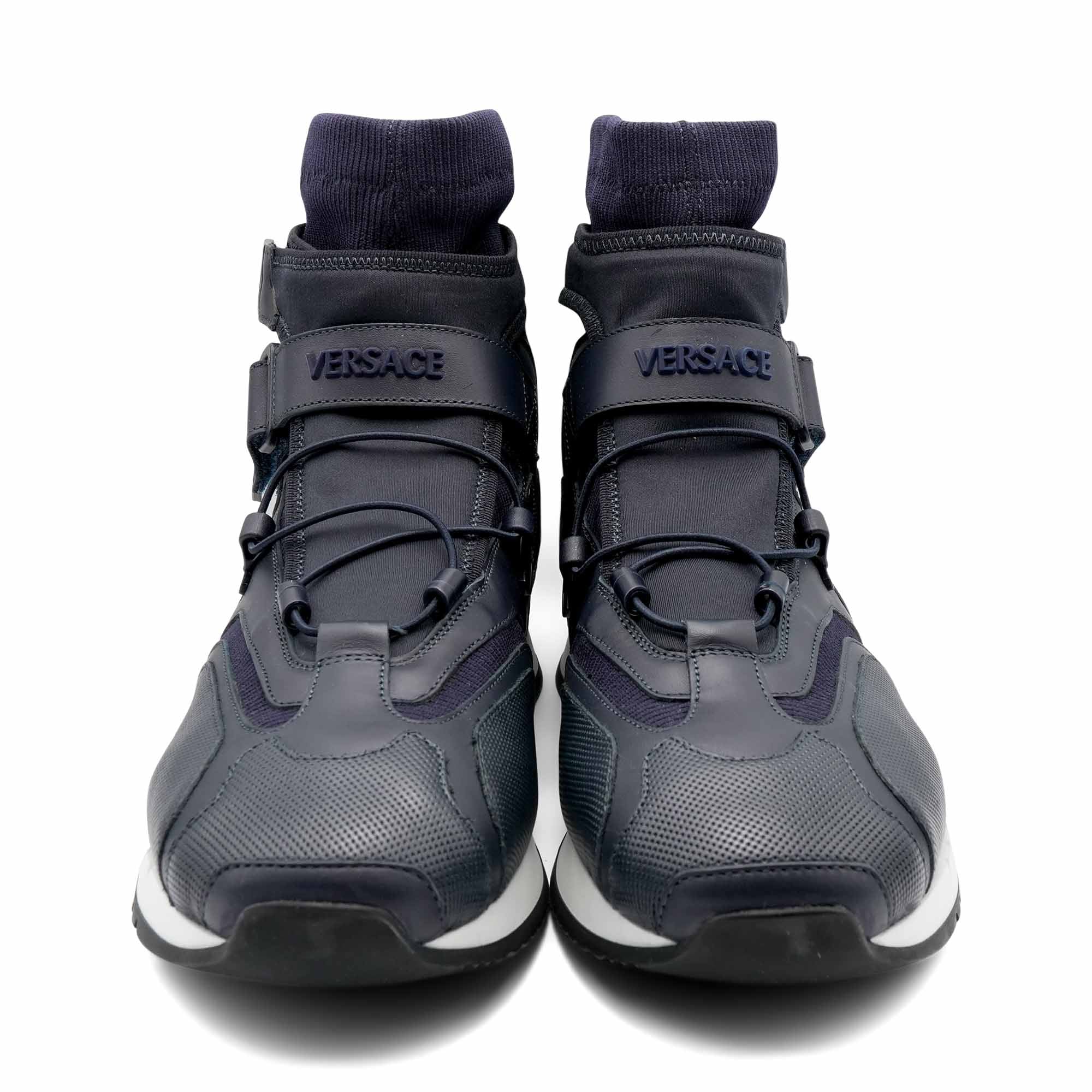 Versace high-top sneakers in navy leather with tonal knit panelling throughout, velcro straps at the ankle, and a tonal embossed logo across the front. As seen on the Fall 2016 runway.