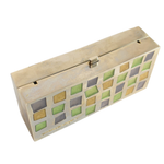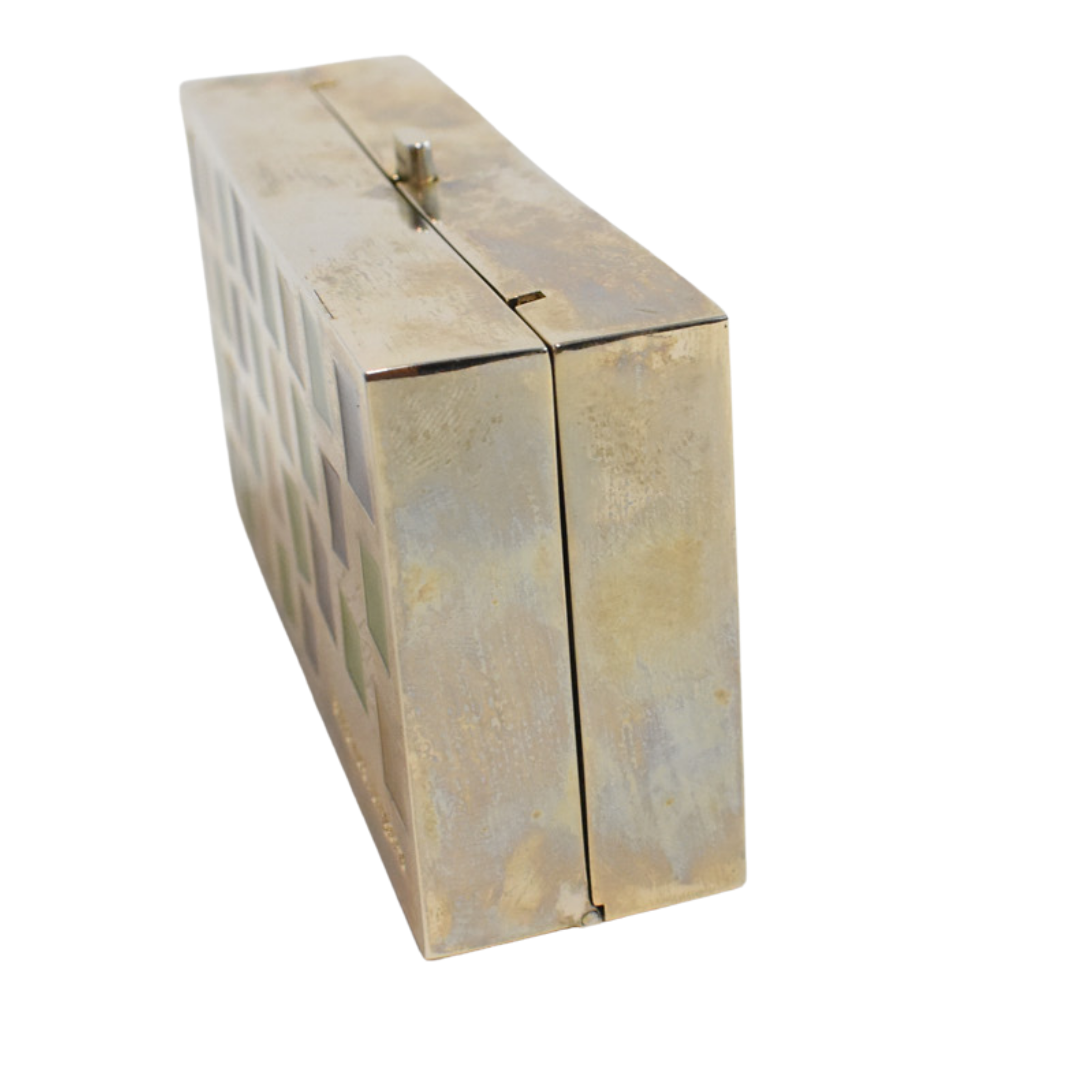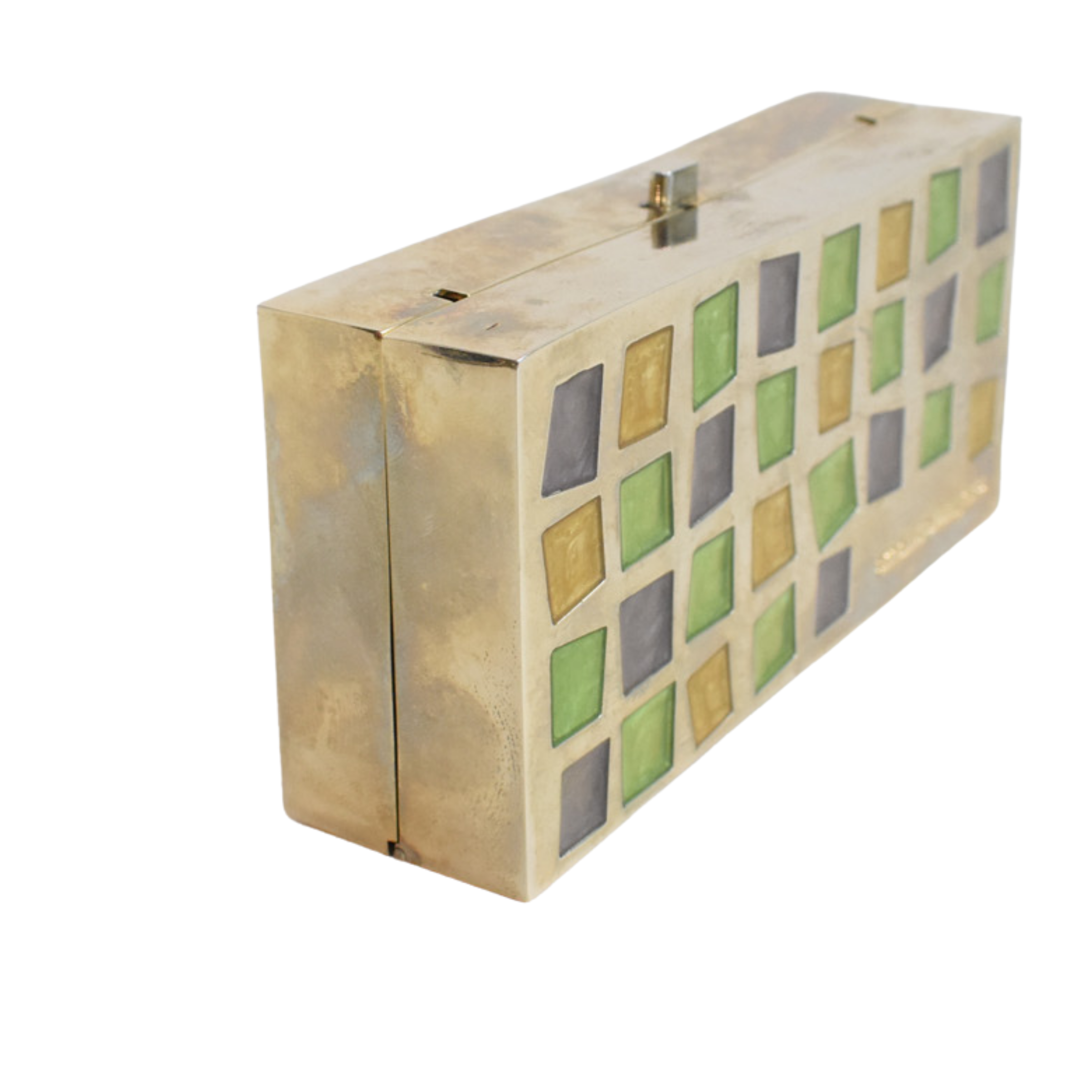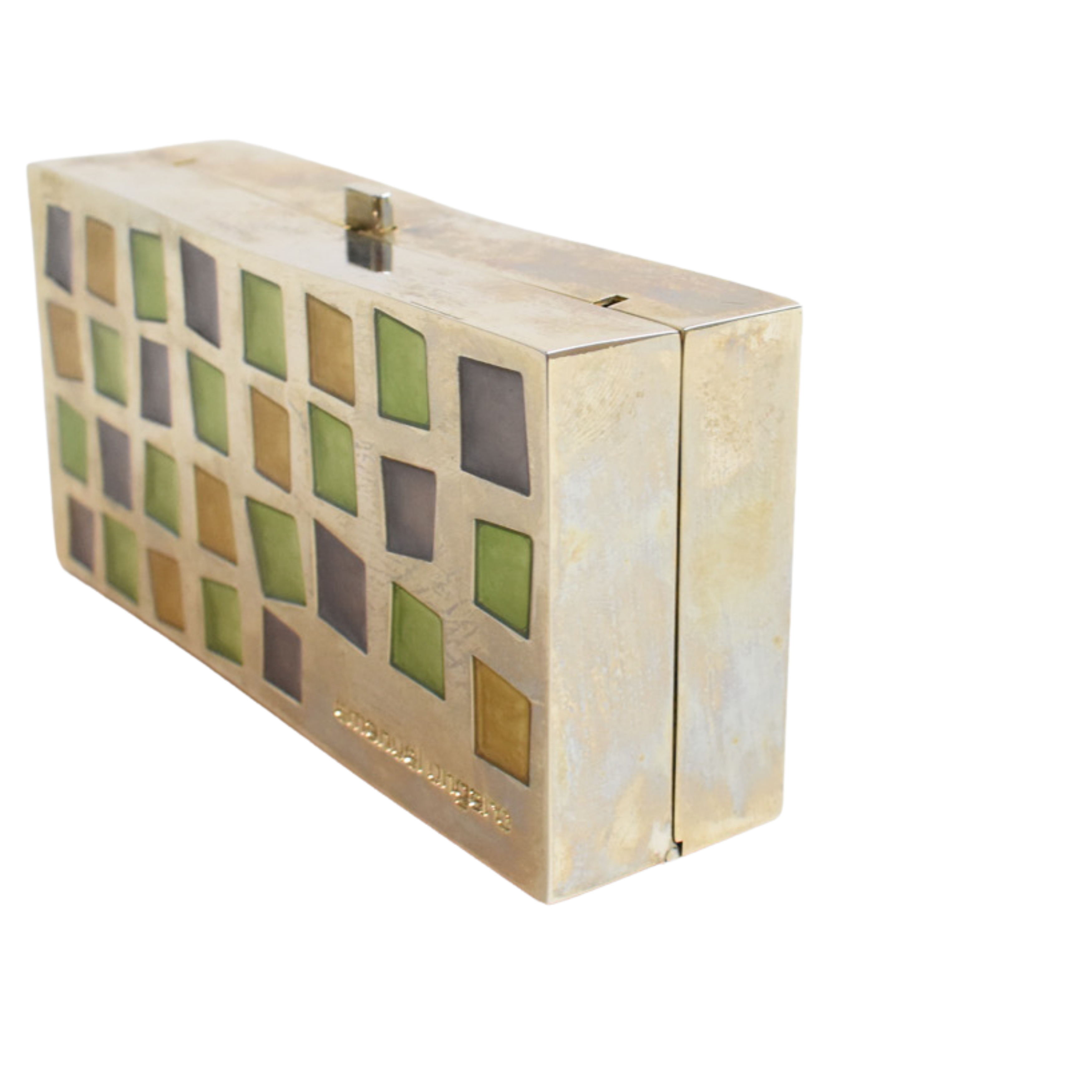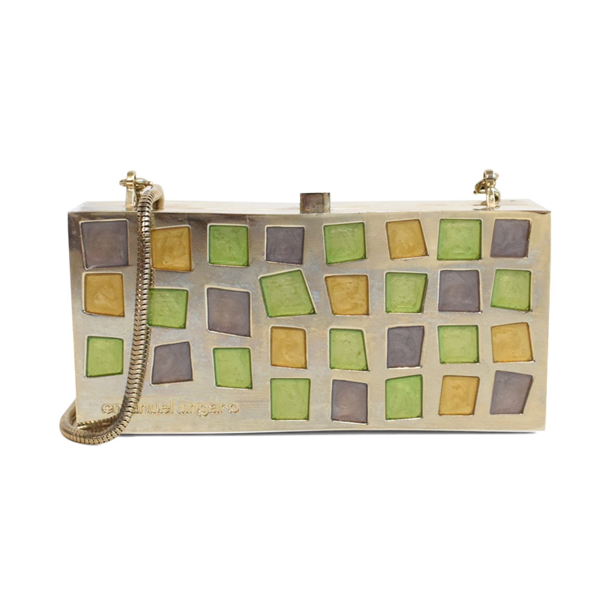 Emanuel Ungaro 'Fuxia' mini clutch bag in silver metal with an inlayed green, purple, and yellow stone design, a push-lock opening at the top, a gold leather interior lining, and a removable chain crossbody strap.