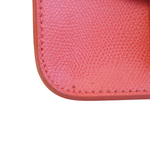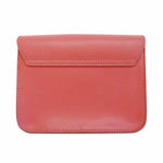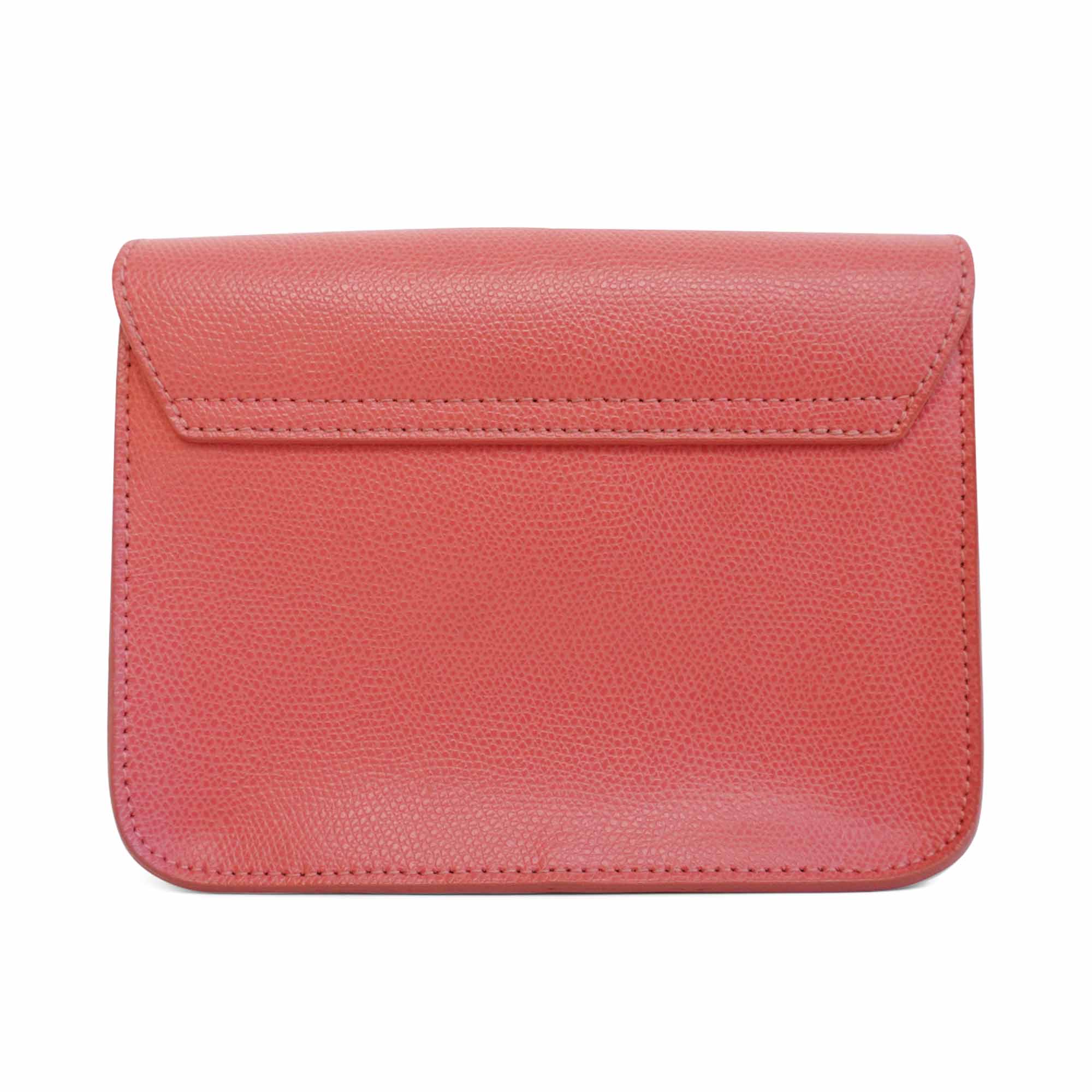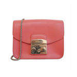 Furla 'Metropolis' mini crossbody bag in pink grained leather with a removable chain crossbody strap, a front flap opening with a push lock closure in gold hardware, and a canvas lined interior with a slip pocket.